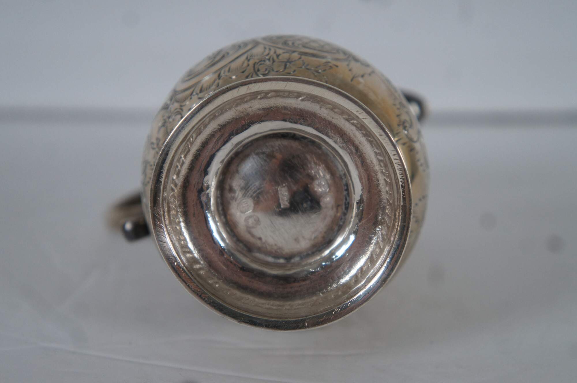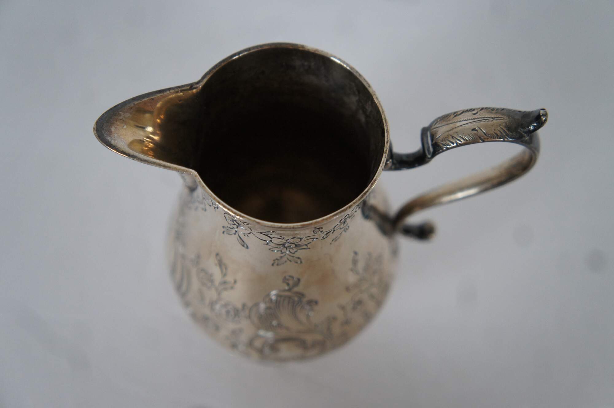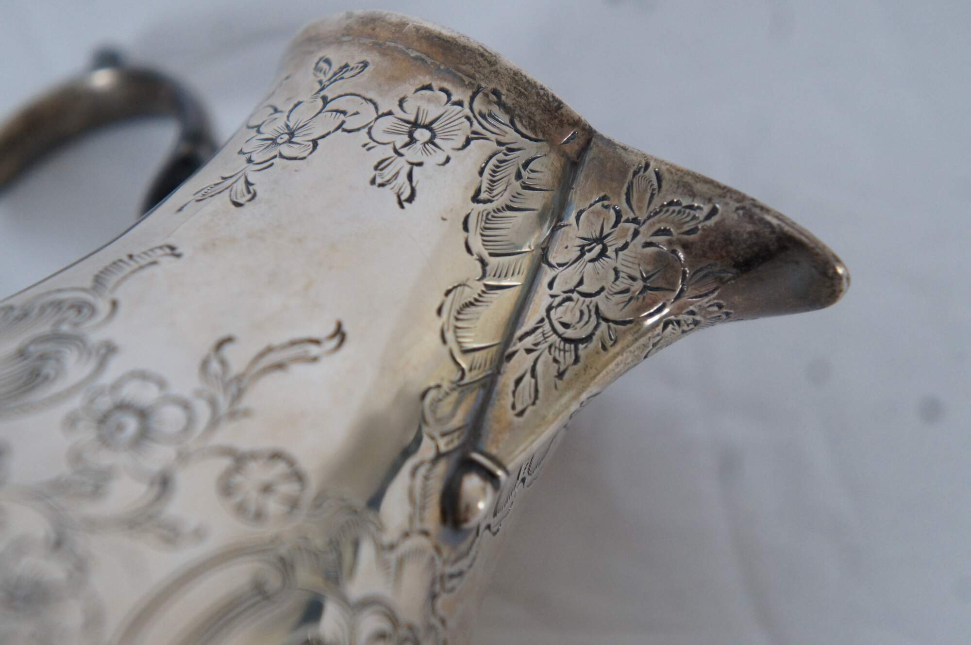 Antique Victorian era sterling silver cream pitcher, etched with swirling leaves and flowers. Monogrammed with the initial R. Made in 1851 by London silversmith George Frederick Pinnell.