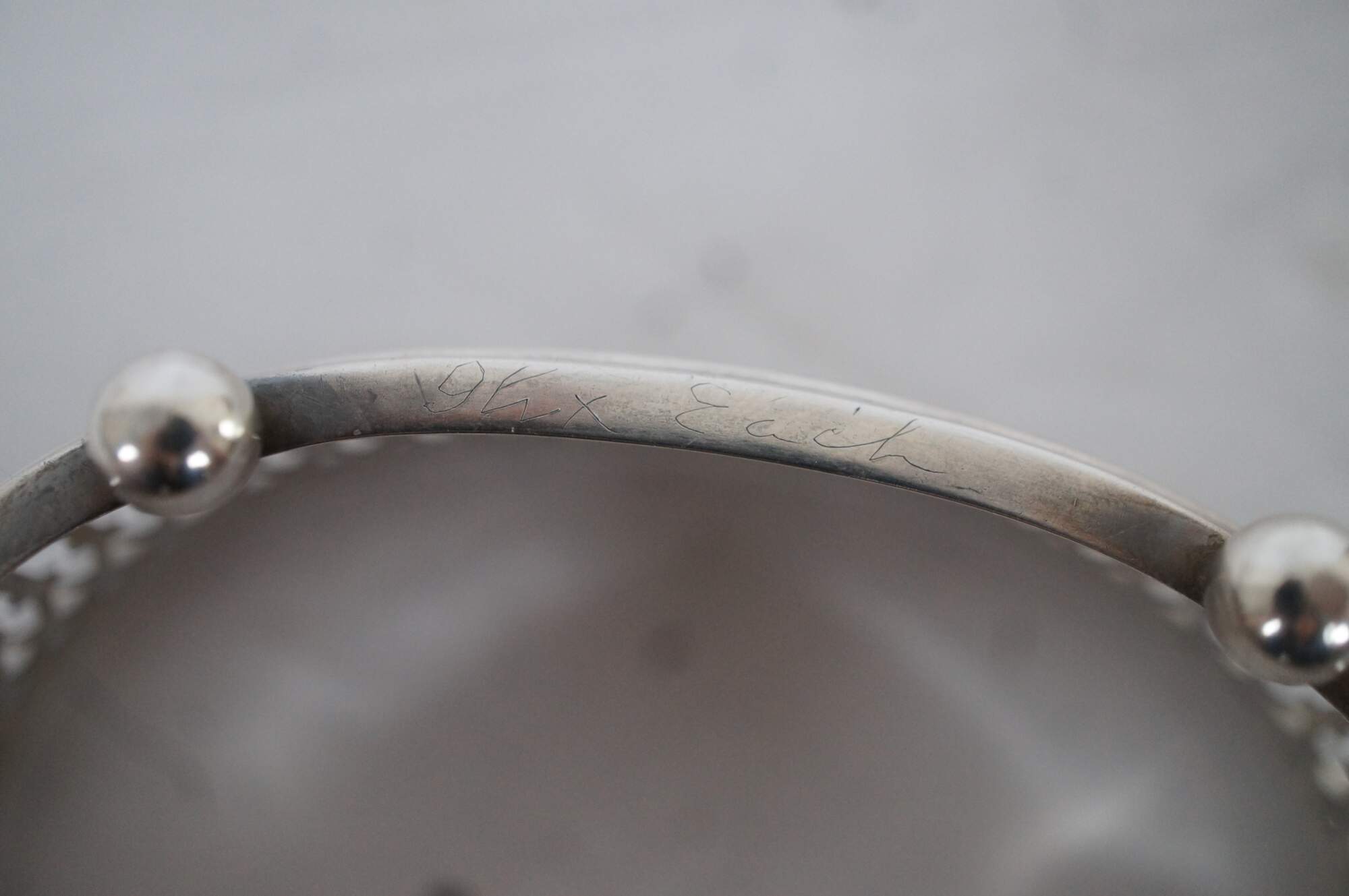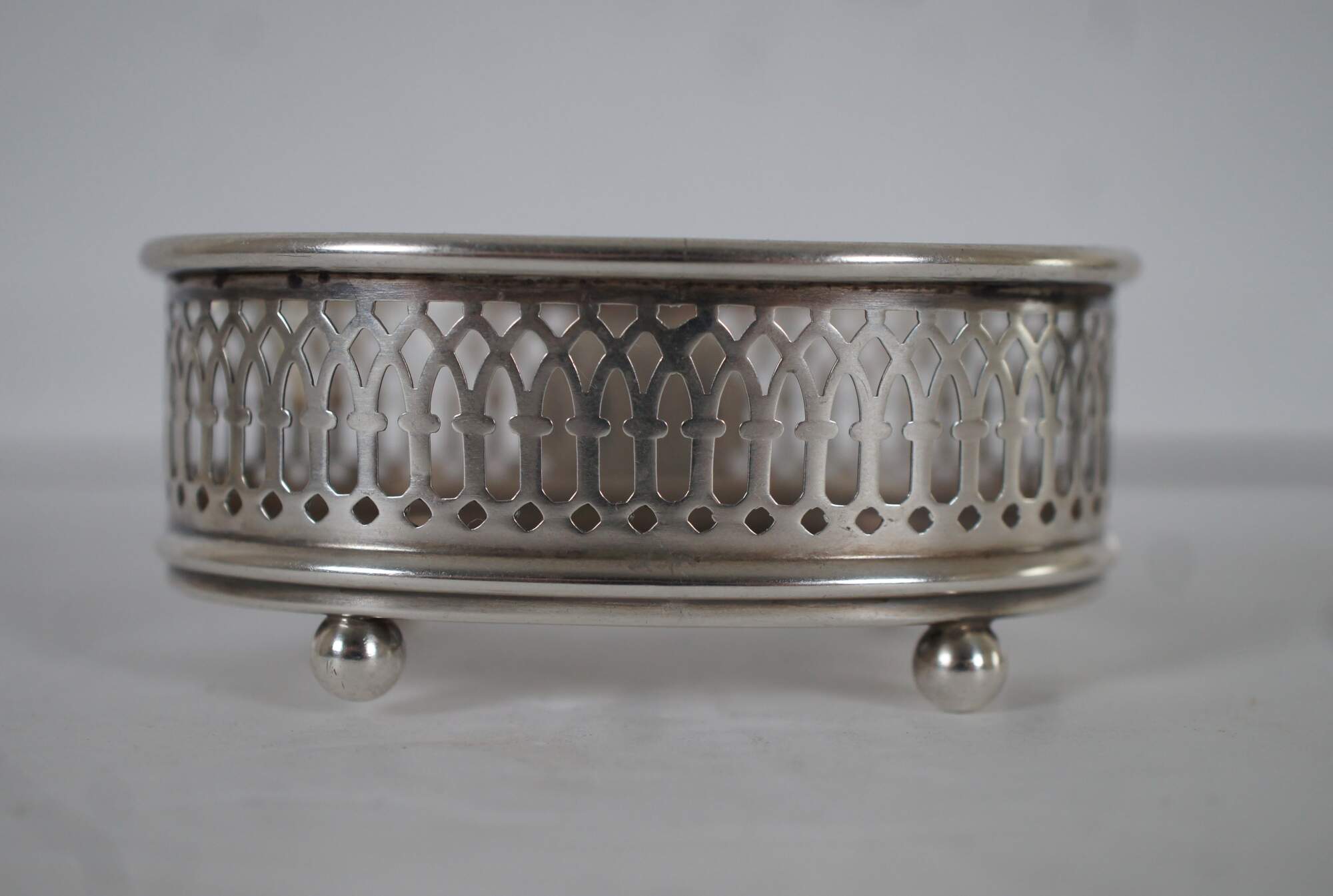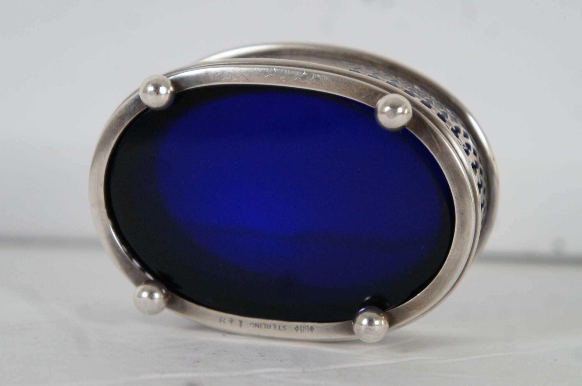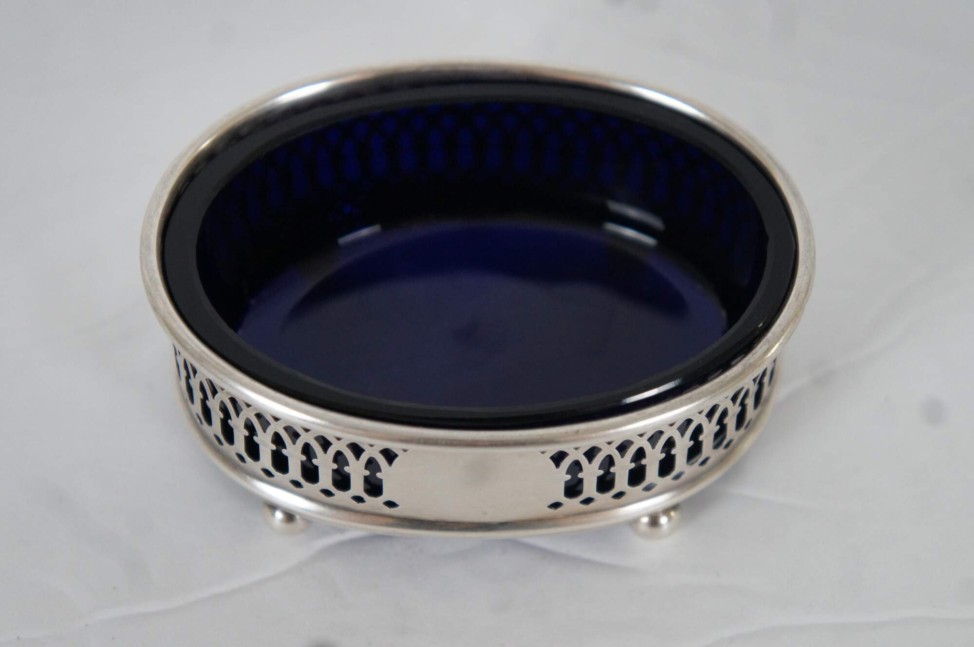 Early 20th century George A. Henckel & Company number 149 sterling silver oval salt cellar / nut / bonbon dish with pierced sides, space for a monogram, ball feet, and cobalt glass insert.