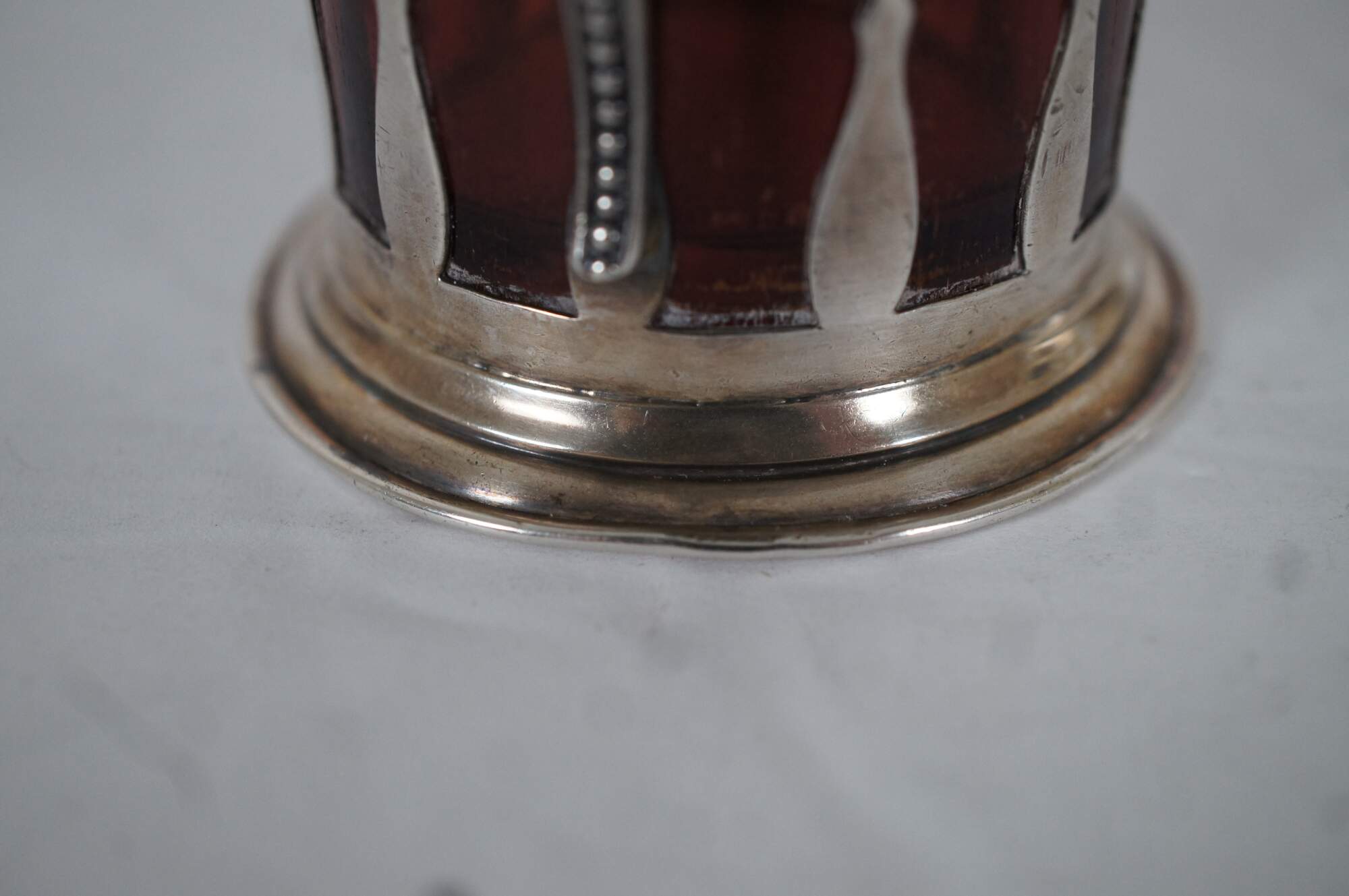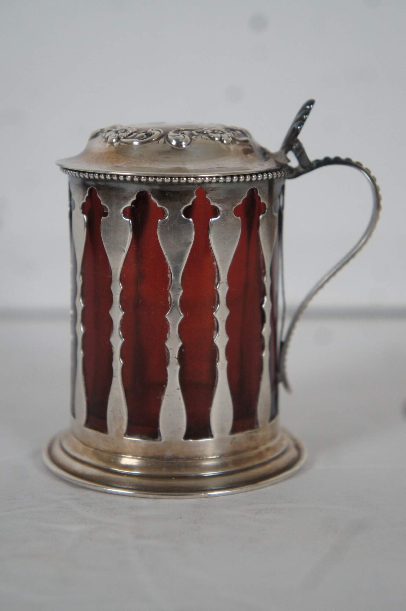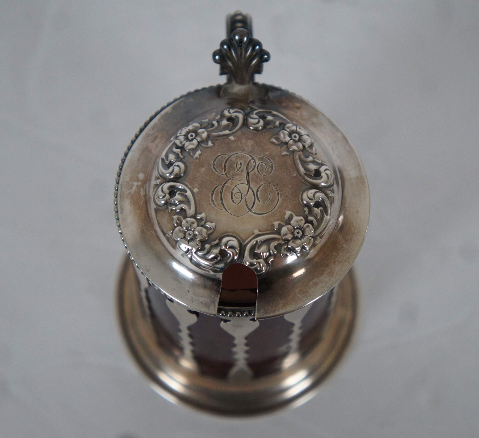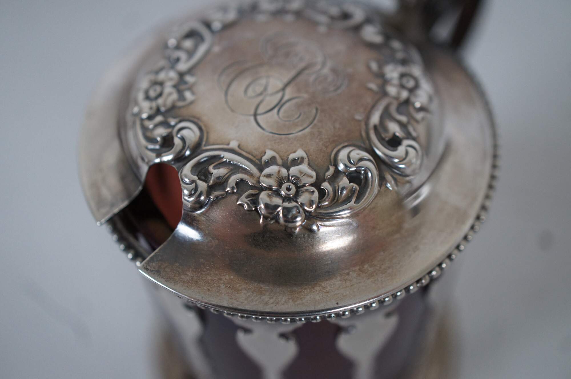Antique number 105 sterling silver Repousse lidded jam / mustard / condiment pot with cutwork pierced sides, floral lid monogrammed with the initials EL, ruby glass insert and clear glass spoon. No brand or makers mark.
