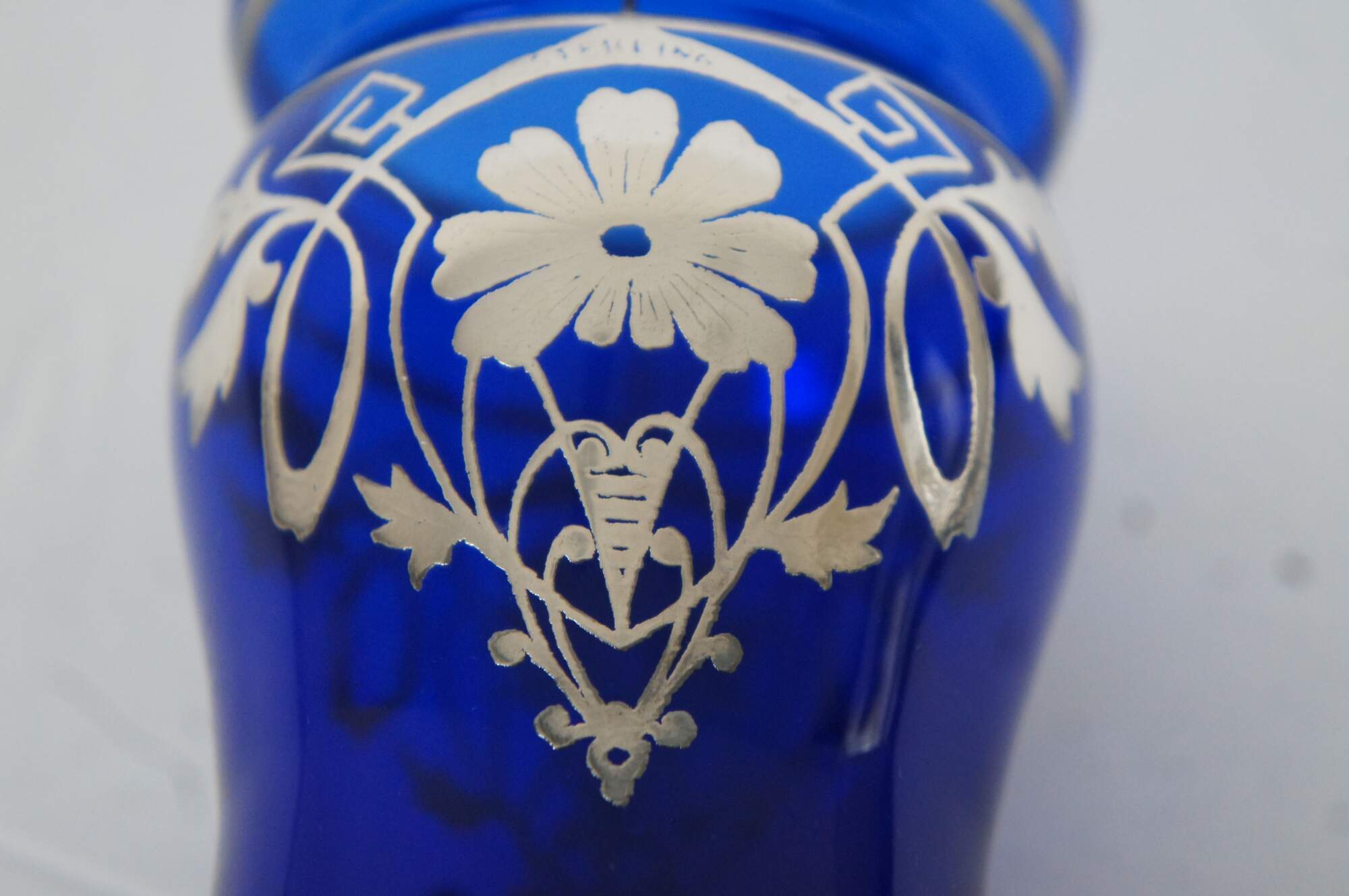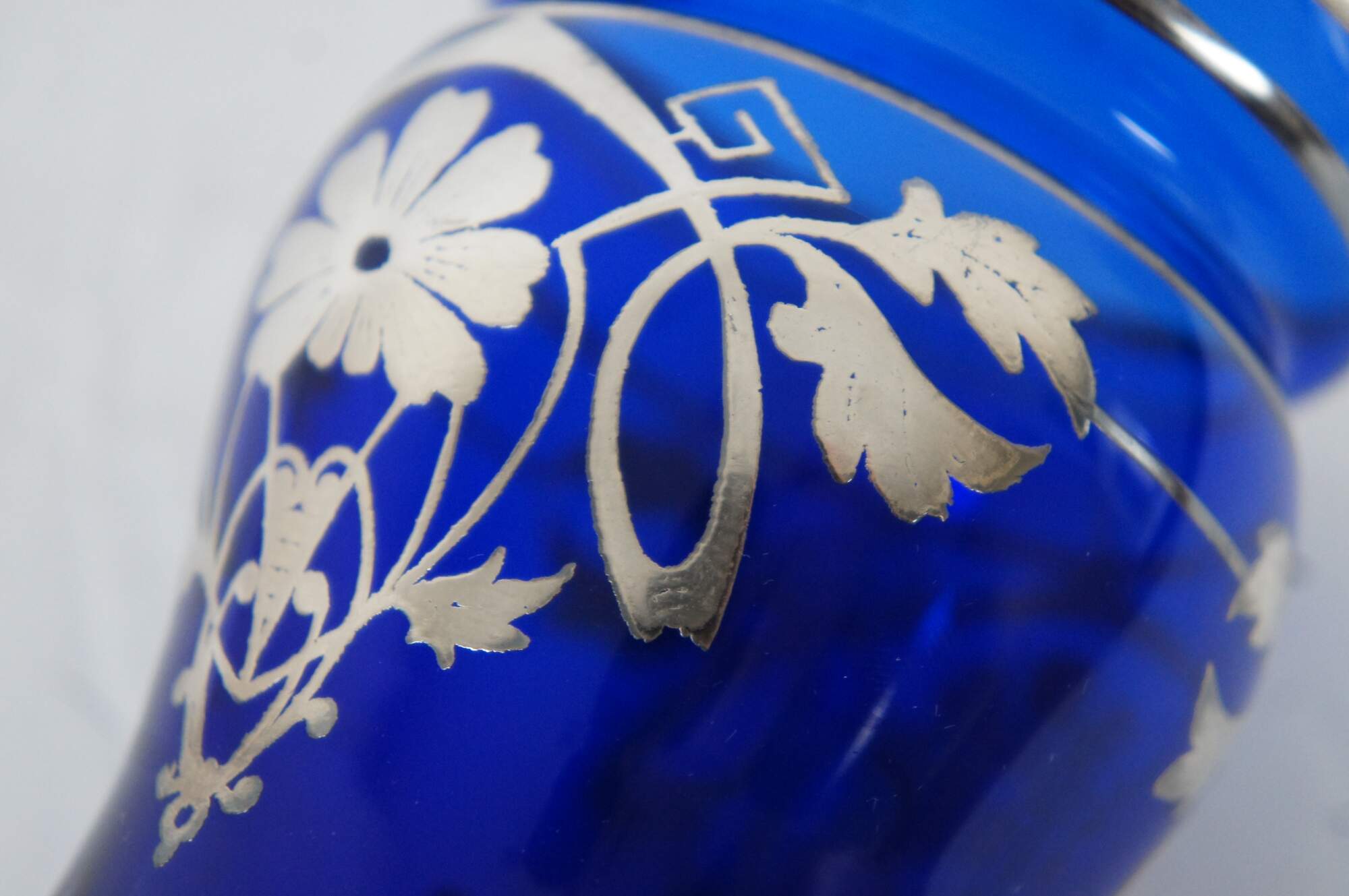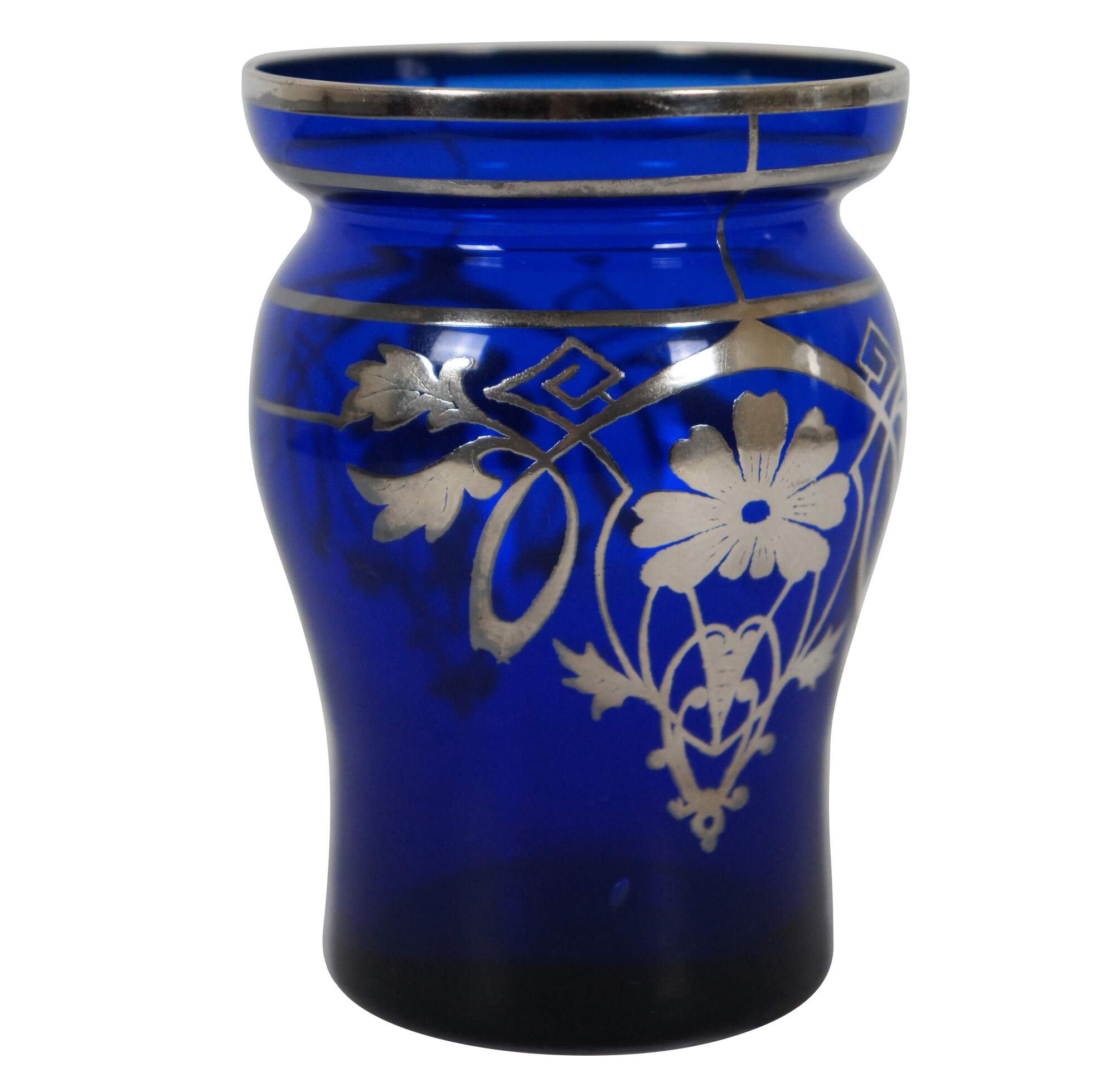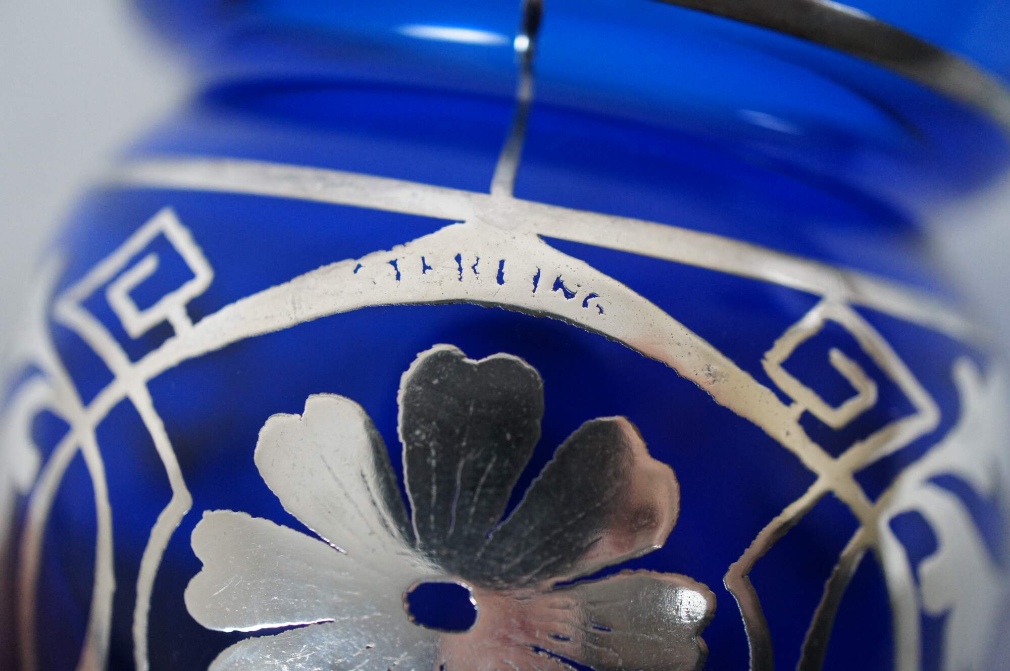Antique art deco cobalt glass vase with sterling silver foliate and floral overlay. No brand or makers mark.