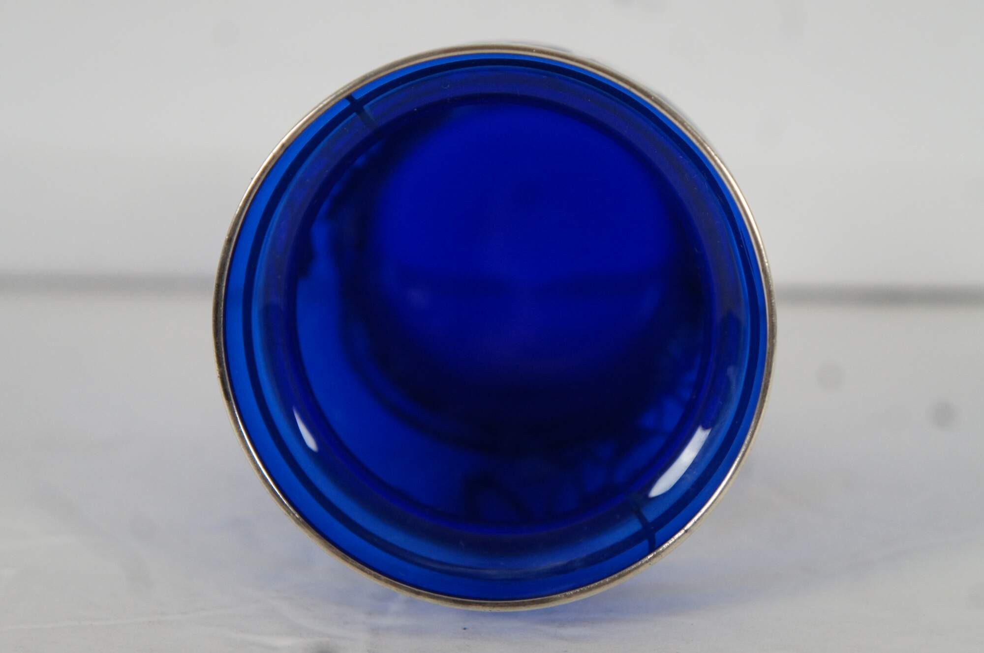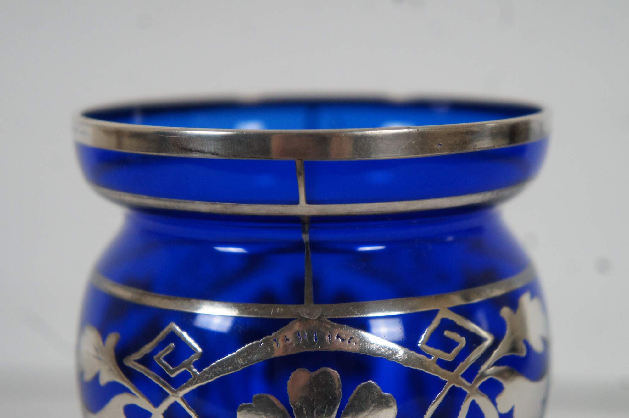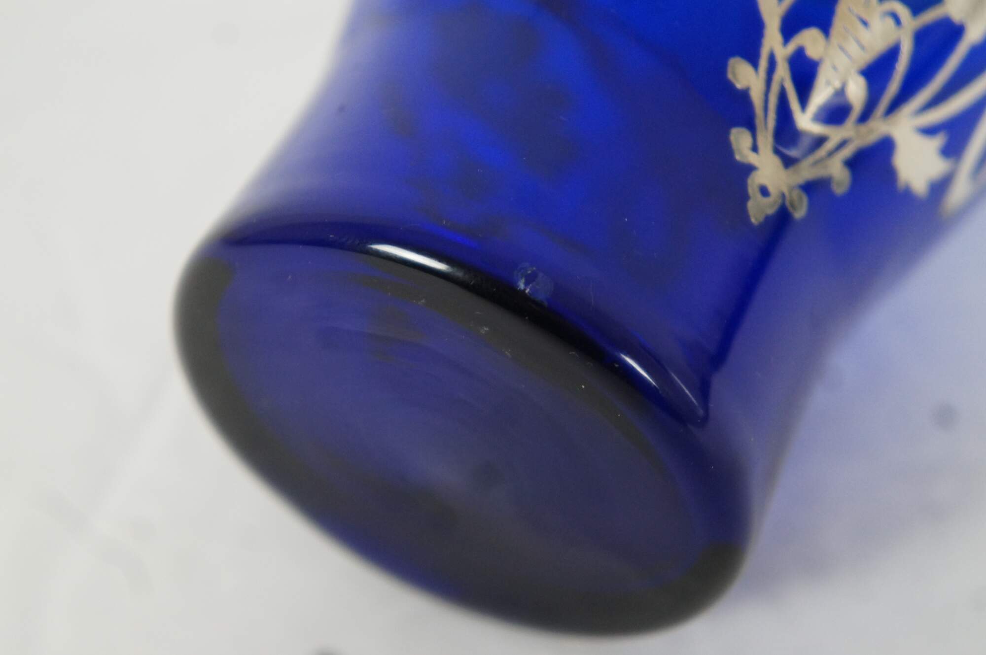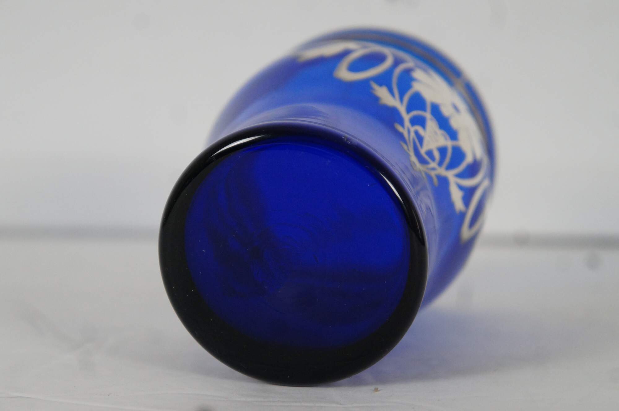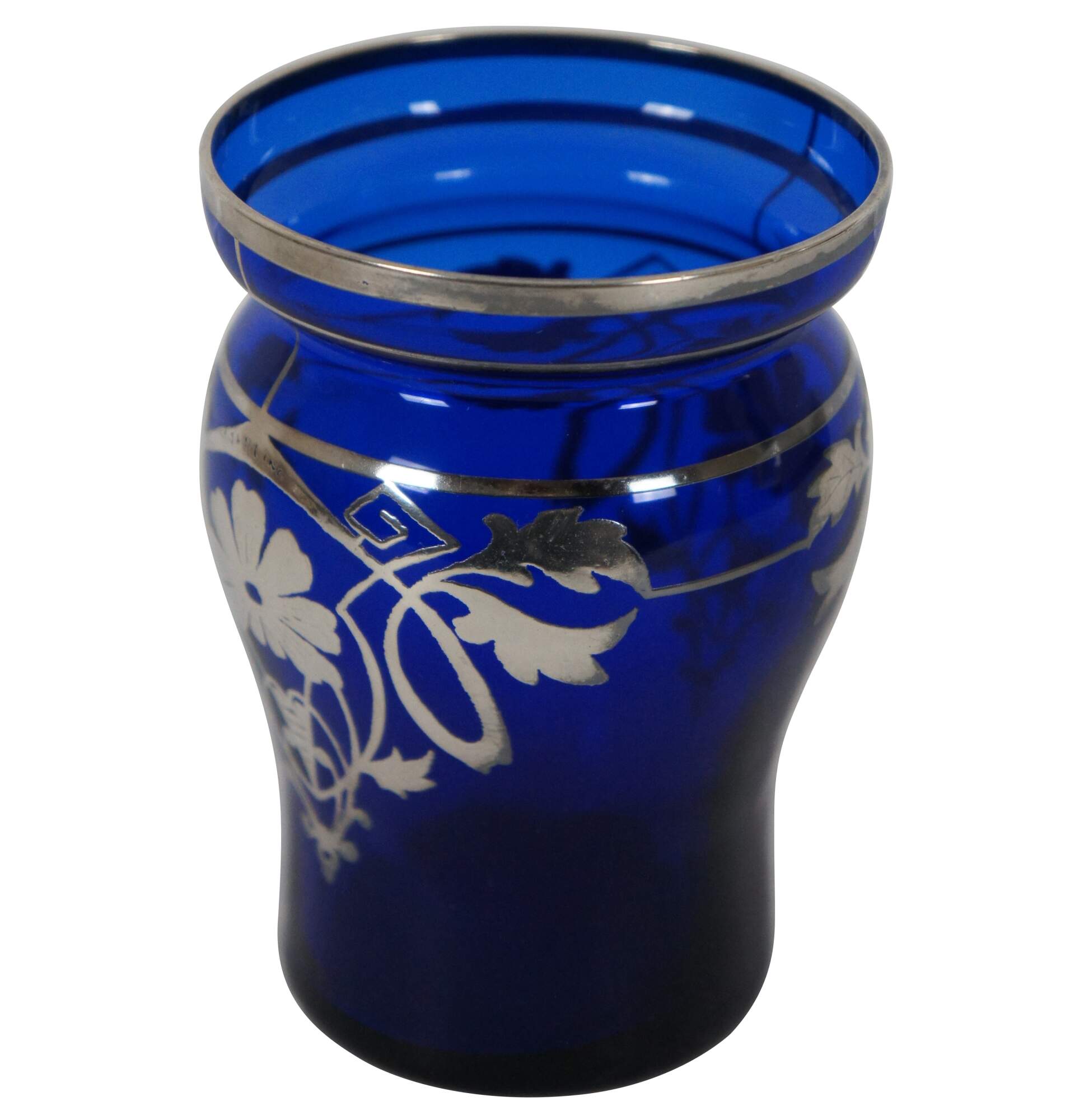 Antique art deco cobalt glass vase with sterling silver foliate and floral overlay. No brand or makers mark.