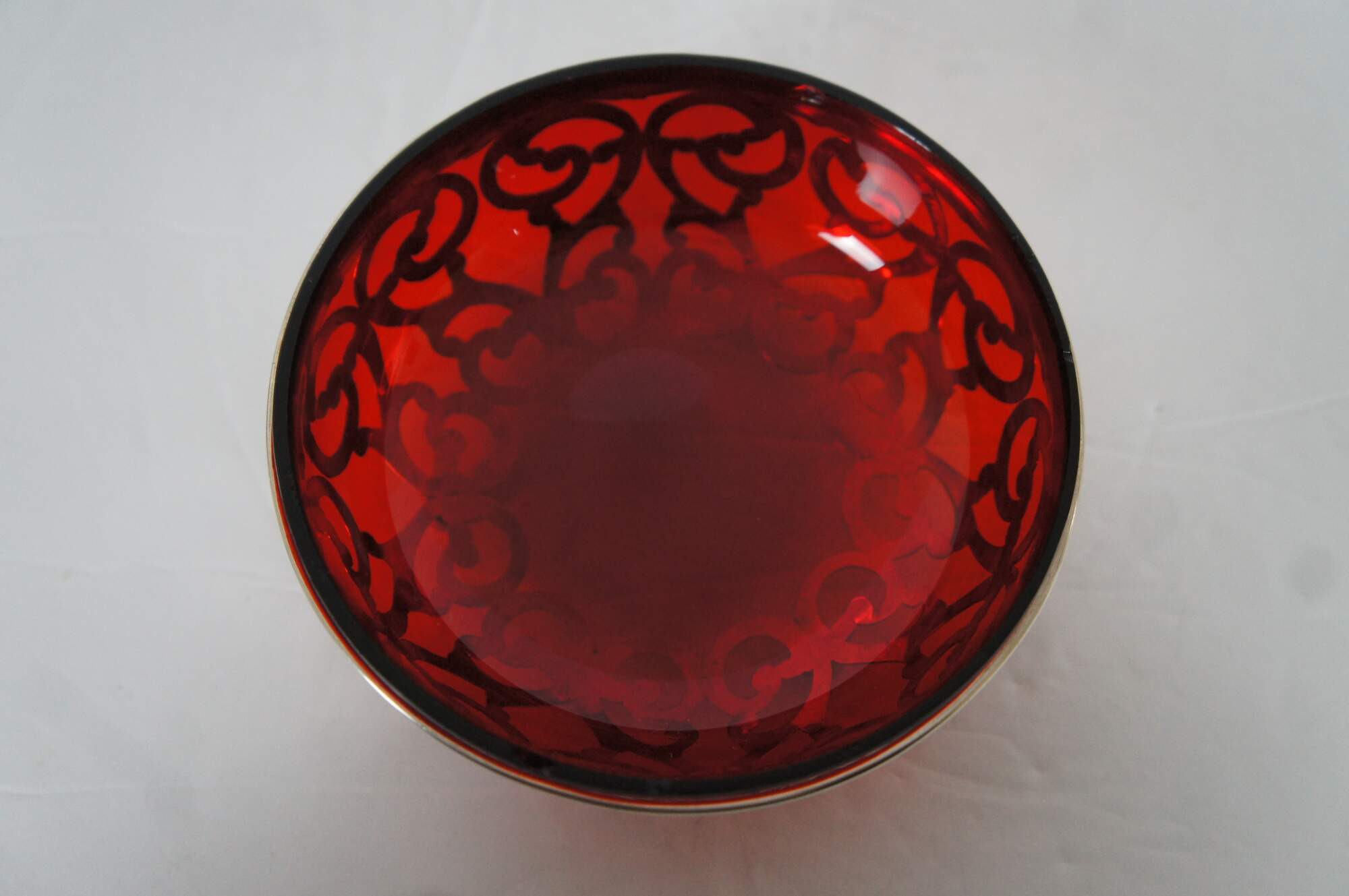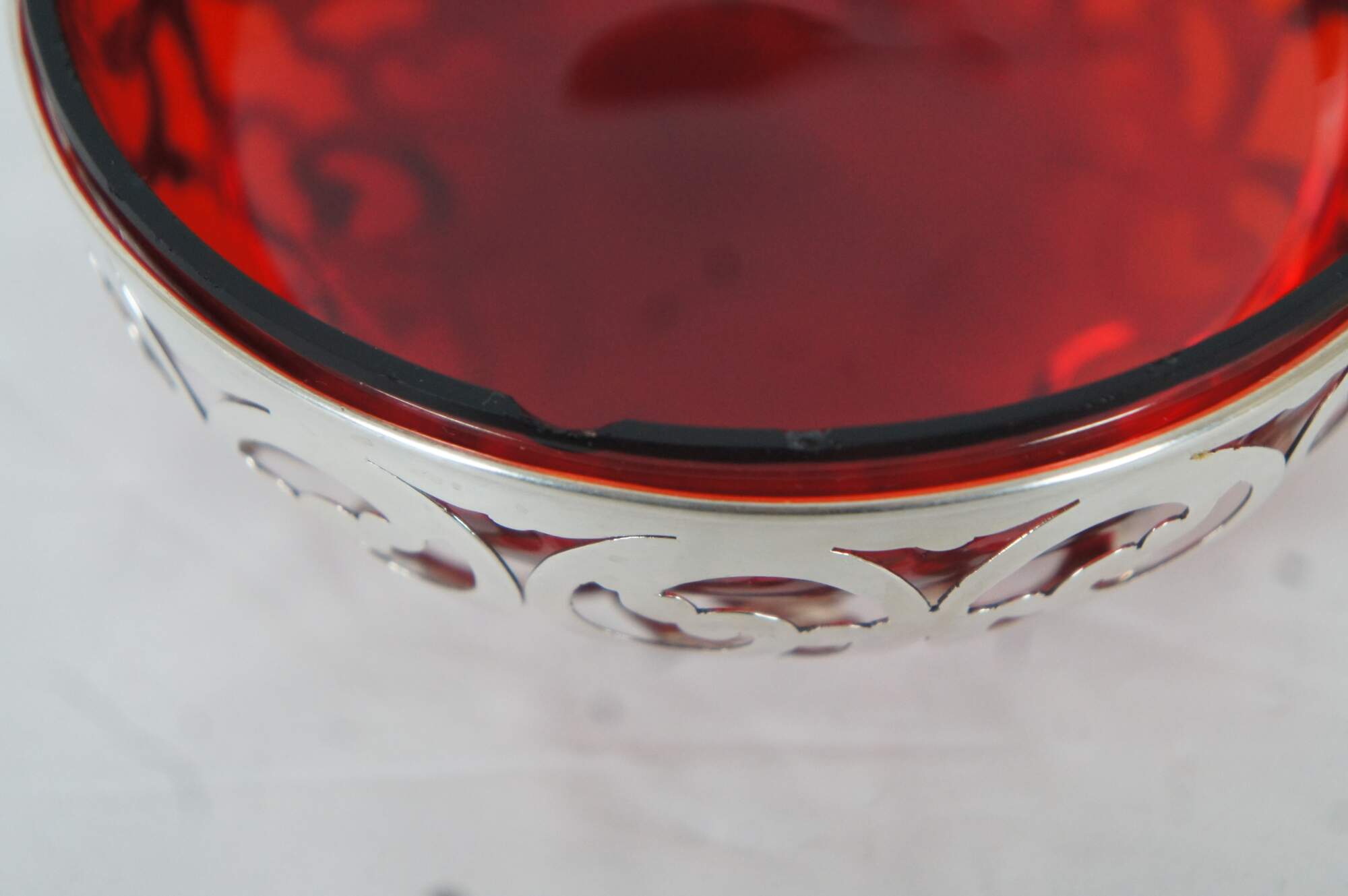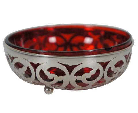 Antique early 20th century George A. Henckel & Company number 302 sterling silver nut / bonbon dish featuring bow shaped pierced sides, bun feet, and ruby glass insert.
