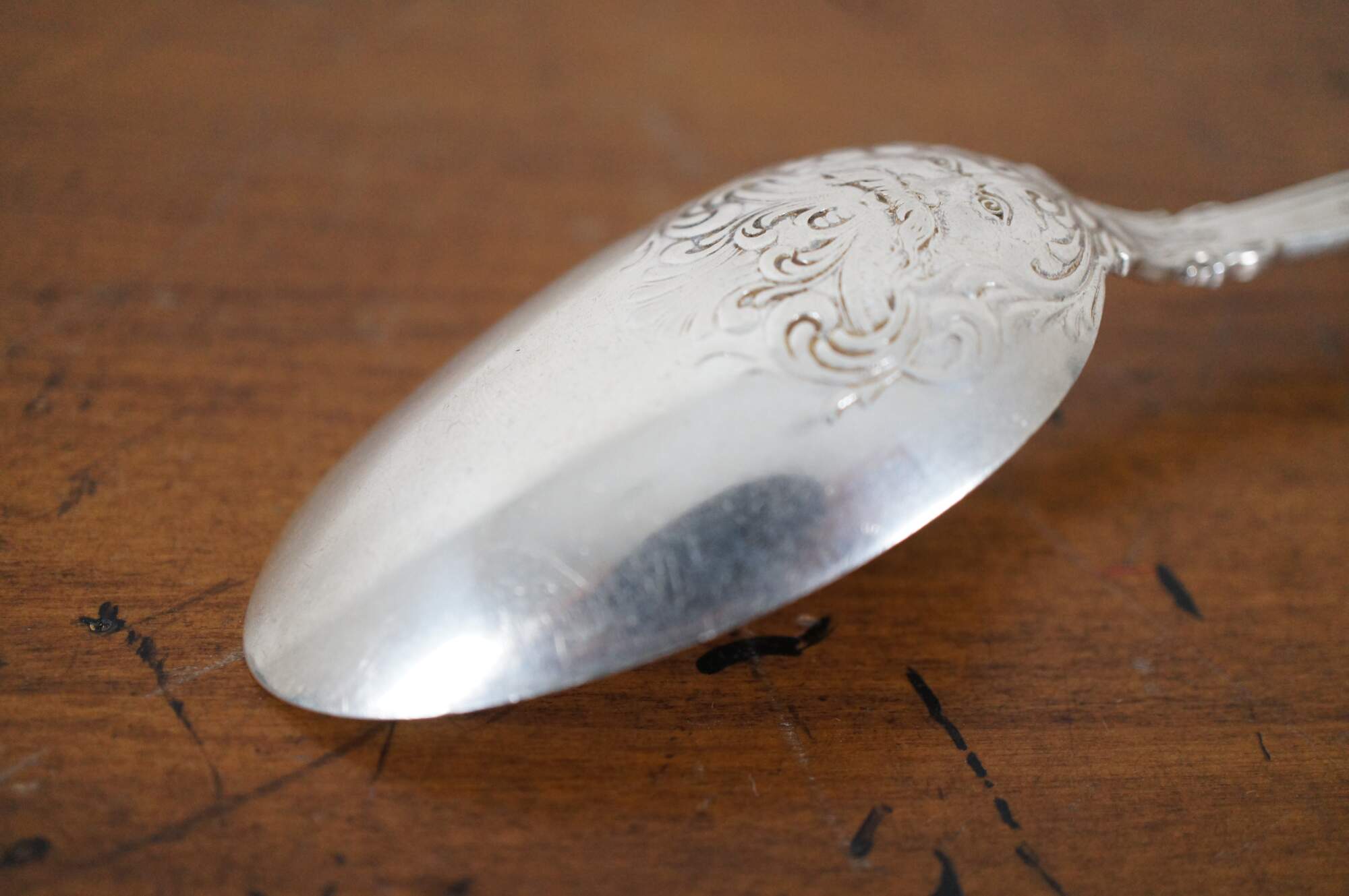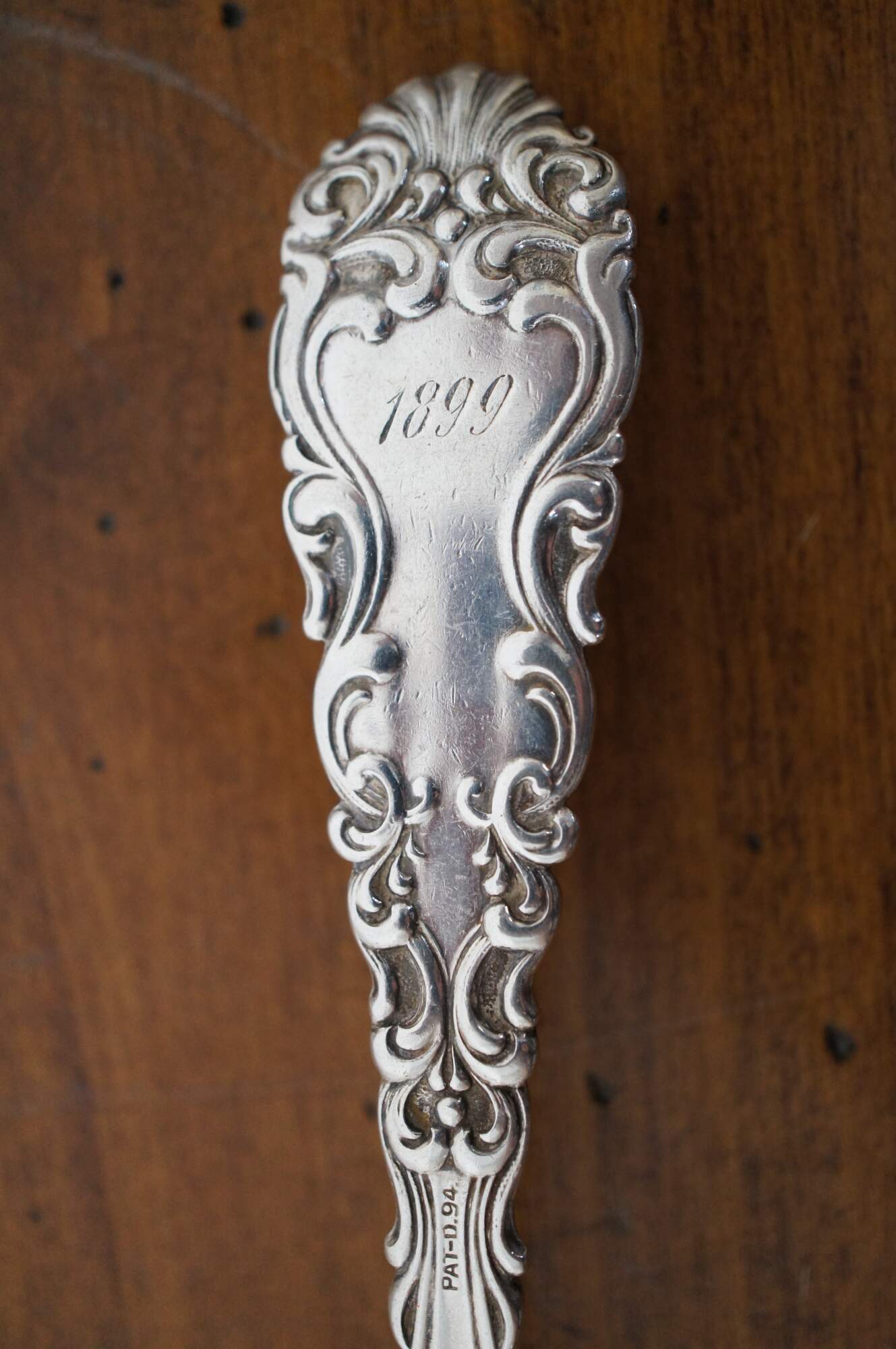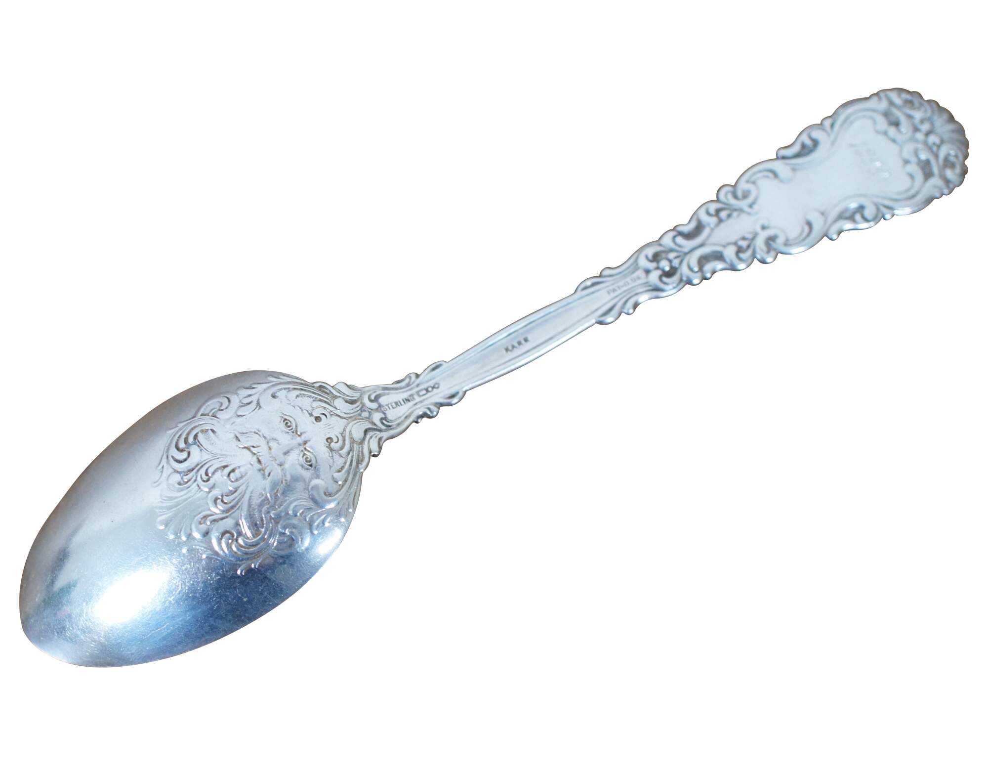 Antique turn of the century Dominick & Haff sterling silver table spoon in the Renaissance pattern (Patented 1894) featuring Northwind or Green Man faces both on the handle and on the back of the bowl.. Monogrammed with the initials MEW on the front of the handle and 1899 on the back. Also marked Karr – likely the original retailer of the piece.