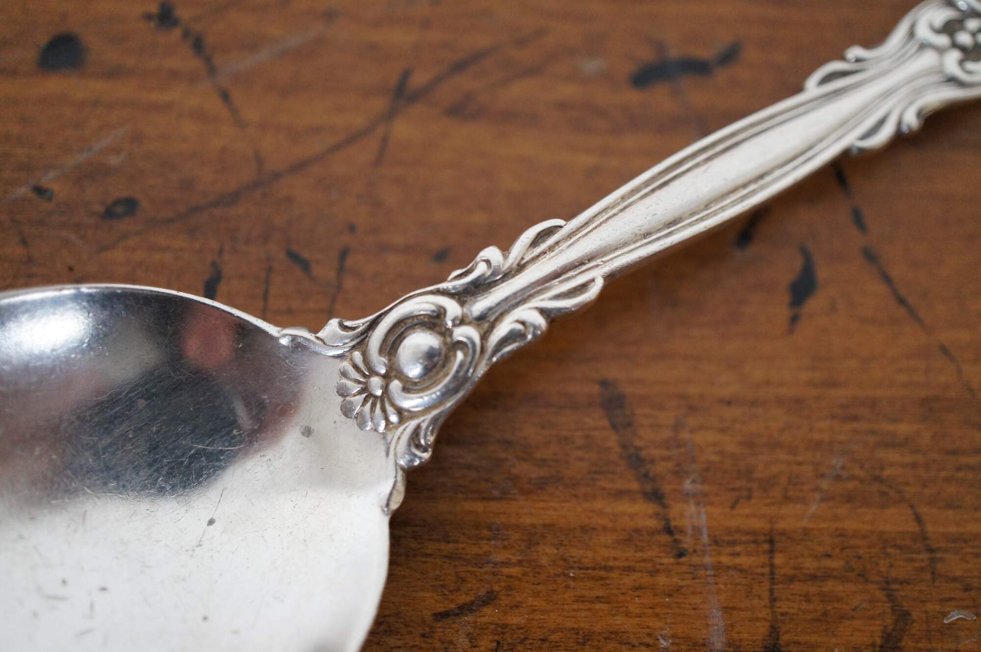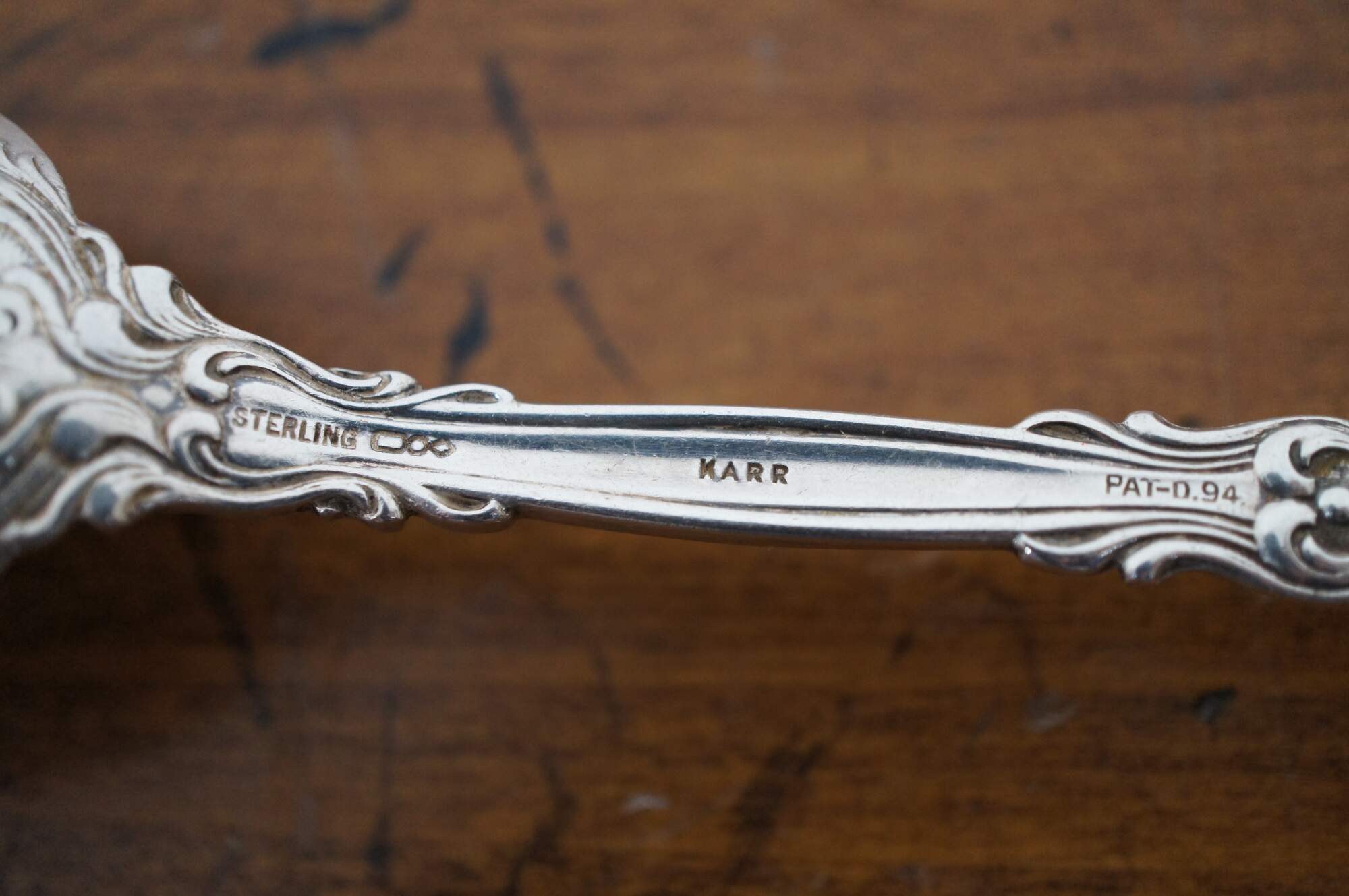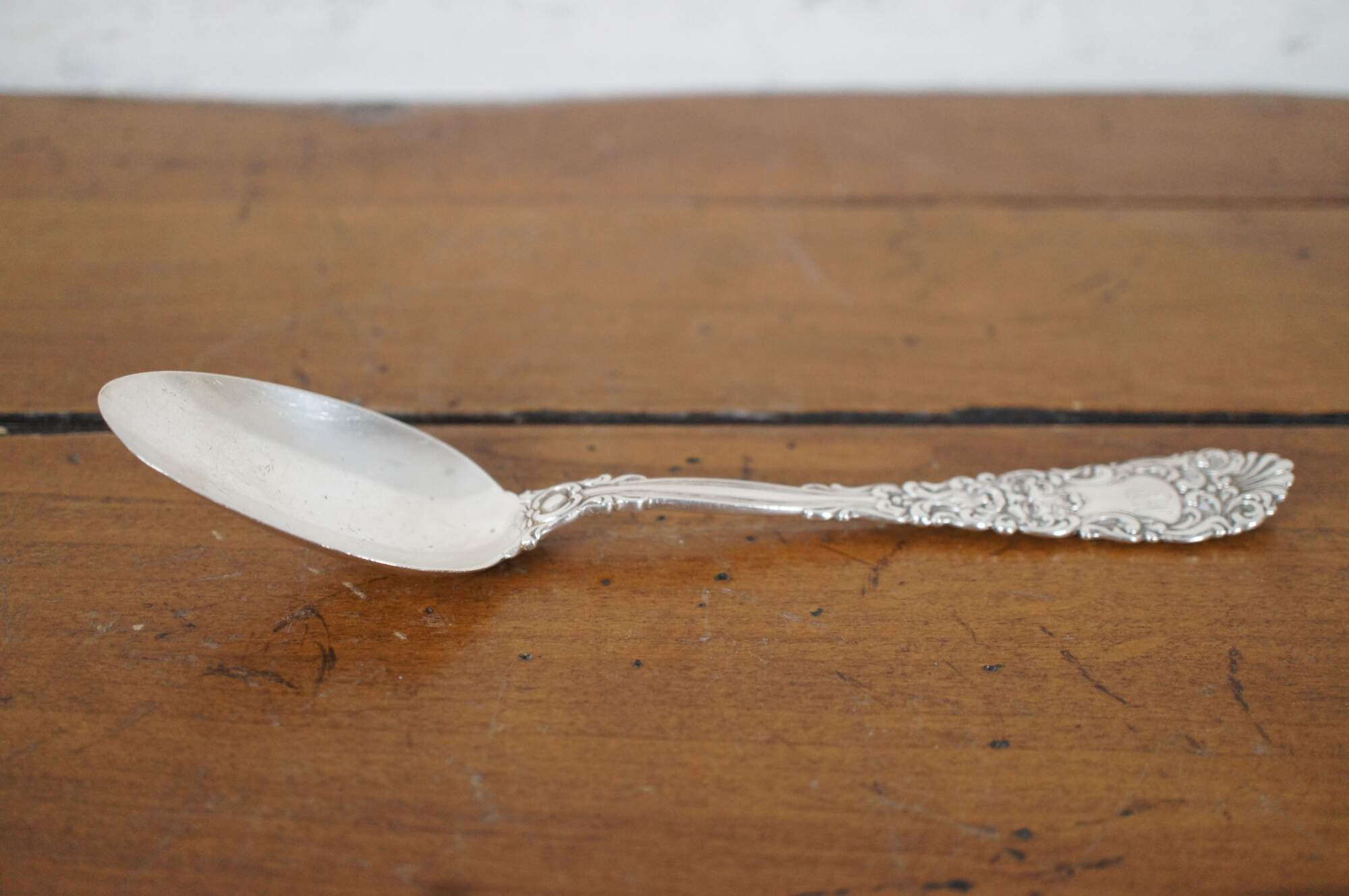 Antique turn of the century Dominick & Haff sterling silver table spoon in the Renaissance pattern (Patented 1894) featuring Northwind or Green Man faces both on the handle and on the back of the bowl.. Monogrammed with the initials MEW on the front of the handle and 1899 on the back. Also marked Karr – likely the original retailer of the piece.