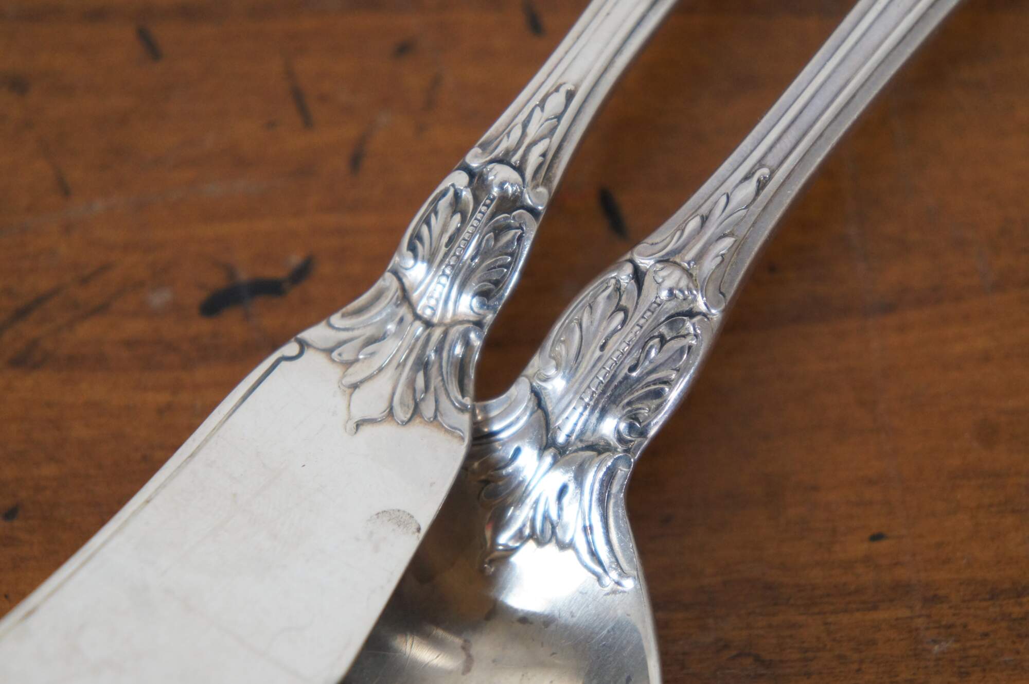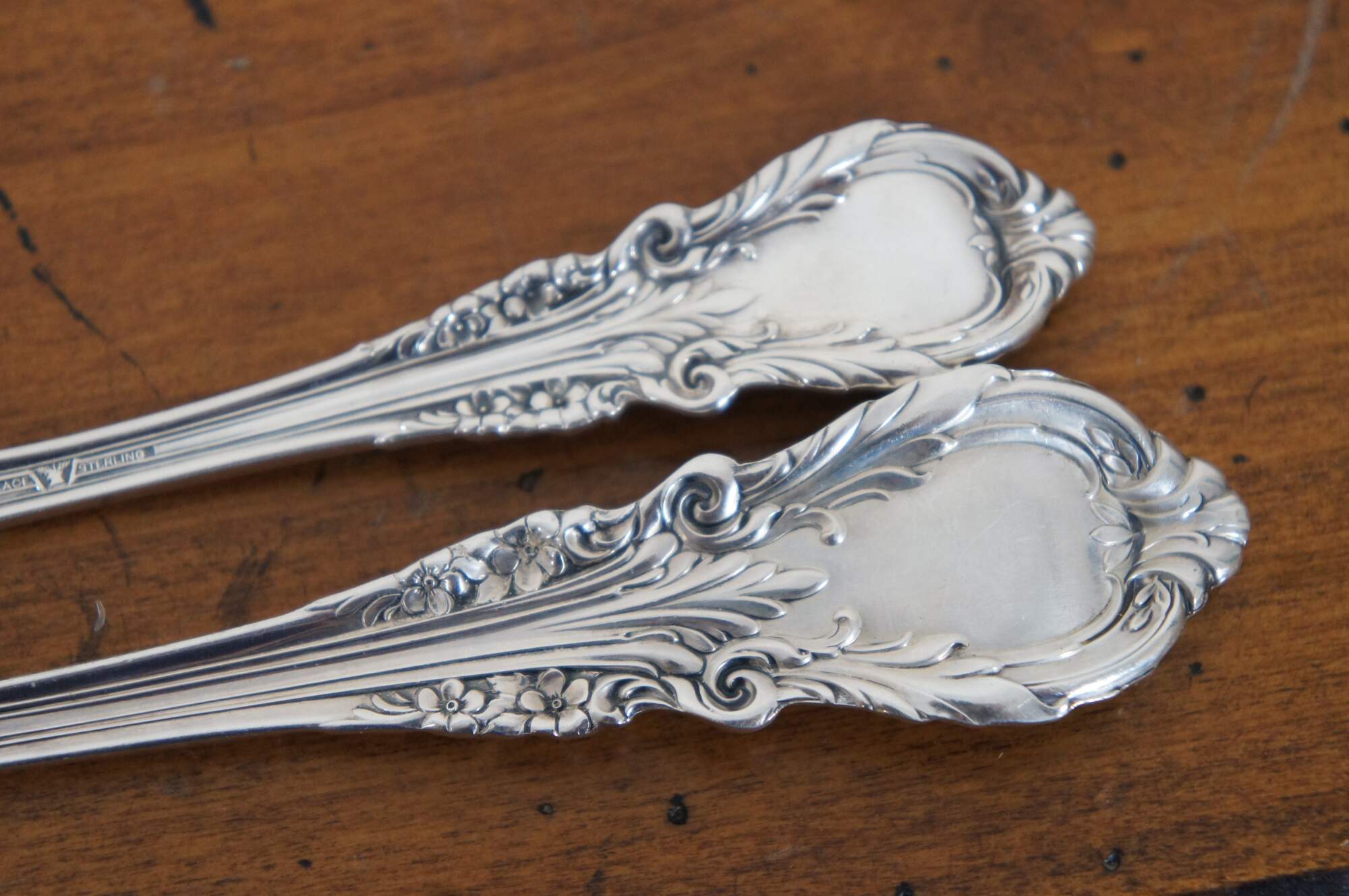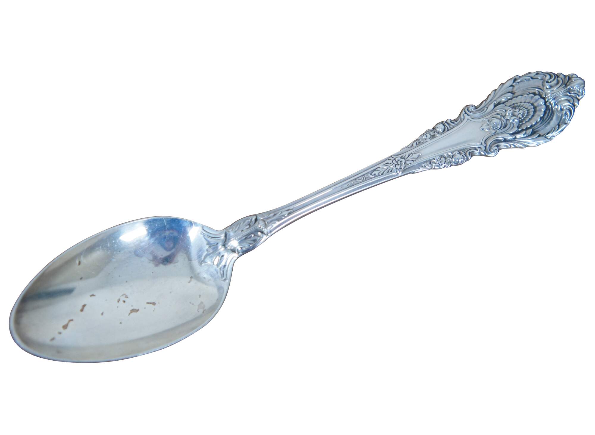 Antique early 20th century Wallace Sterling silver serving spoon and master butter knife pair in the Sir Christopher pattern (patented in 1936) with a rose below the foliate and scallop shell motif.