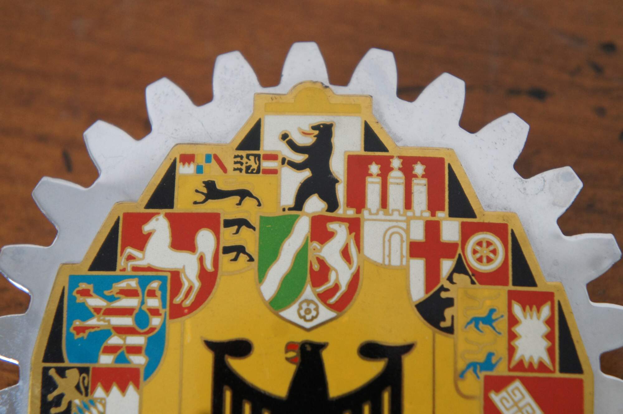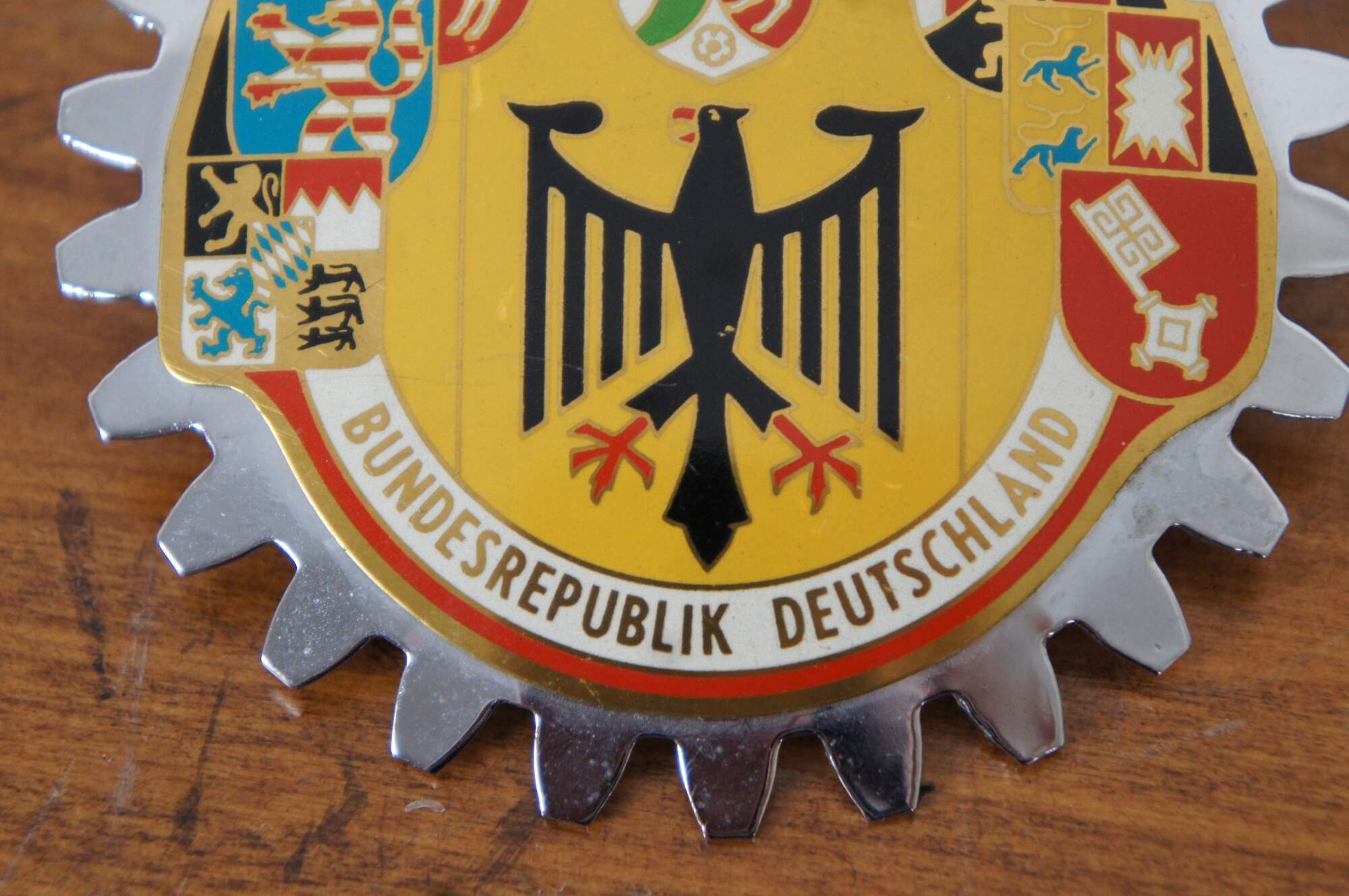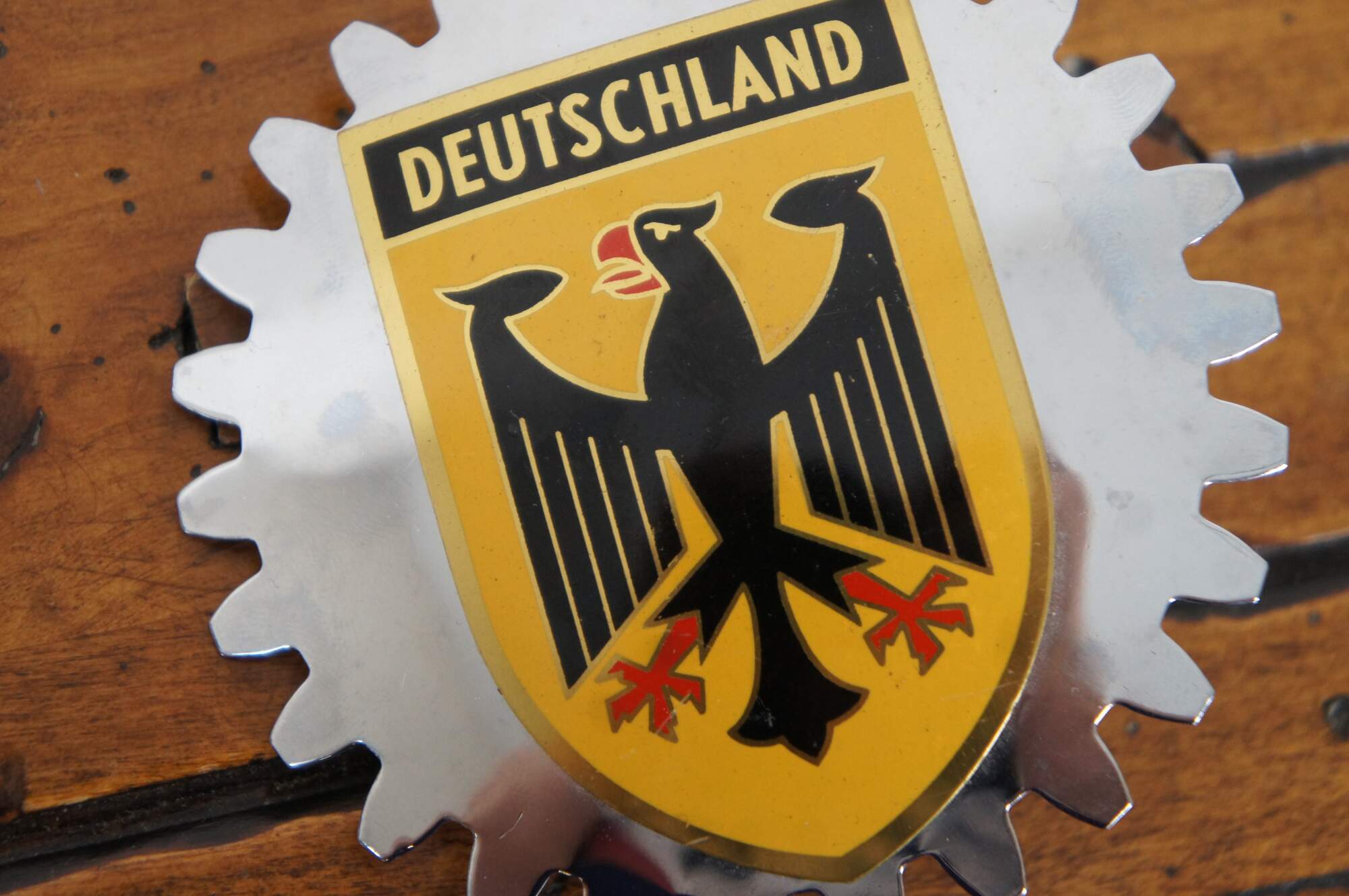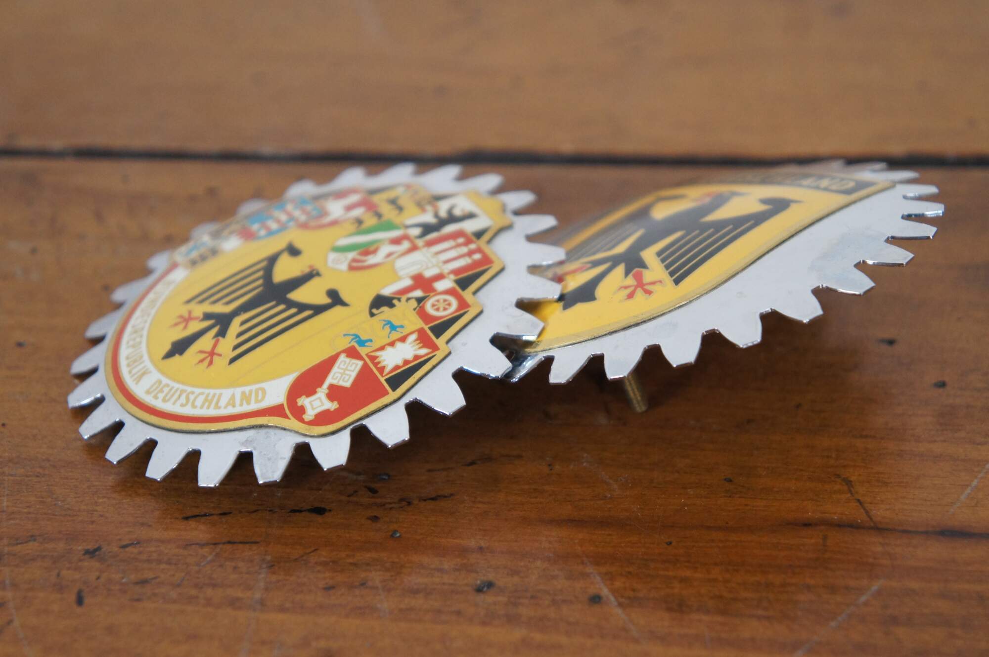 Set of 2 vintage chrome and enamel German auto emblems / grille badges – one Bundesrepublik Deutchland, 10 Cities badge and one basic Deutschland badge.