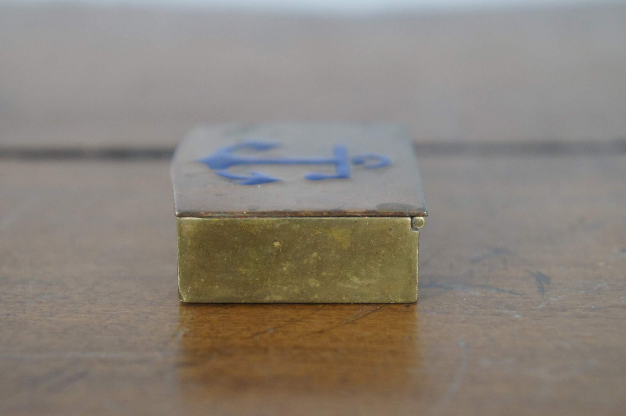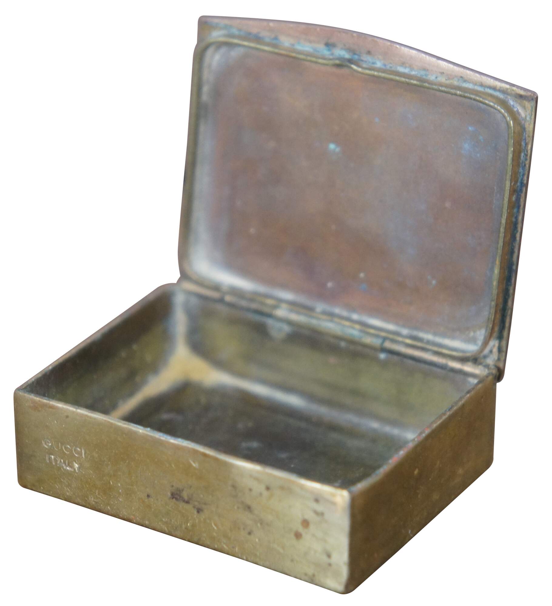 Incredibly unique, early to mid 20th century rectangular brass pill box, decorated with a rope and anchor design, finished in blue enamel. Marked Gucci, Italy, stamped on the front edge. Closes securely and opens easily.
