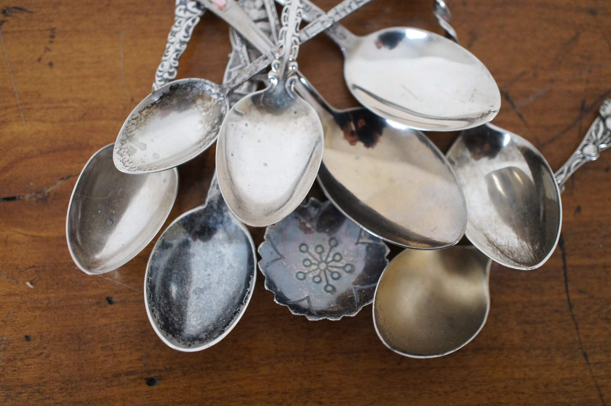 Lot of 16 antique sterling silver souvenir coffee spoons. Makers include Joseph Mayer & Bros, Robert Wallace & Sons, Whiting Mfg Co, Towle Silversmiths, Paye & Baker, Mechanics Silver Company, and Wendell Mfg Co.