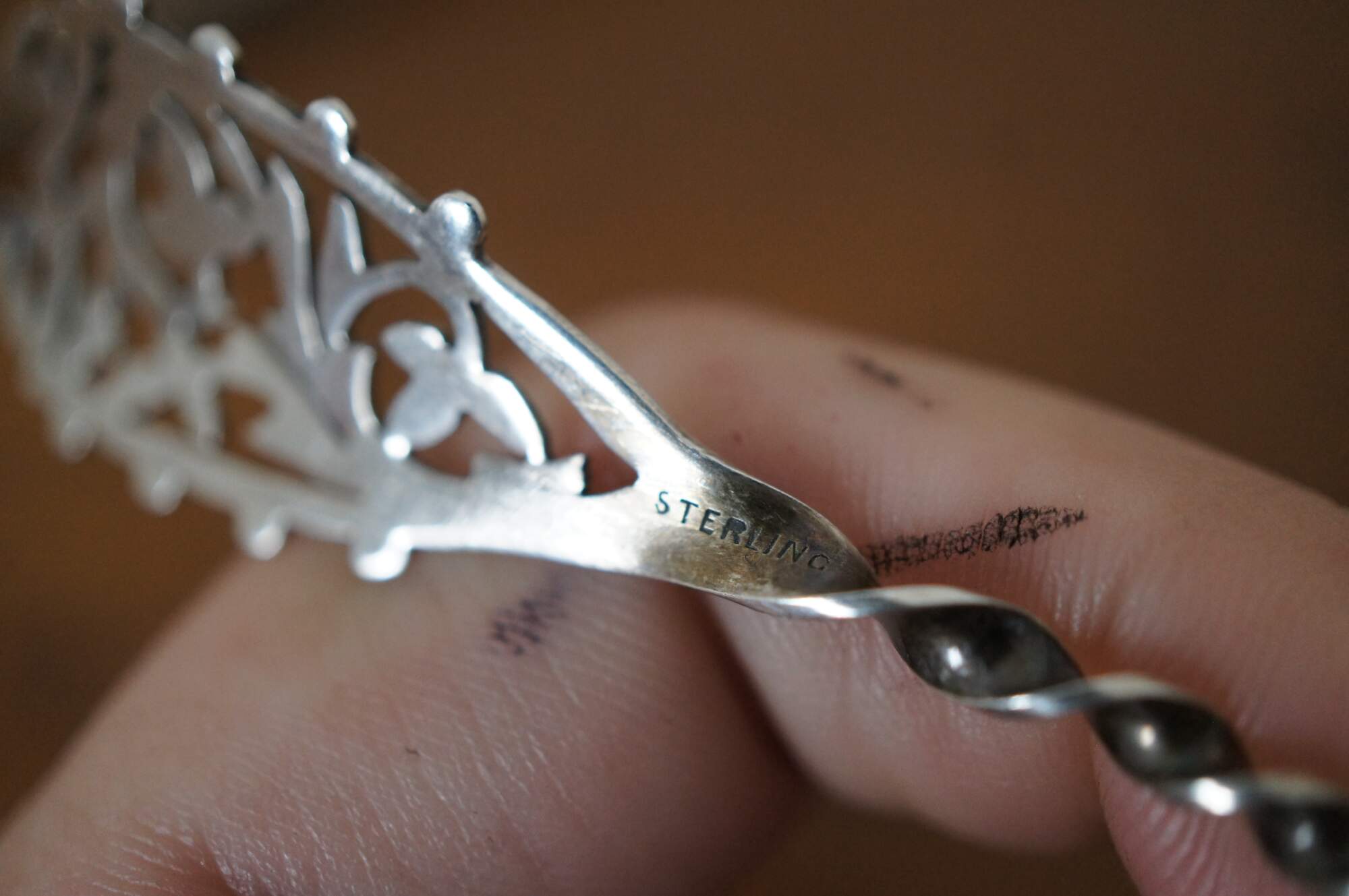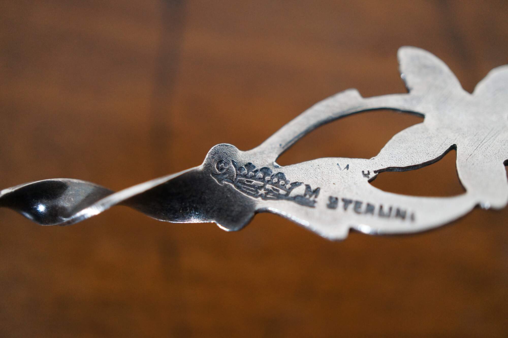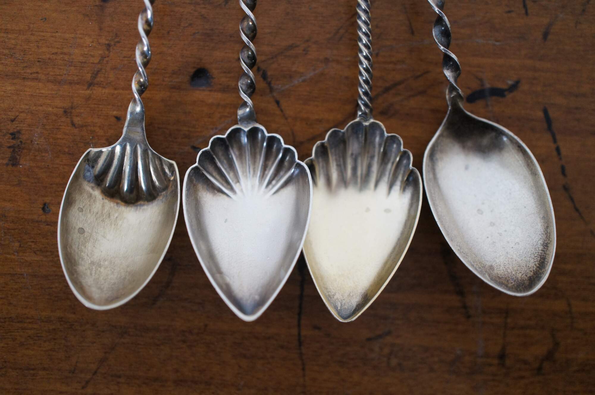 Lot of 4 antique sterling silver coffee / sugar spoons with scallop shell design on the bowls, twisted handles, and pierced / reticulated handles. One by Campbell-Metcalf Silver Co.