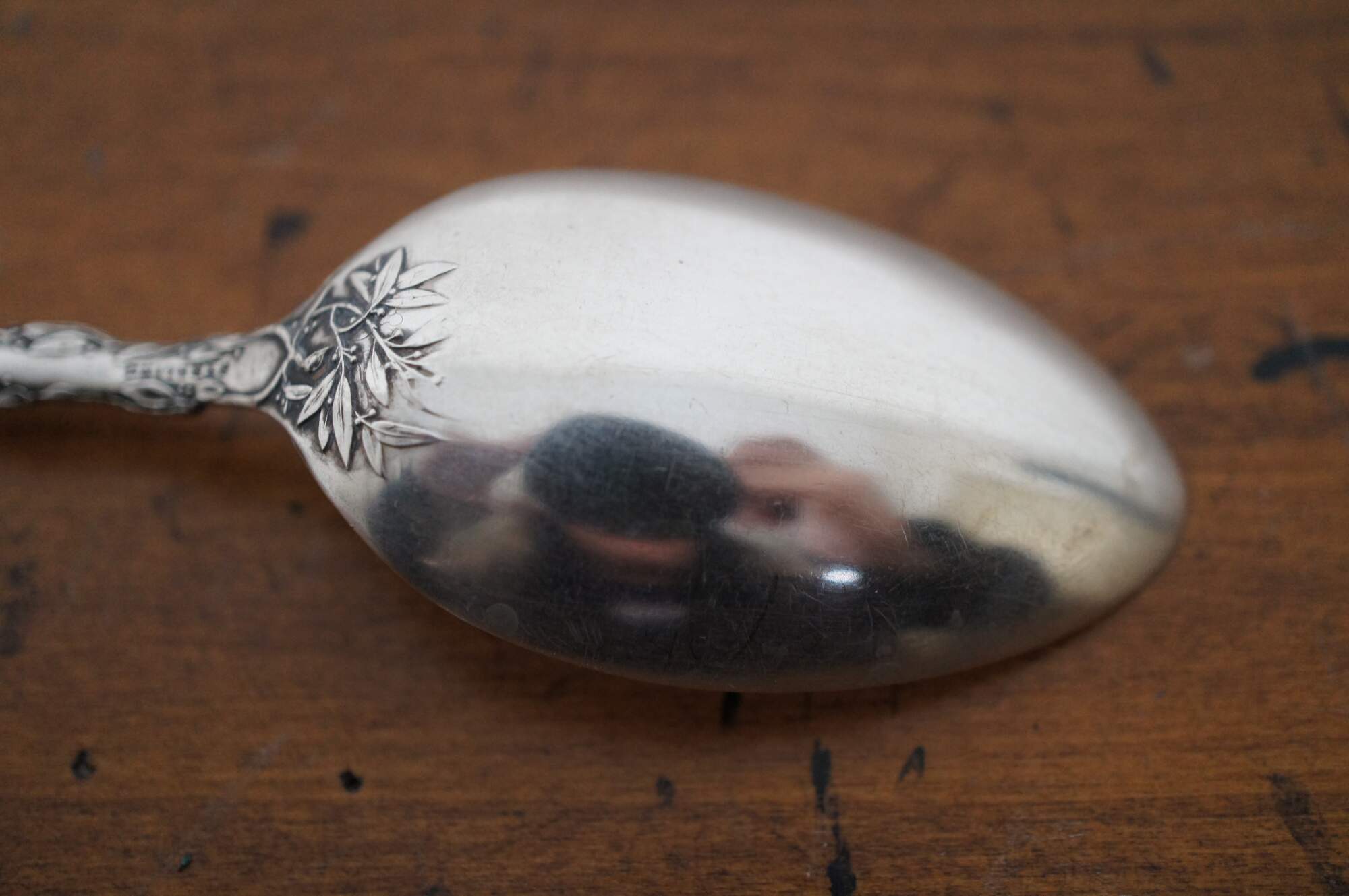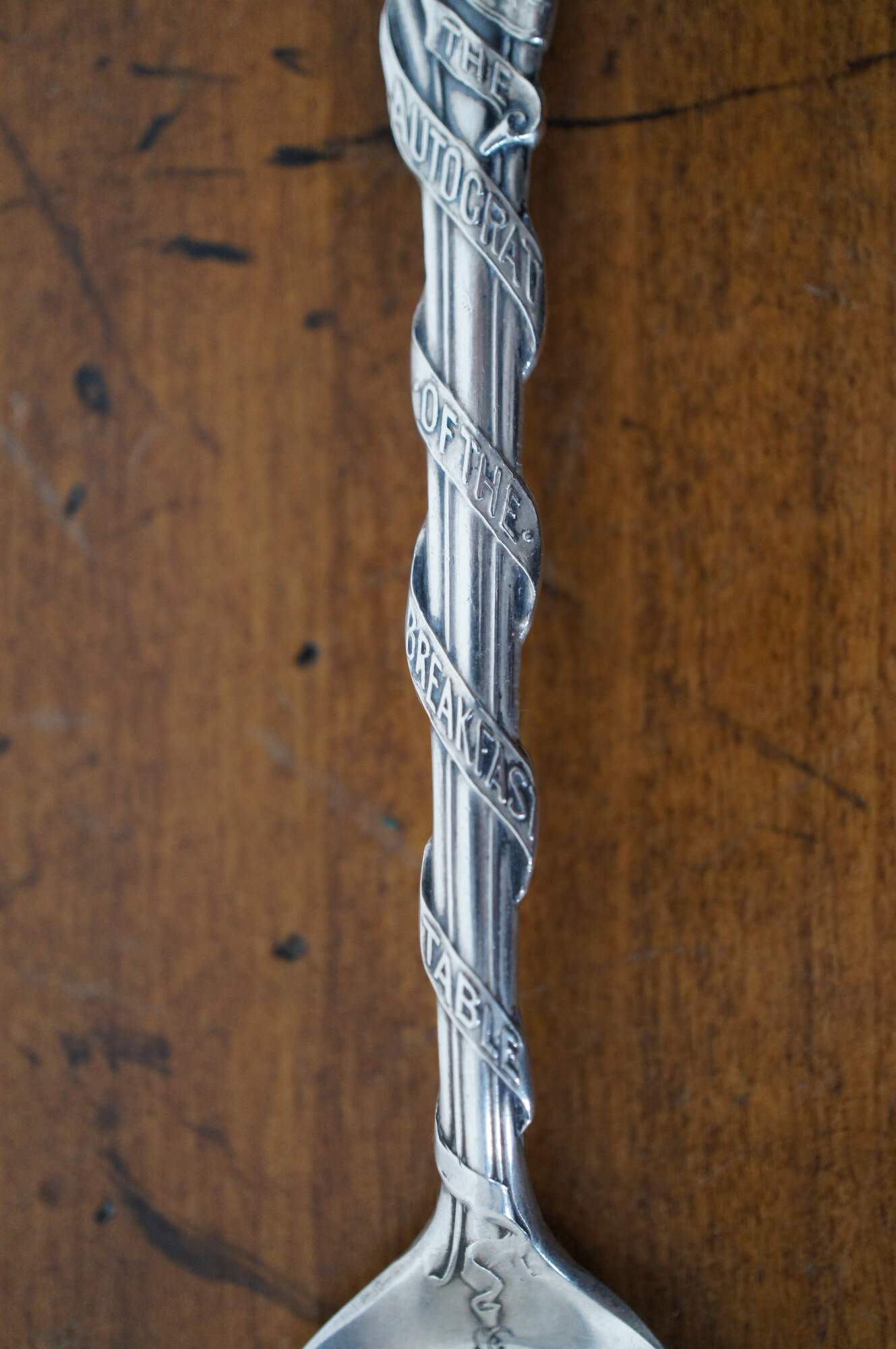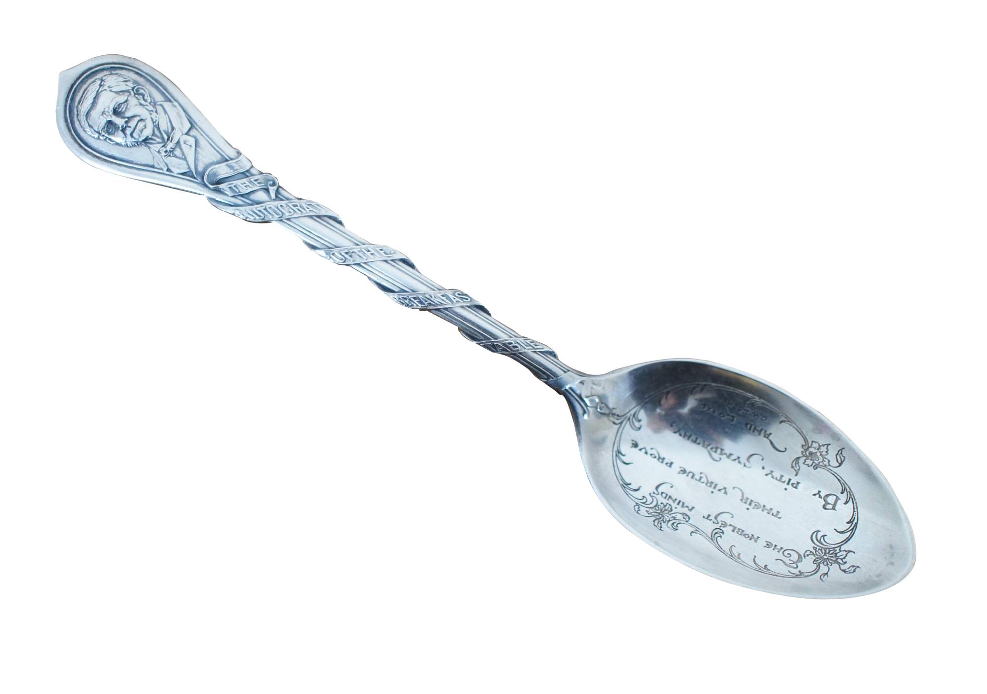Rare antique sterling silver souvenir tea spoon featuring the portrait of Oliver Wendell Holmes, The Autocrat of the Breakfast Table (Boston) on a ribbon around the handle, leading down to the bowl engraved with the quotation “The noblest minds their virtue prove by pity, sympathy and love.” The reverse displays his name surrounding a small buggy, above the word Boston and a trail of mistletoe.