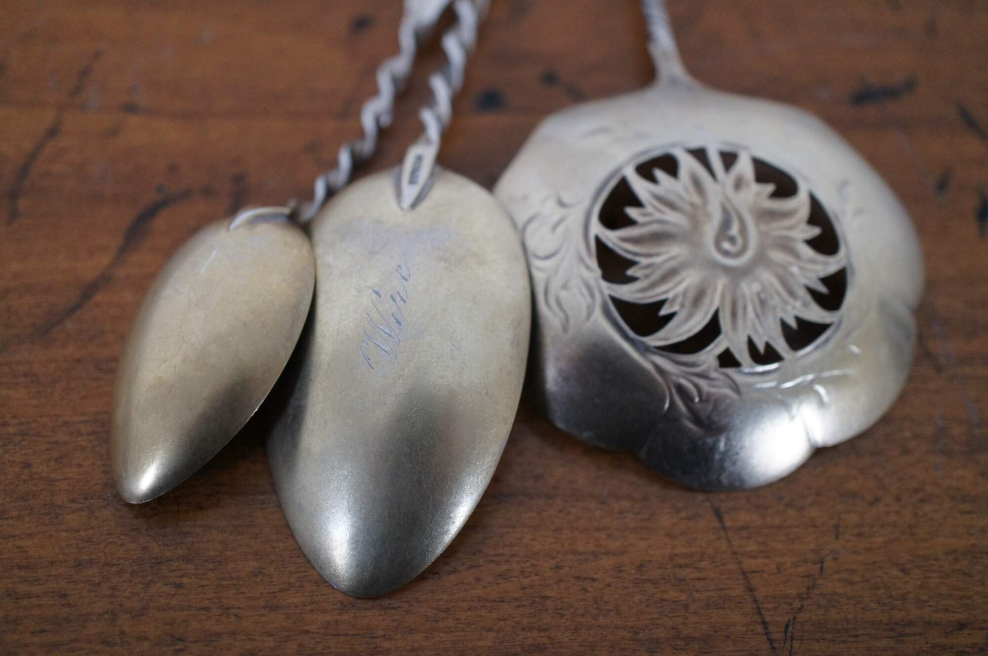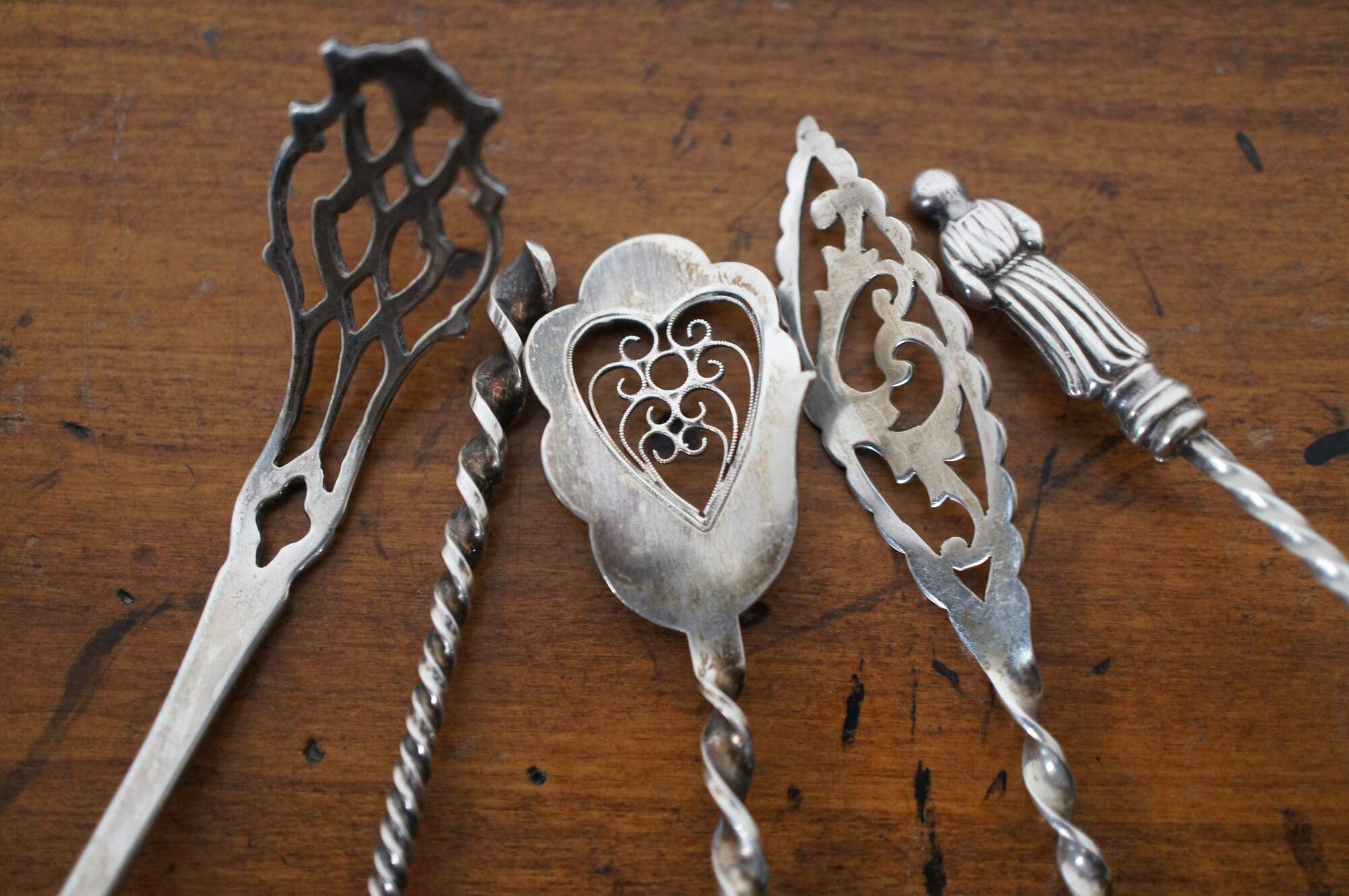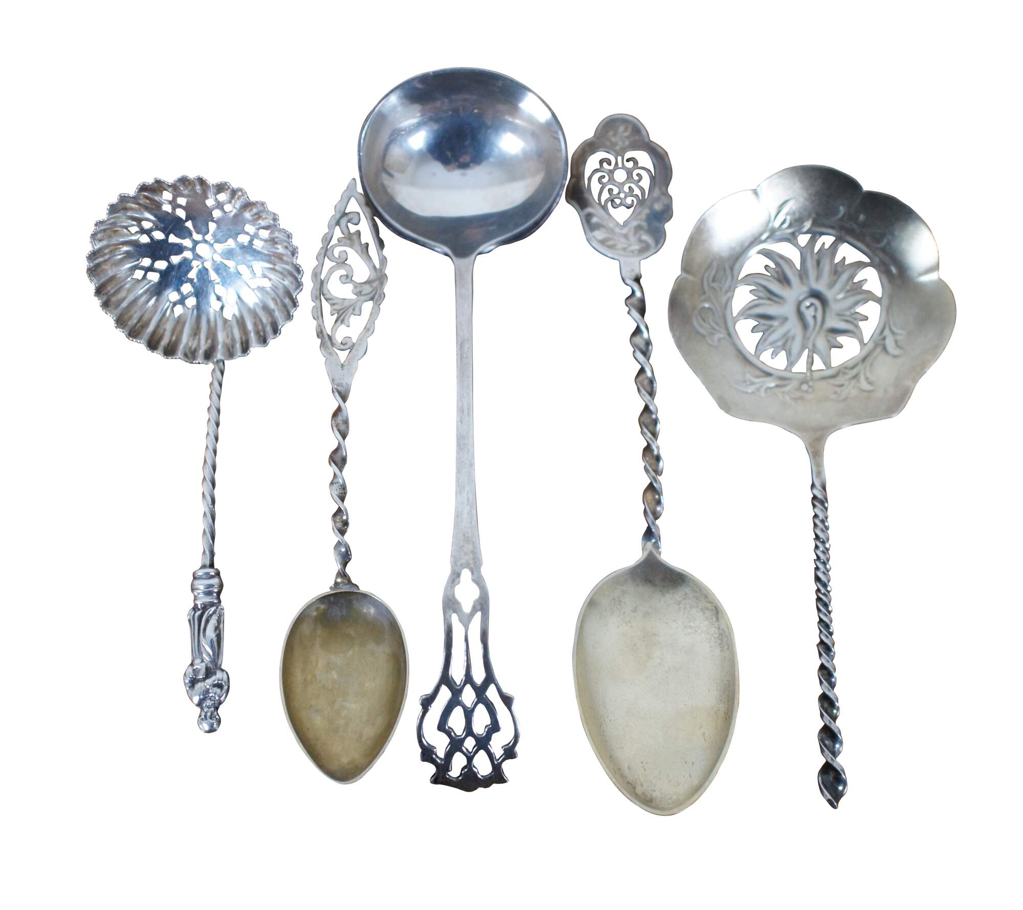 Lot of five sterling silver spoons with a variety of ornate twisted and reticulated handles, including two tea / coffee spoons, two pea / bon bon spoons, and one sauce ladle. Makers include Towle Silversmiths, Lunt Silversmiths, and William Devenport.