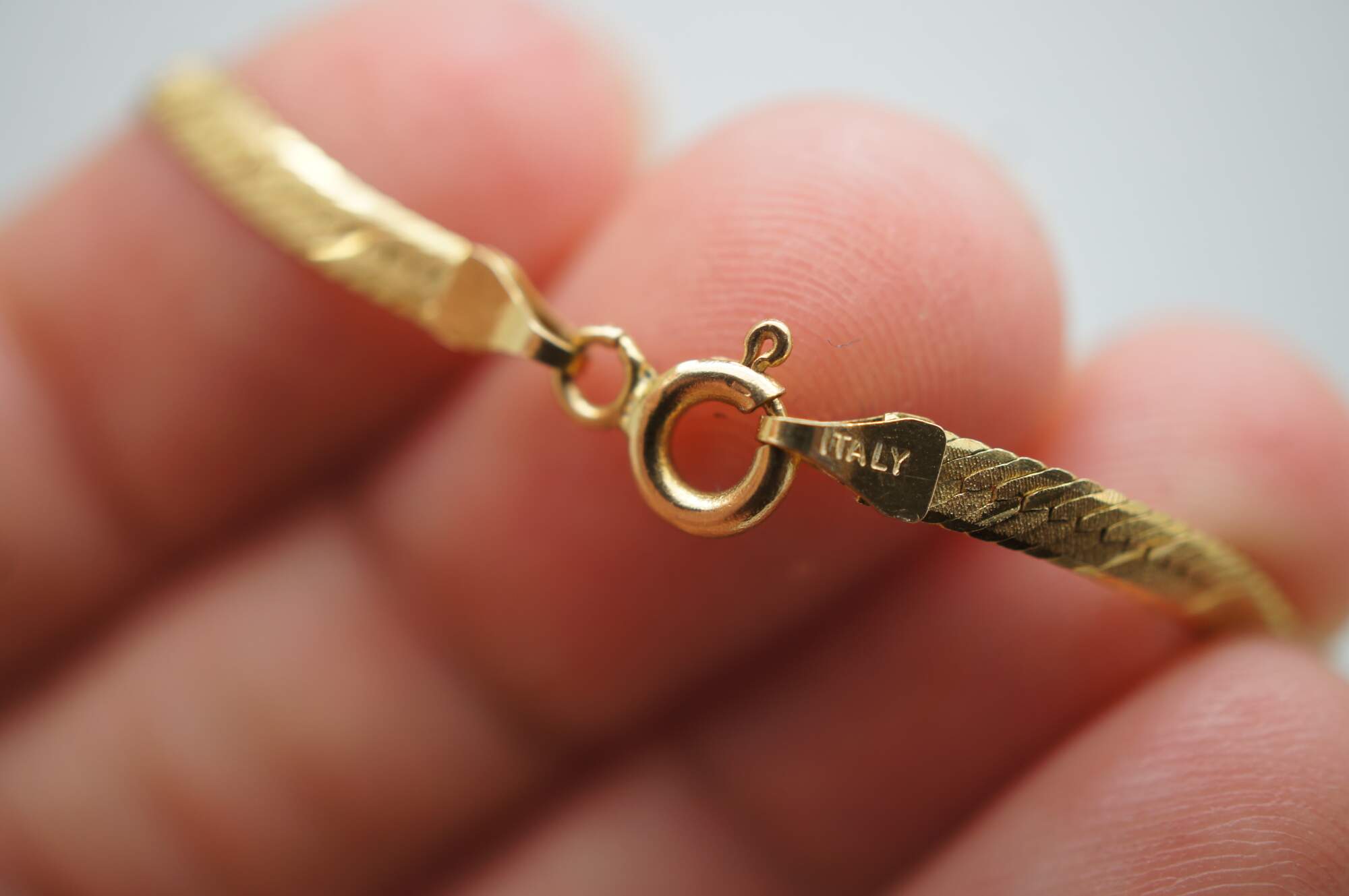 Vintage 14k yellow gold flat herringbone chain necklace with spring ring clasp. Made in Italy.