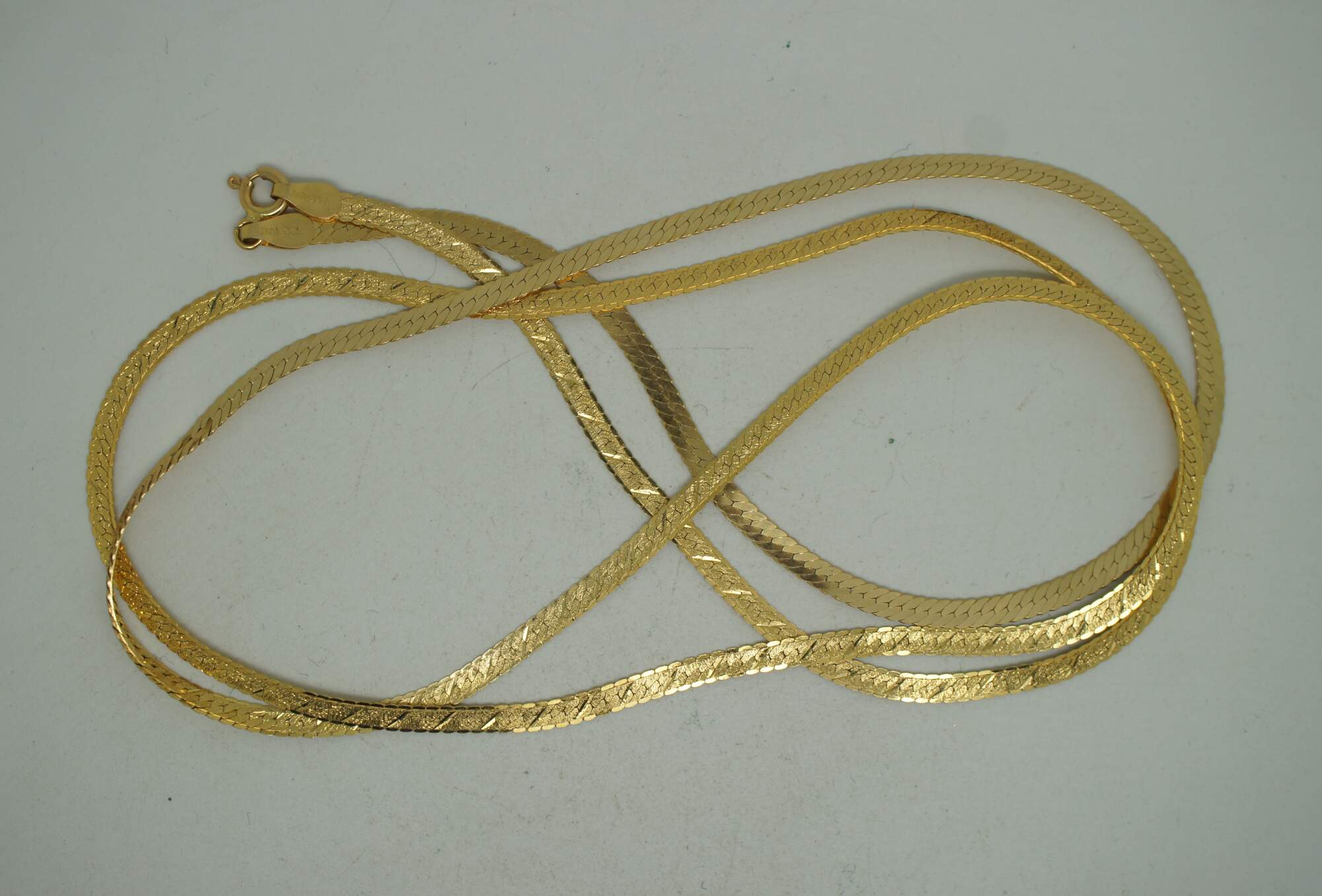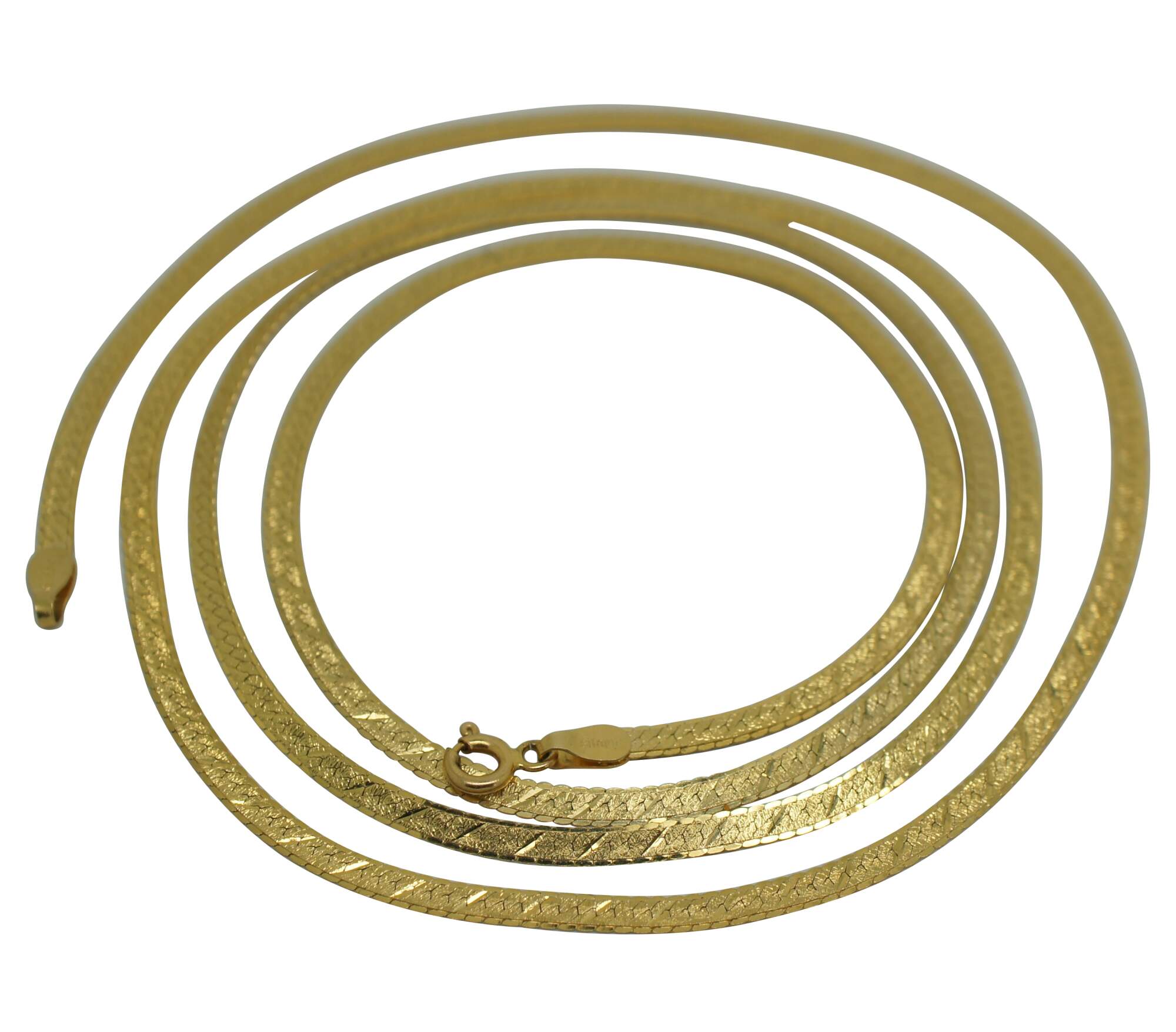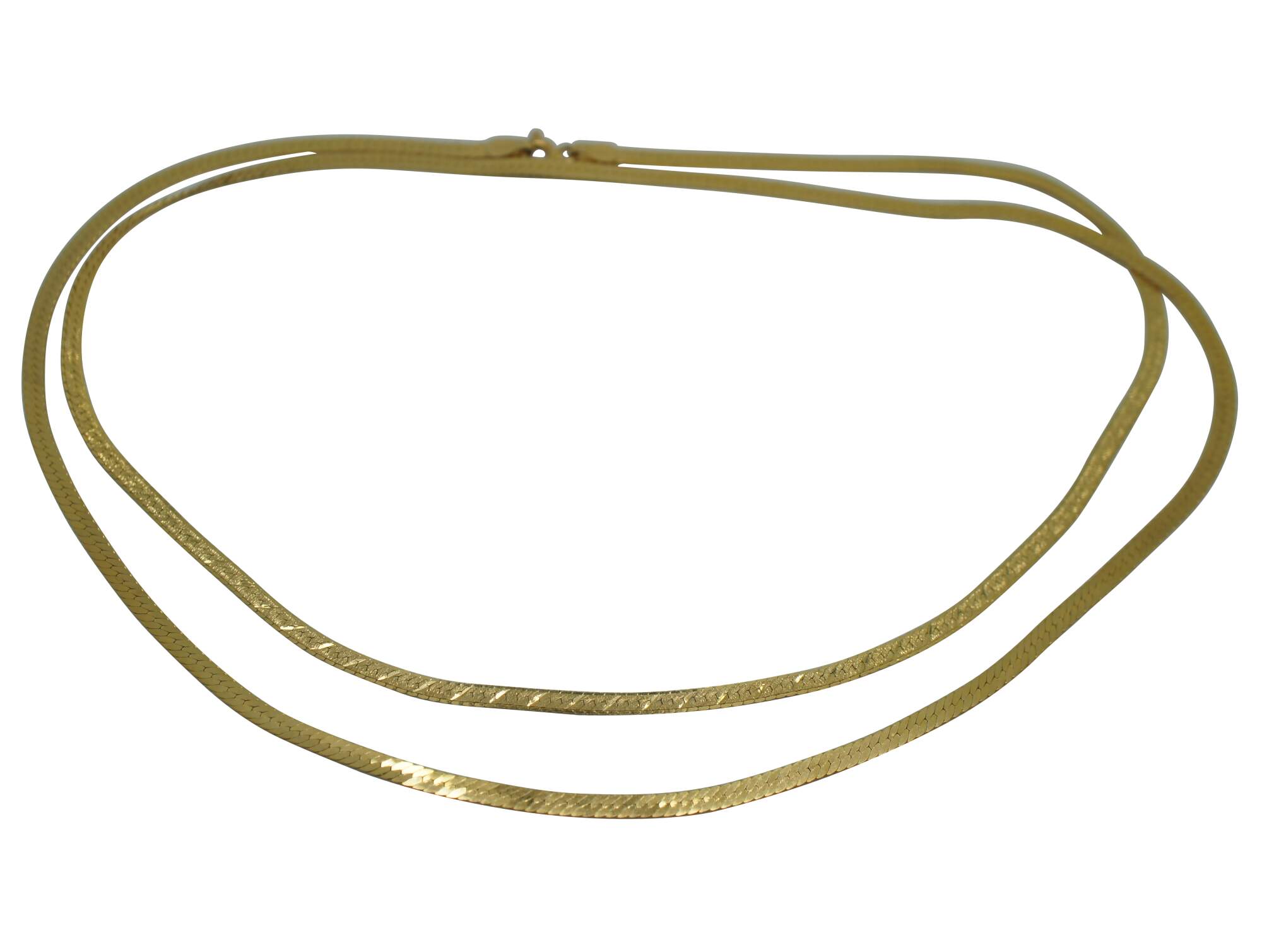 Vintage Silmar 14k yellow gold flat chain necklace in the herringbone design with a decorative texture and scalloped edge; spring ring clasp. Made in Italy.