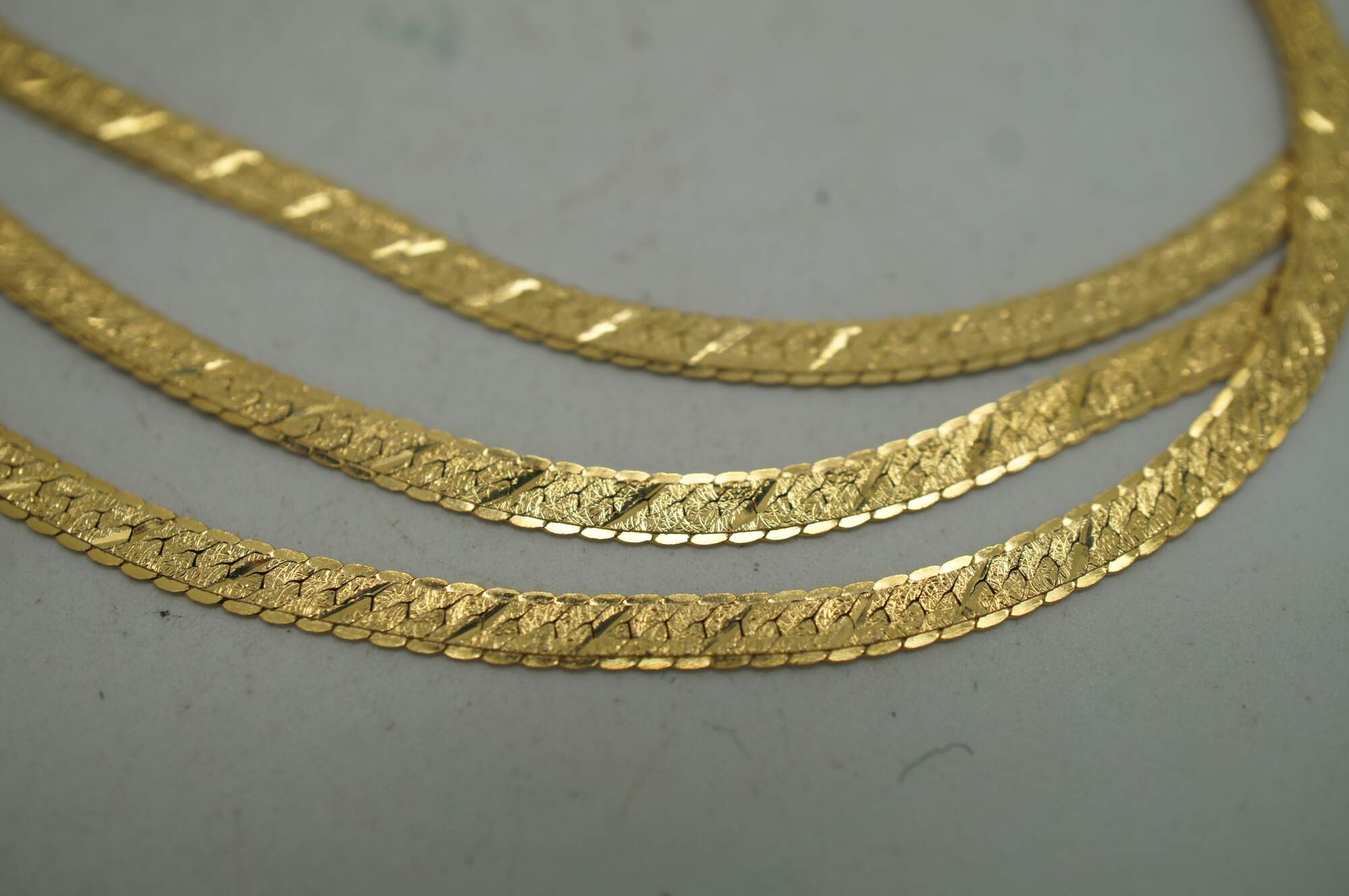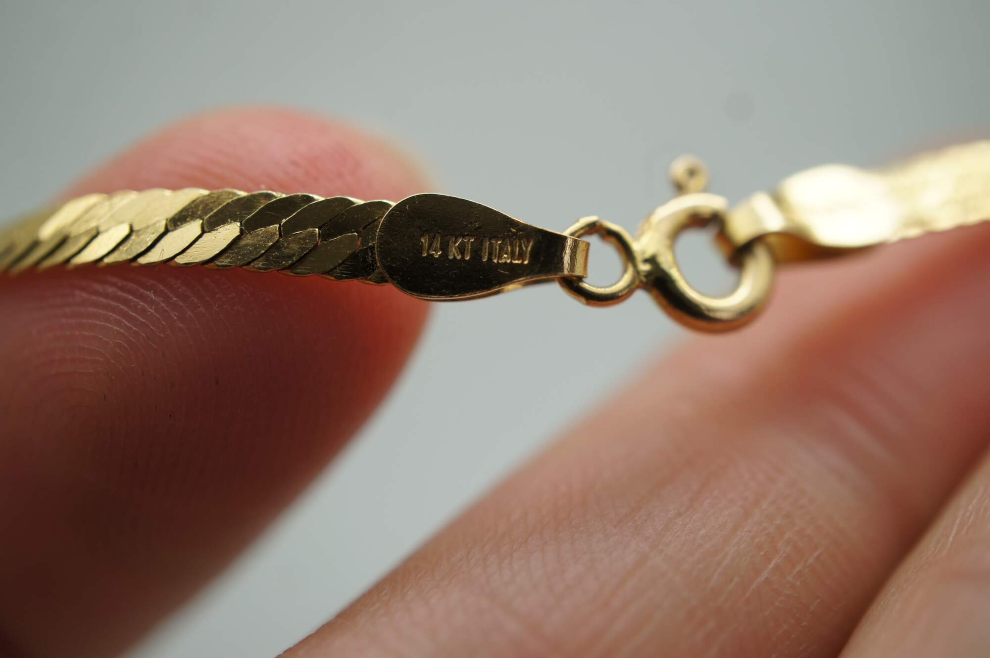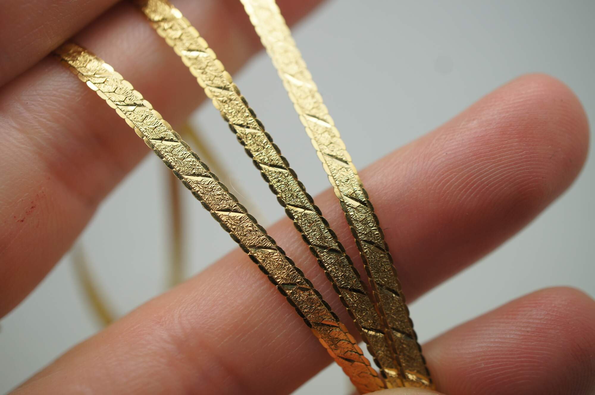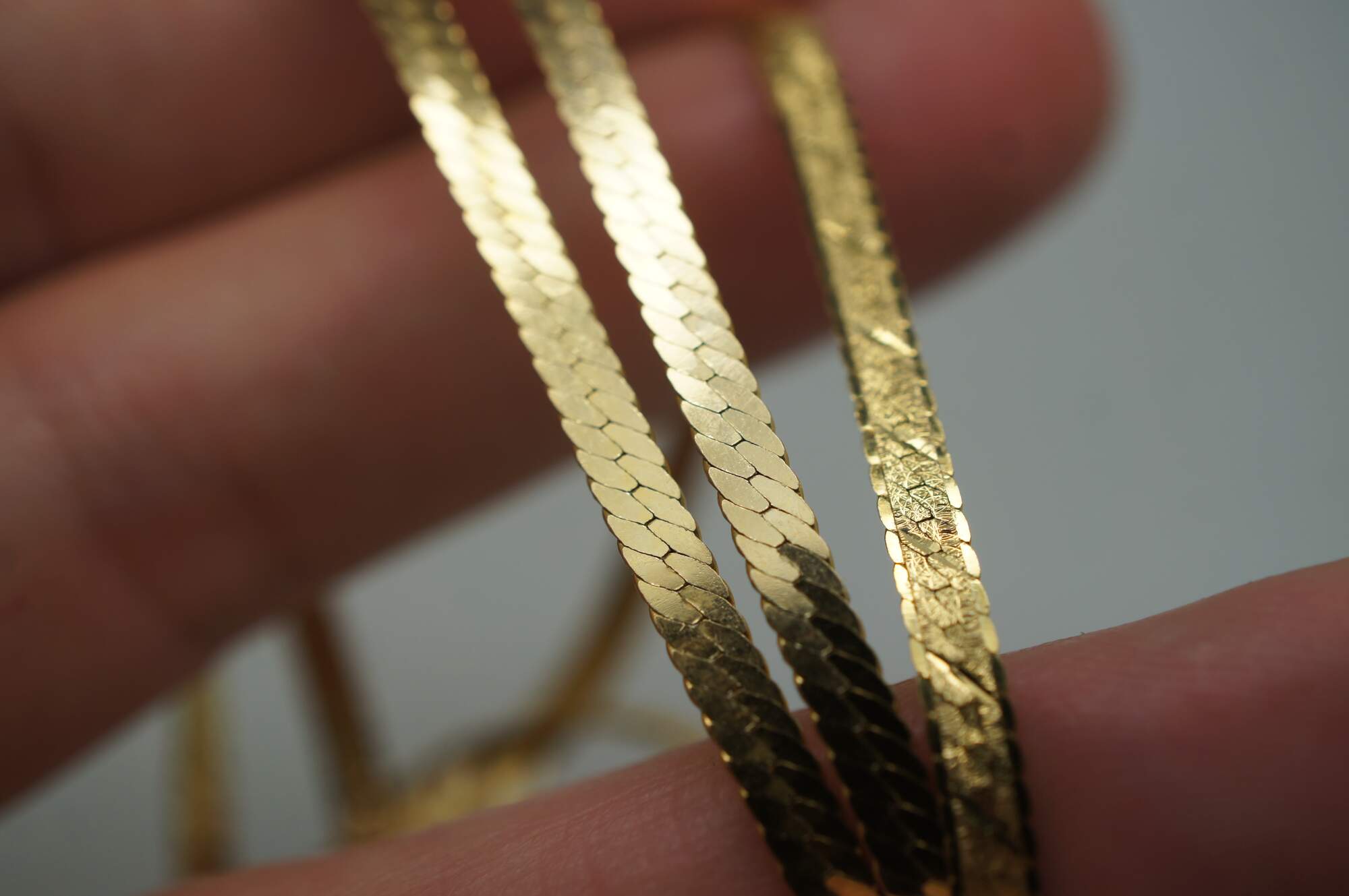 Vintage Silmar 14k yellow gold flat chain necklace in the herringbone design with a decorative texture and scalloped edge; spring ring clasp. Made in Italy.