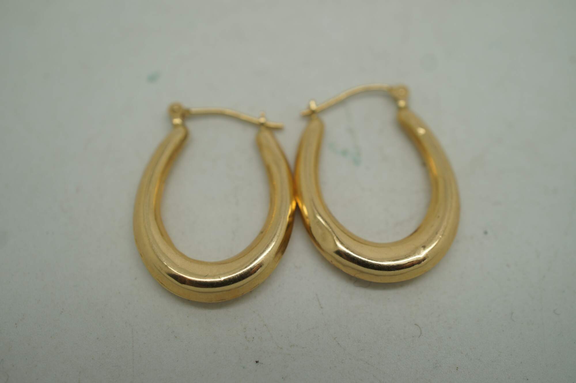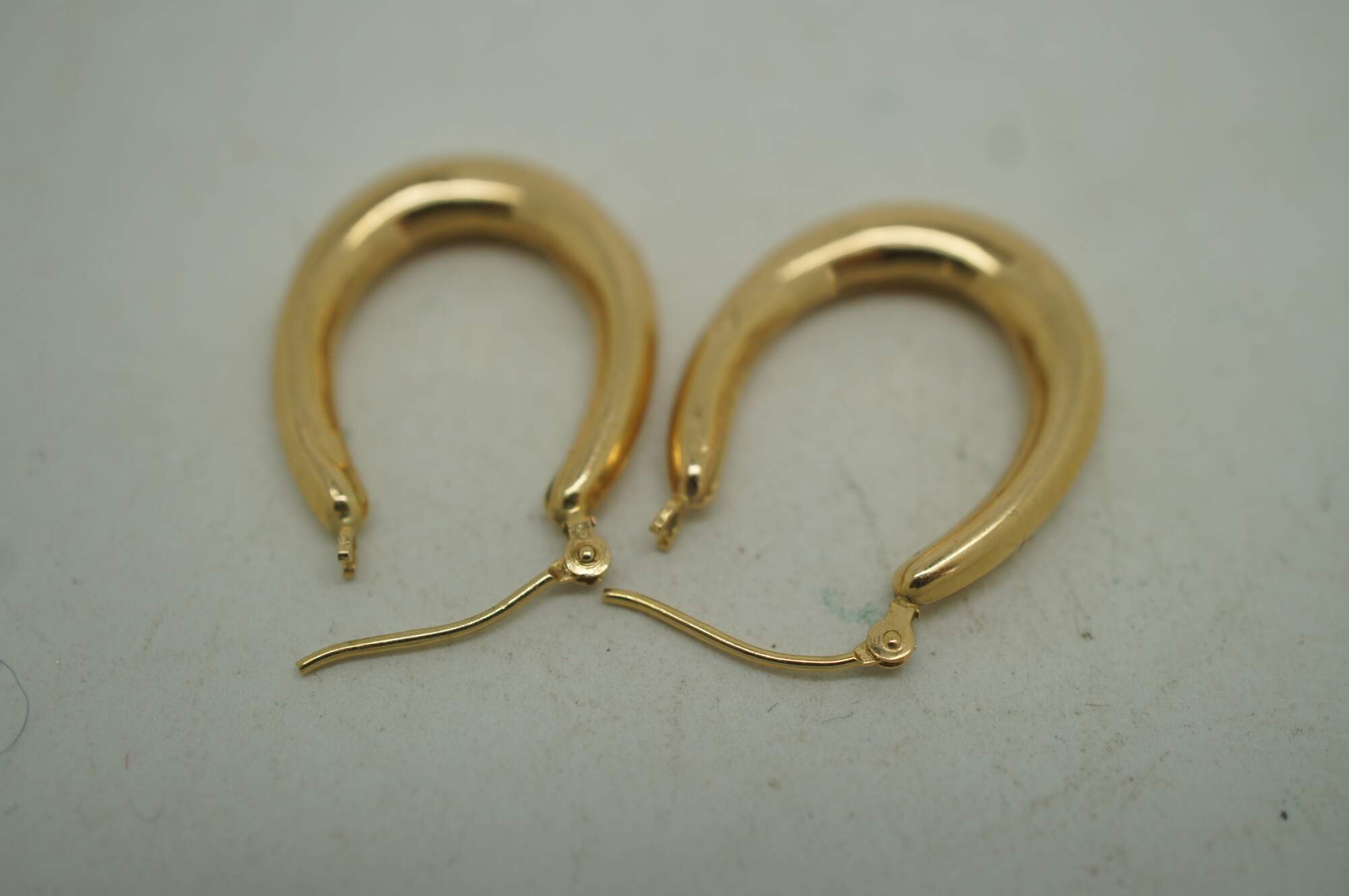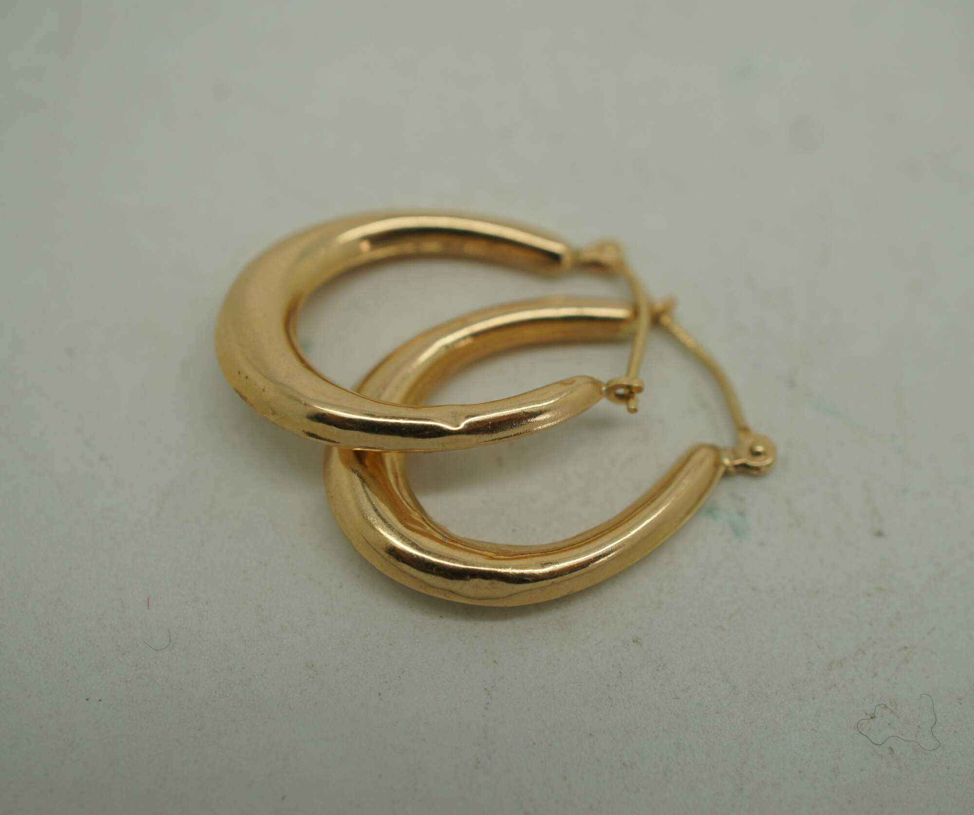 Two pairs of vintage 14k yellow gold hollow / puffy hoop earrings, one more oval and the other more circular, with hinged loop earring backs.