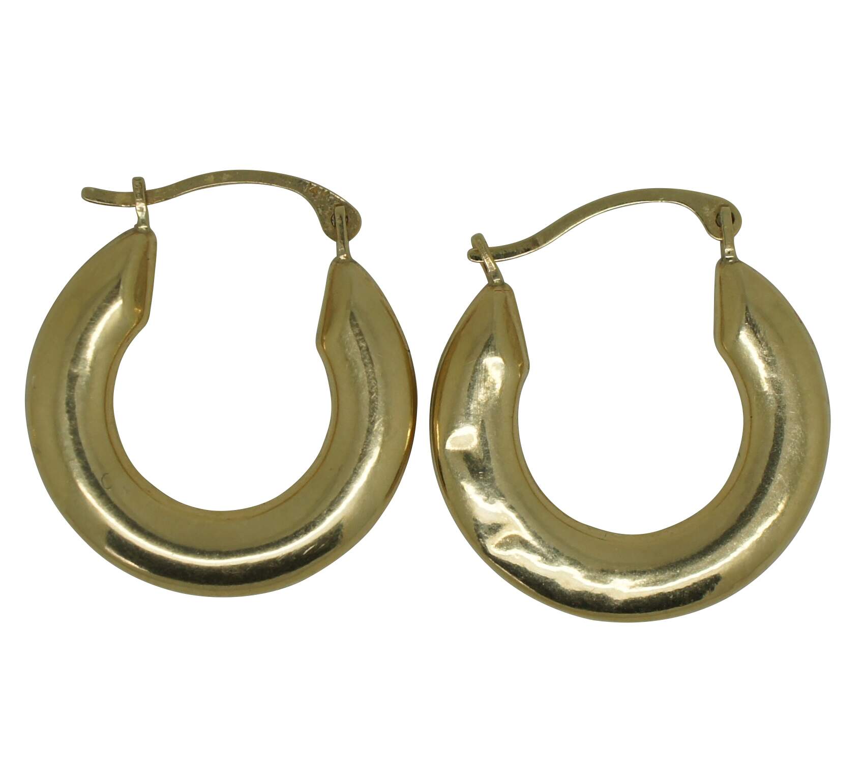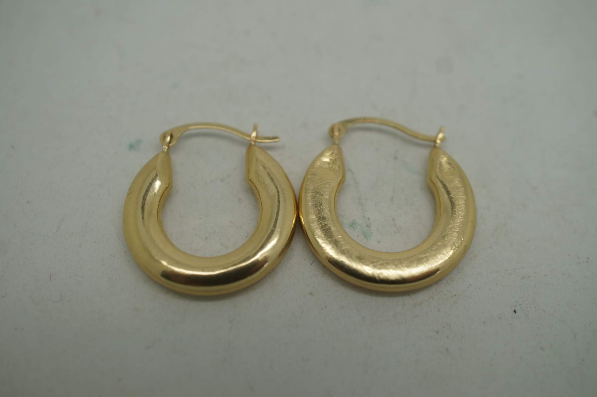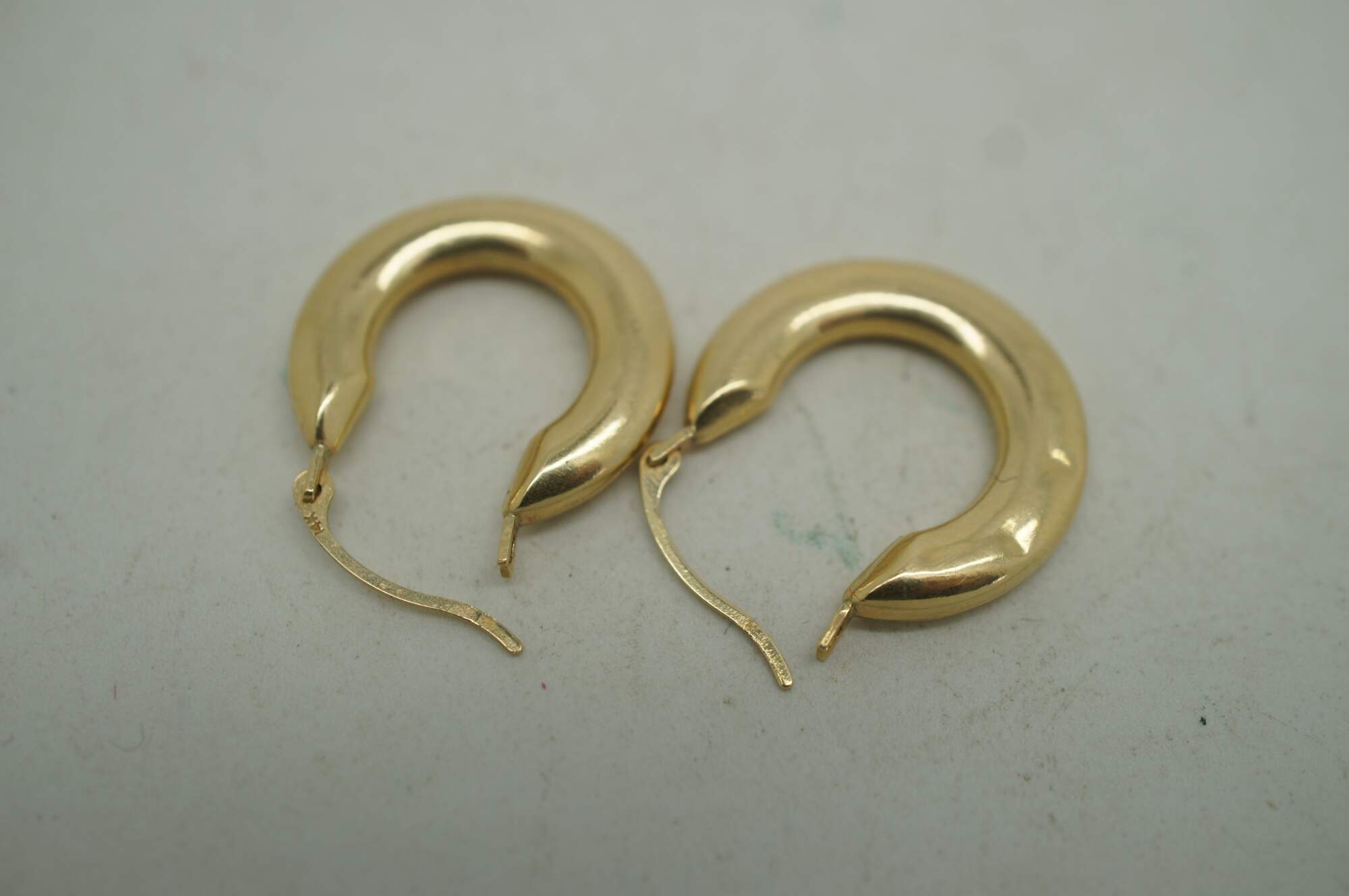 Two pairs of vintage 14k yellow gold hollow / puffy hoop earrings, one more oval and the other more circular, with hinged loop earring backs.