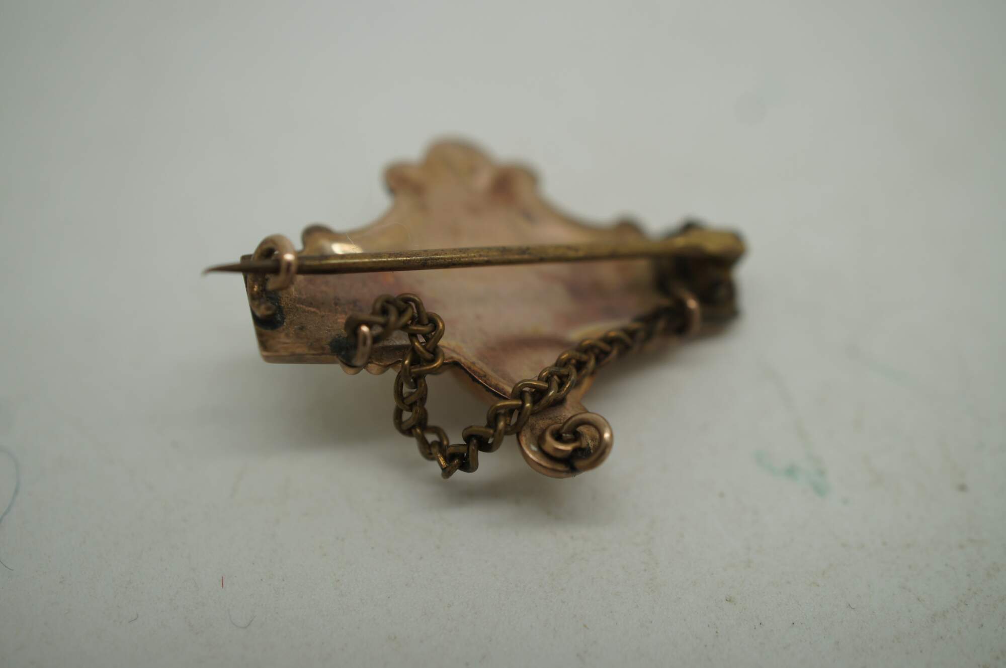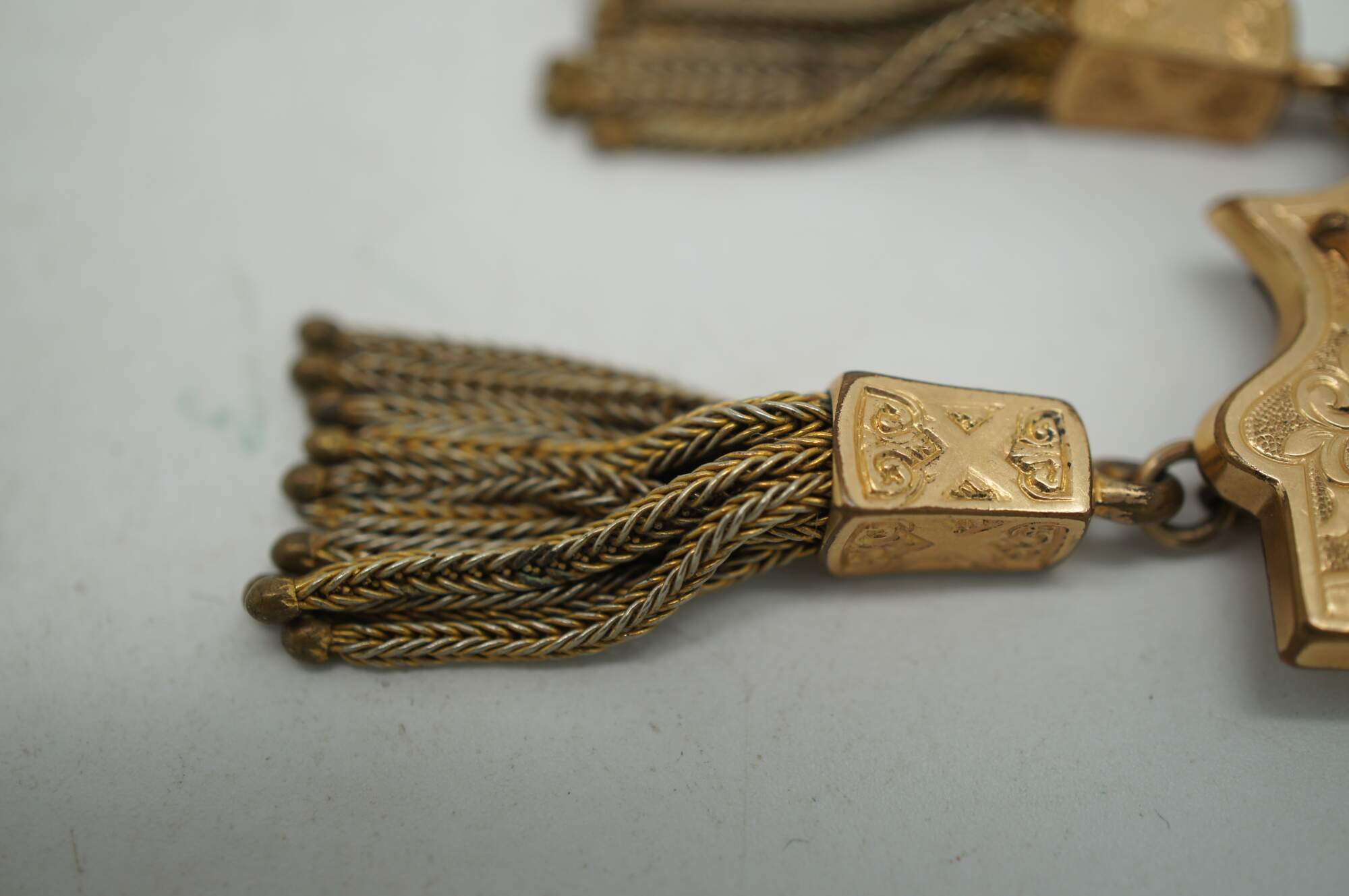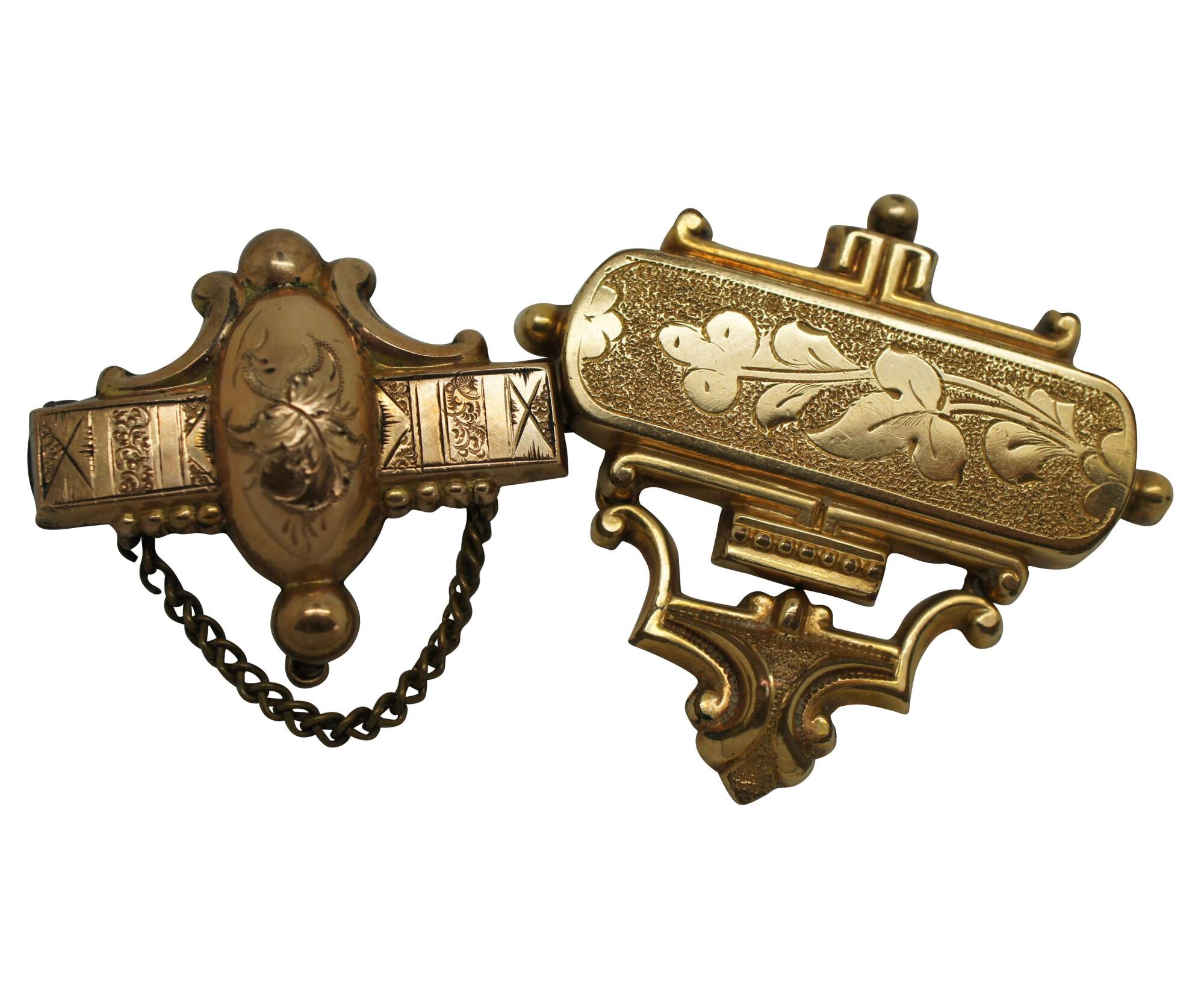 Set of antique Victorian art nouveau jewelry pieces in gold filled or gilded brass. Two pins / brooches and one pendant. All beautifully etched and decorated and appear to be missing a component or dangle at the lower center point.