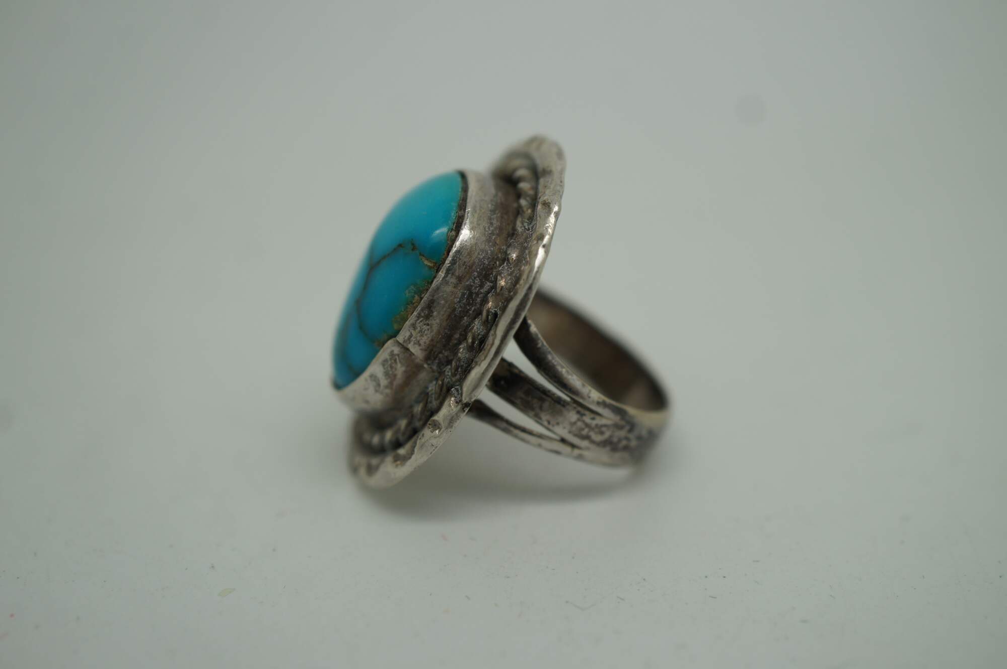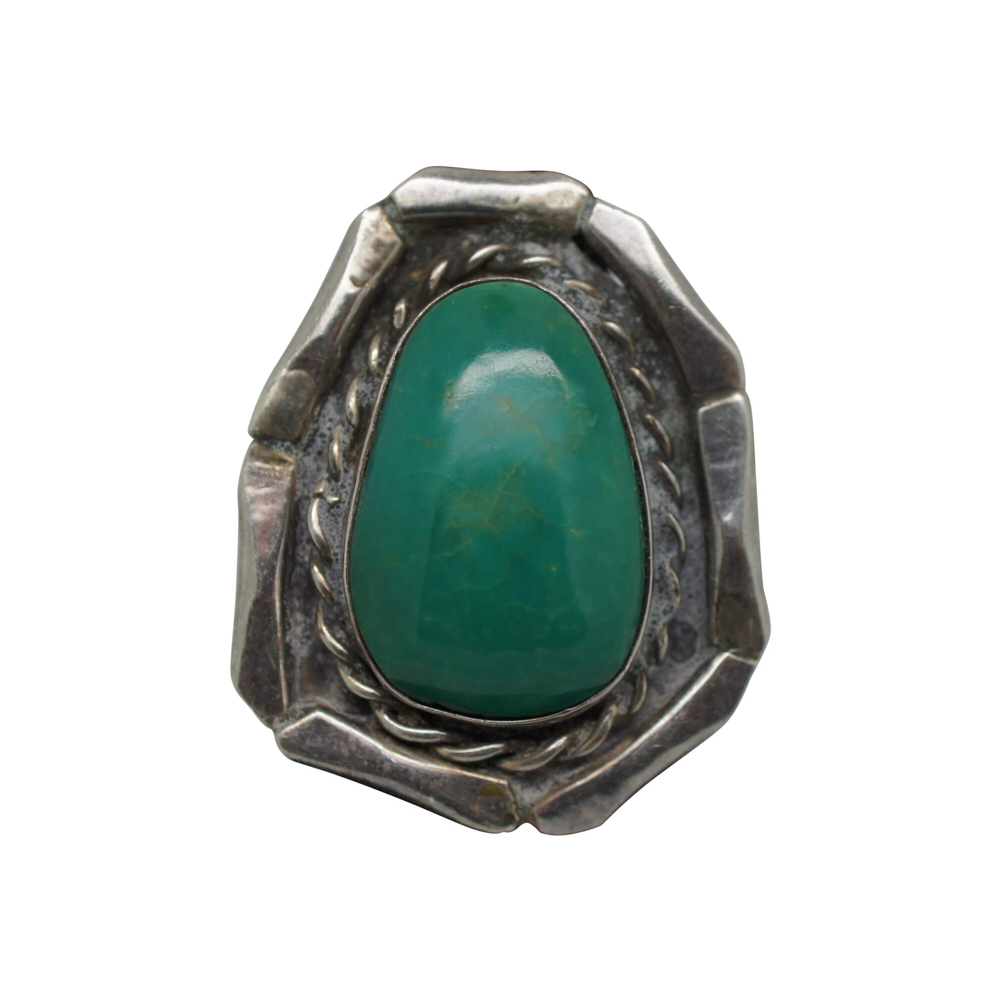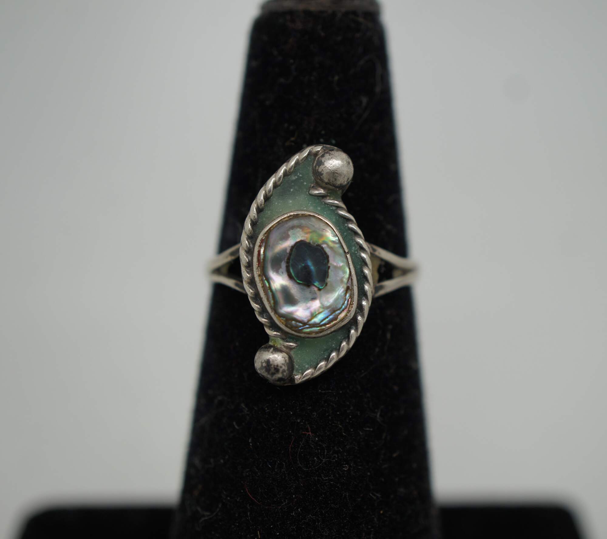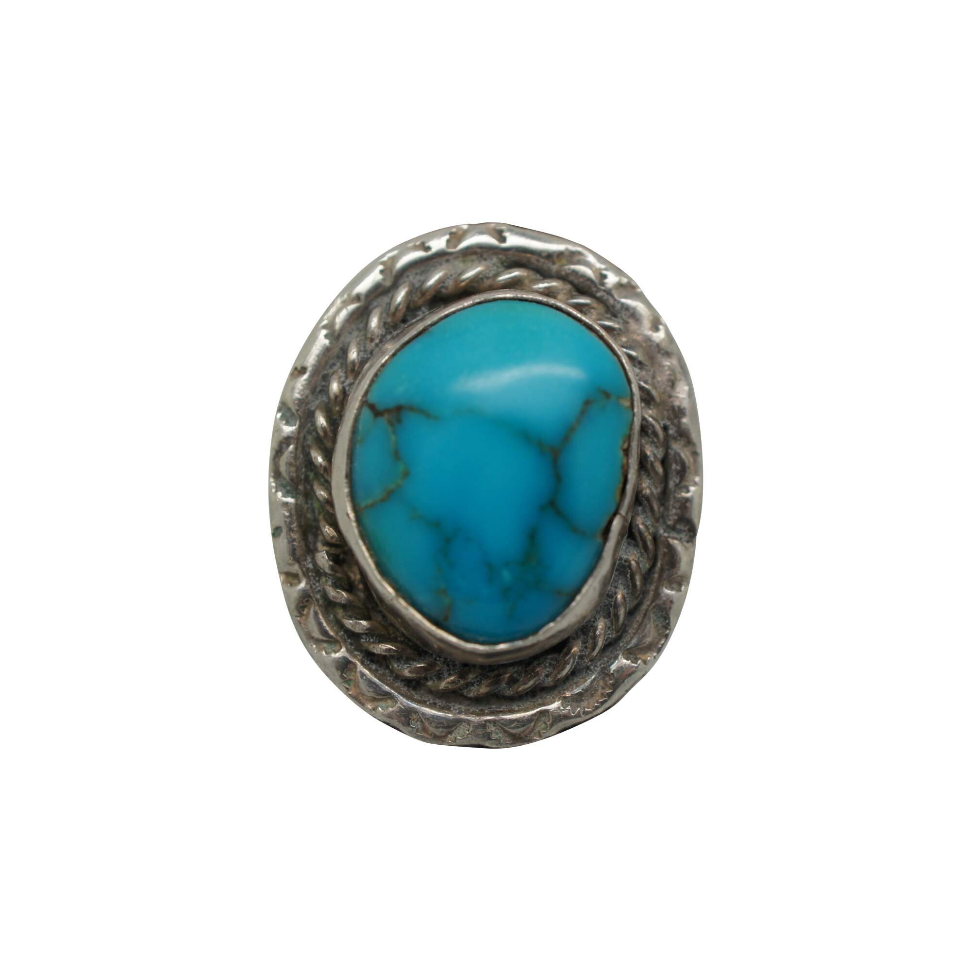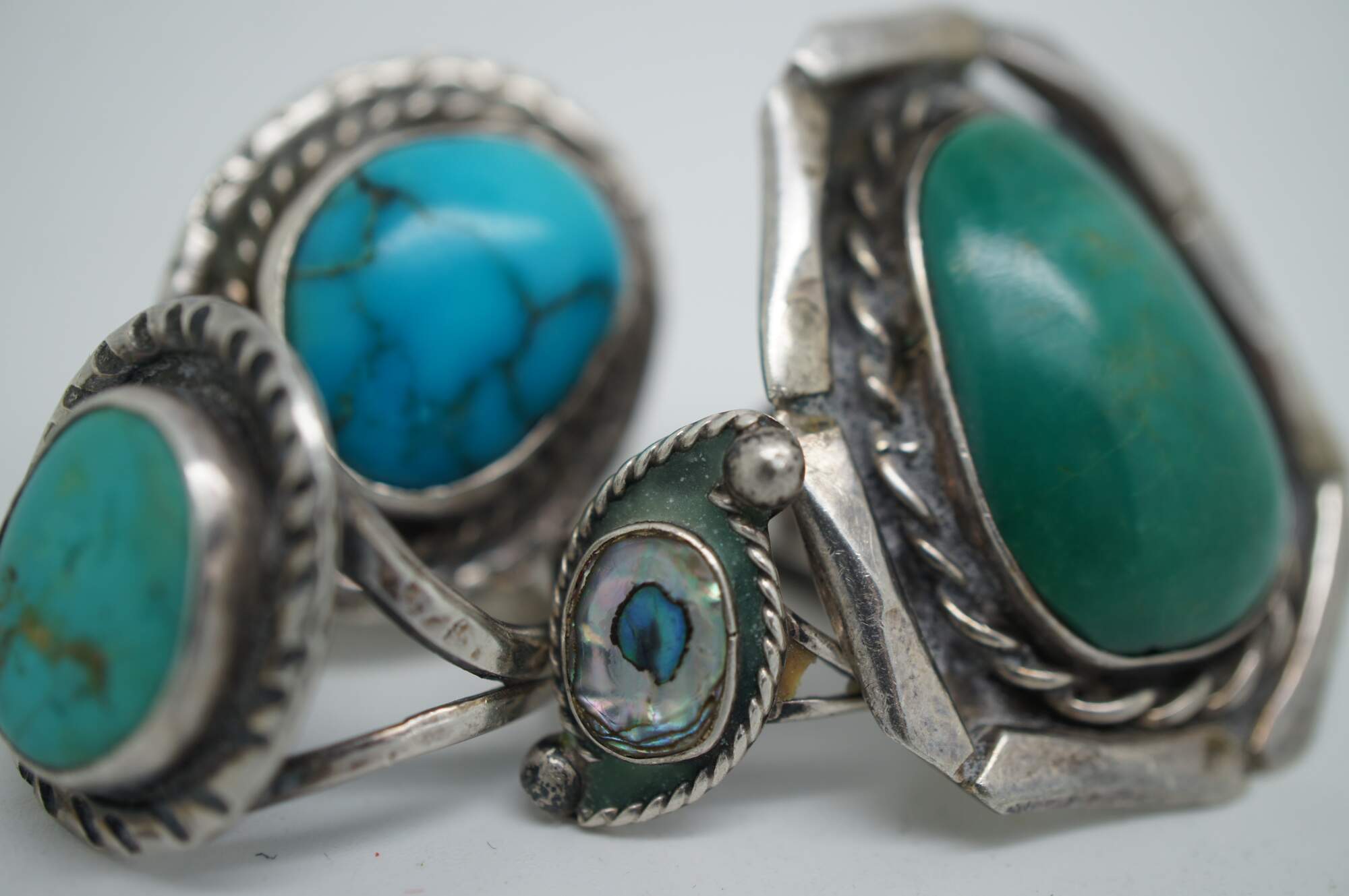 Vintage Southwestern / Native American style sterling silver cocktail rings set with turquoise and abalone shell and rope twist design.