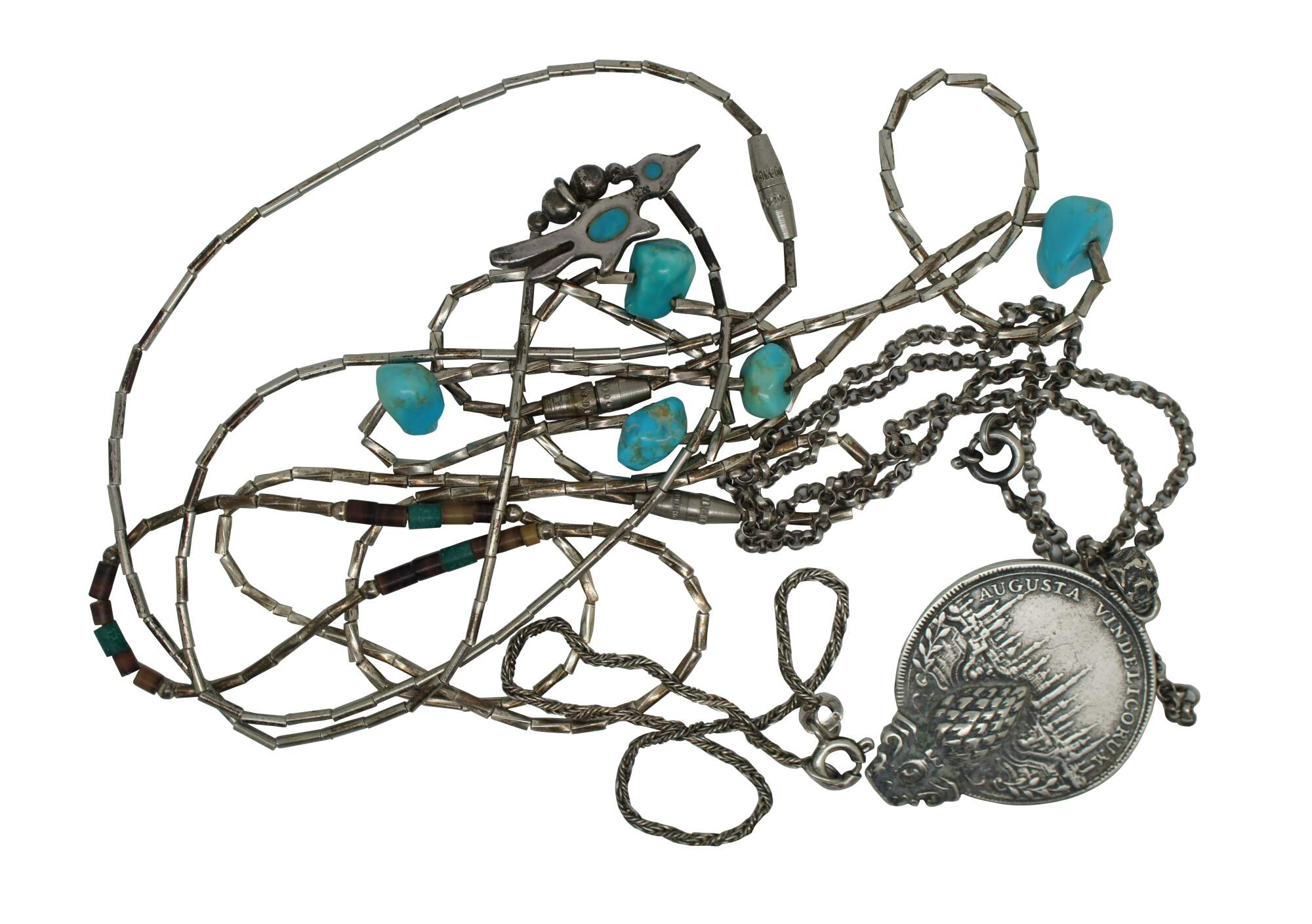 Lot of five vintage Southwestern / Native American style jewelry including a rolo chain necklace hung with an 835 silver embellished Franciscus I coin, silver beaded necklace with turquoise and heishi (shell) beads, silver beaded necklace with turquoise accented roadrunner charm, silver beaded necklace with turquoise nuggets, and one sterling silver rope chain bracelet.