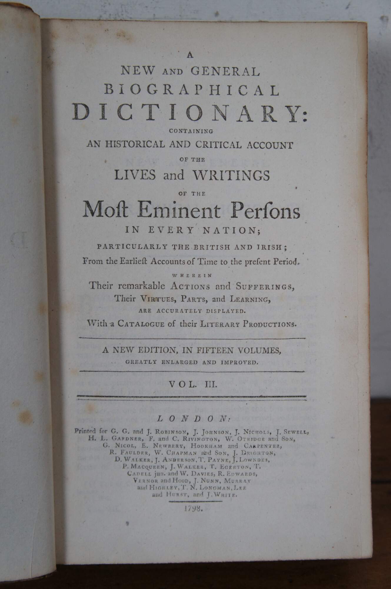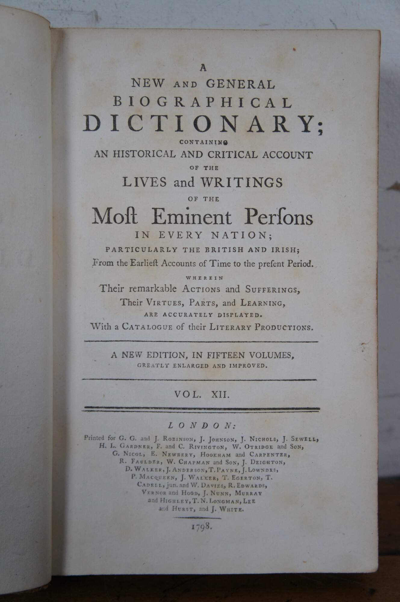 - 1798 – A New and General Biographical Dictionary: containing An Historical and Critical Account of the Lives and Writings of the Most Eminent Persons in Every Nation, etc – A New Edition, in Fifteen Volumes, Greatly enlarged and Improved – Volume III & Volume XII – London Printed for G.G. and J. Robinson, etc -