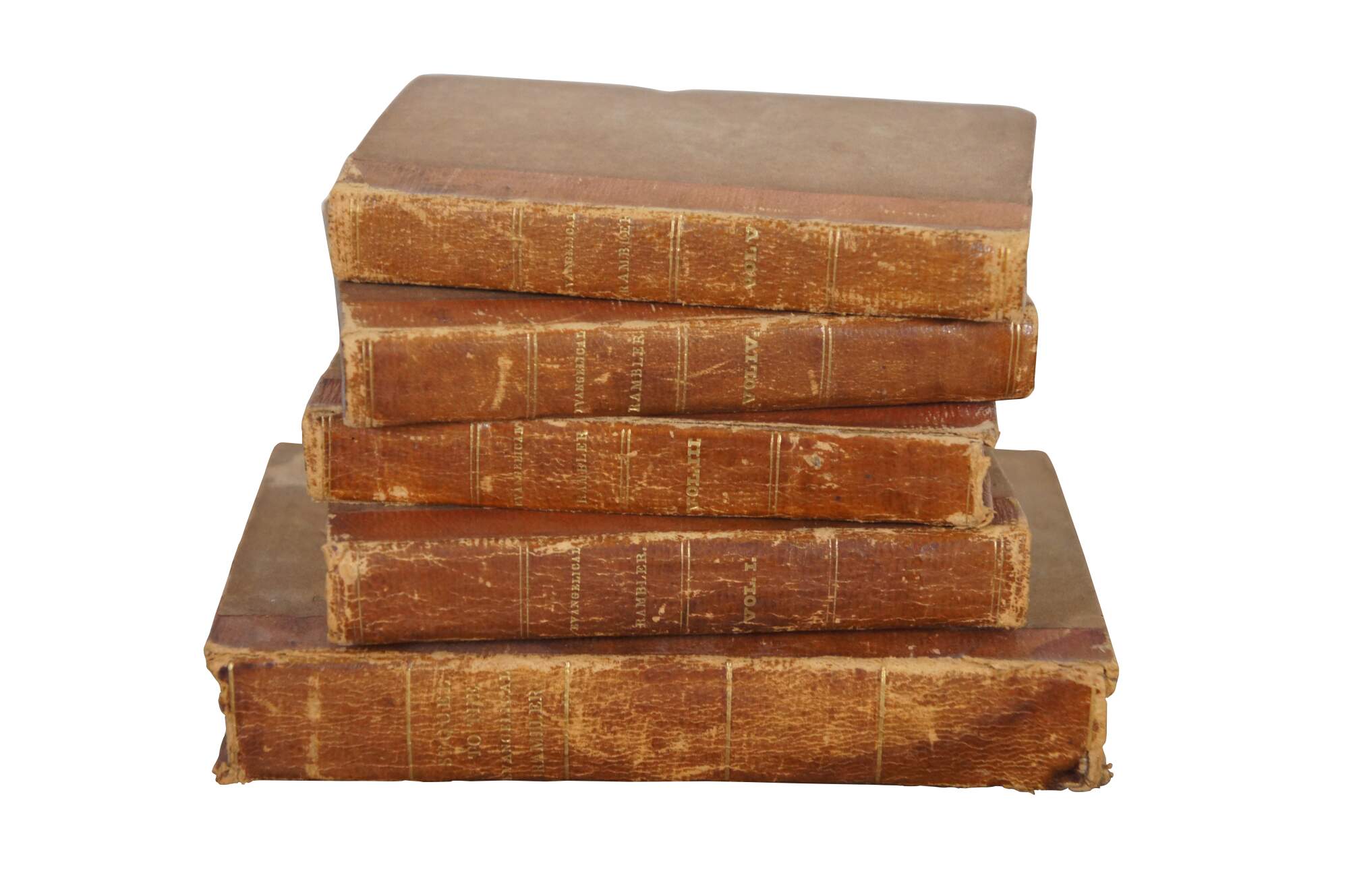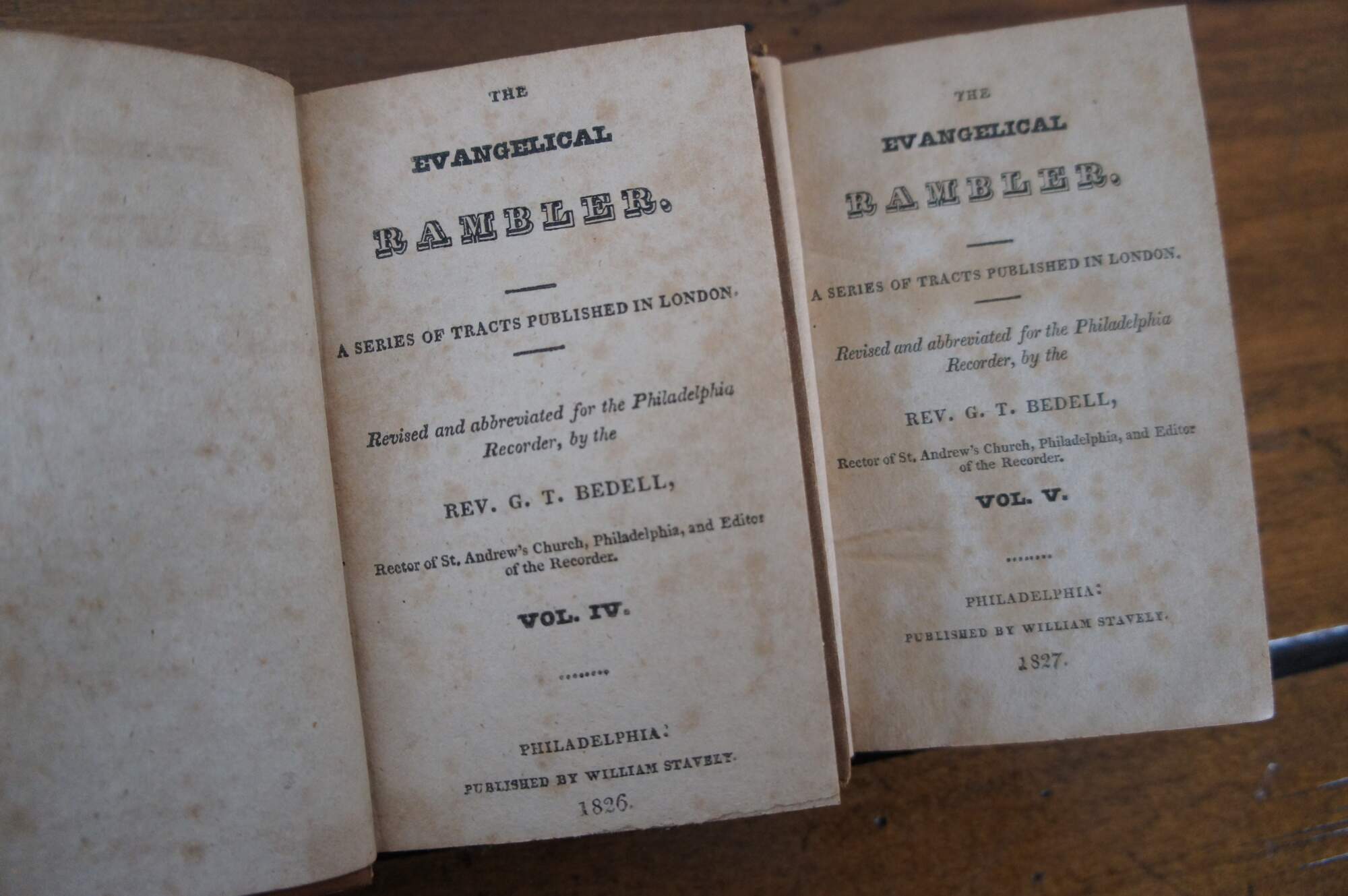 Set of five antique early 19th century hard cover books featuring paper boards and leather spines, including the four volume base set and sequel to The Evangelical Rambler.