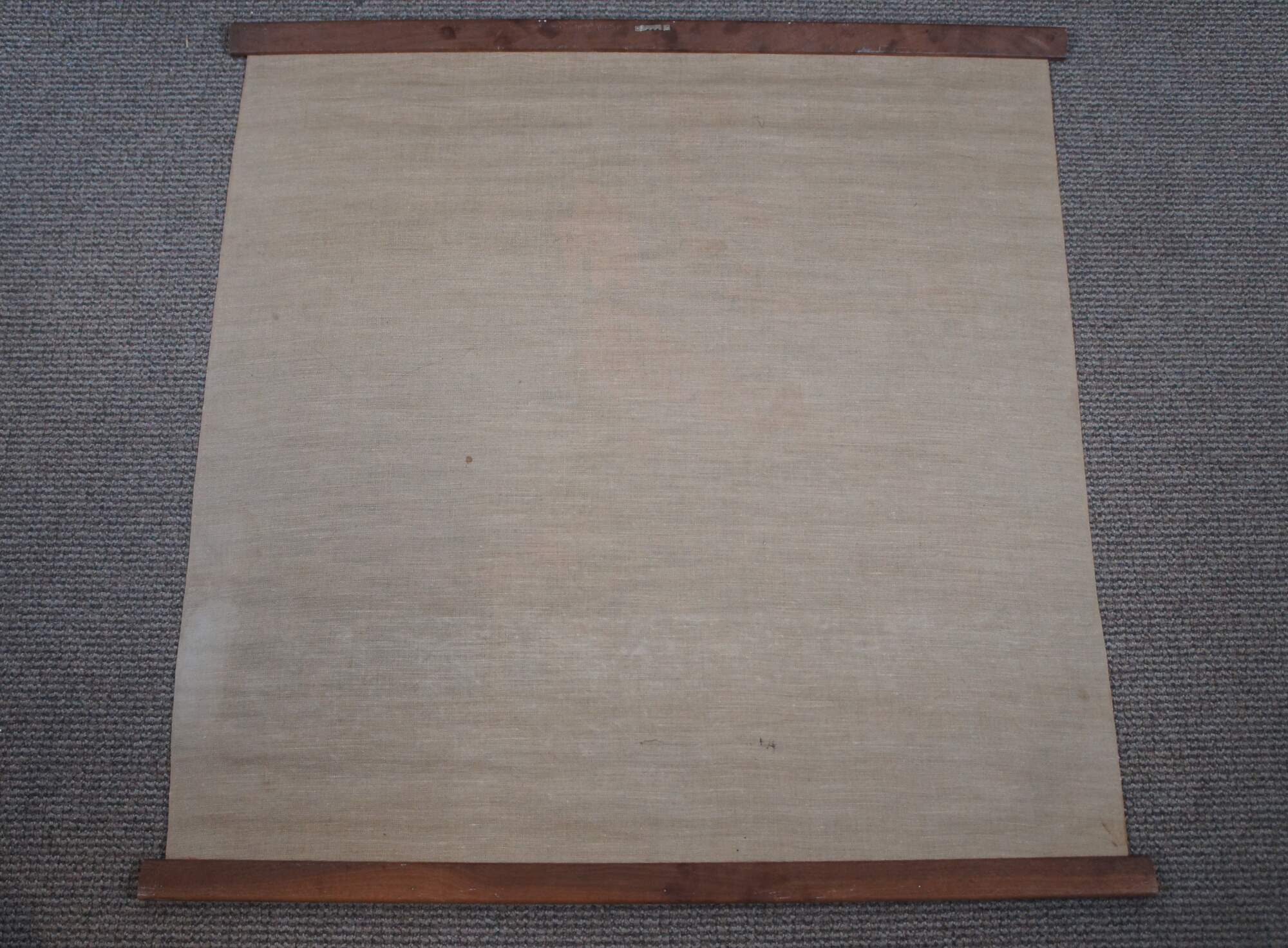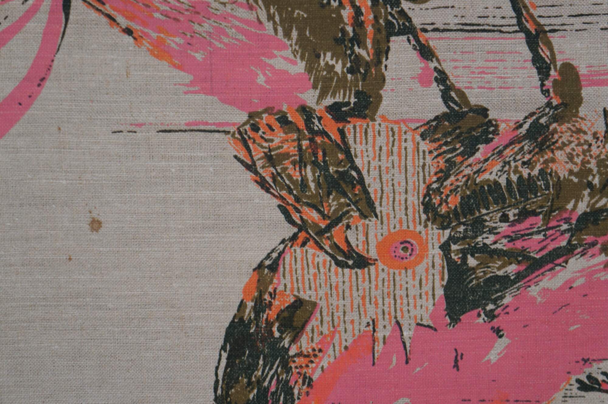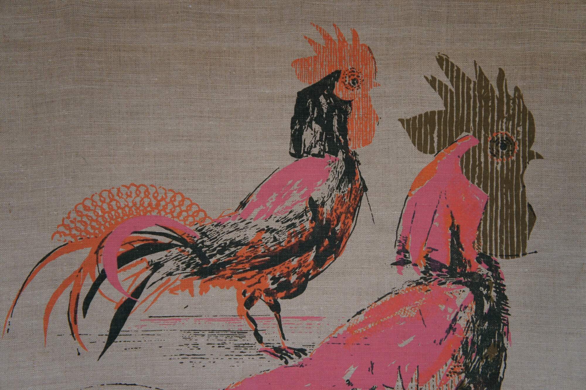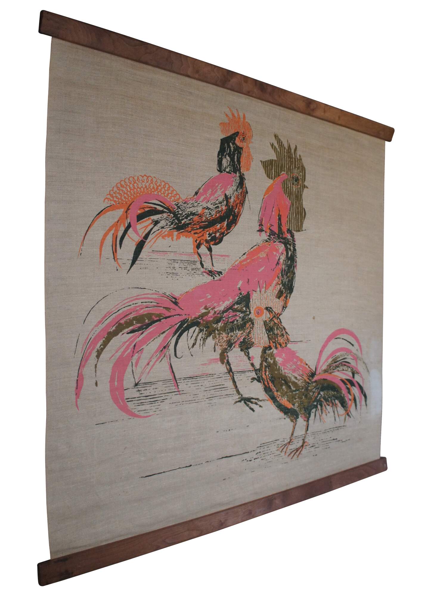 Mid-Century Tom Tru Studios wall hanging tapestry wall art screenprint linen titled Chanticleer designed by Robert Bushong, distributed by Raymor. Fall 1959 Catalog number C55, variation C showing a trio of cocks / roosters / chickens printed in Orange, Shocking (Pink), Charcoal, and Hunter Green on Natural Linen, with simple wooden supports along the upper and lower edges. Chanticleer is the name used for roosters, especially in fairy tales. Catalog included.