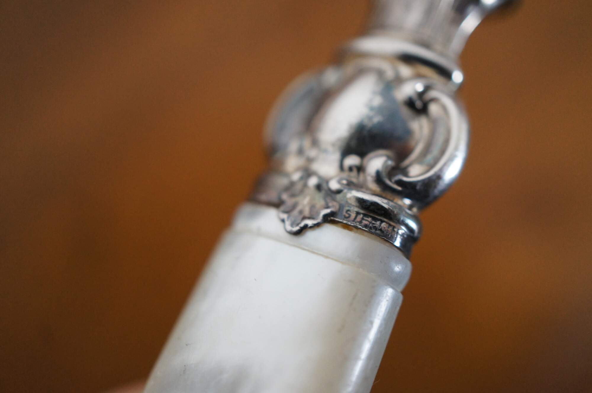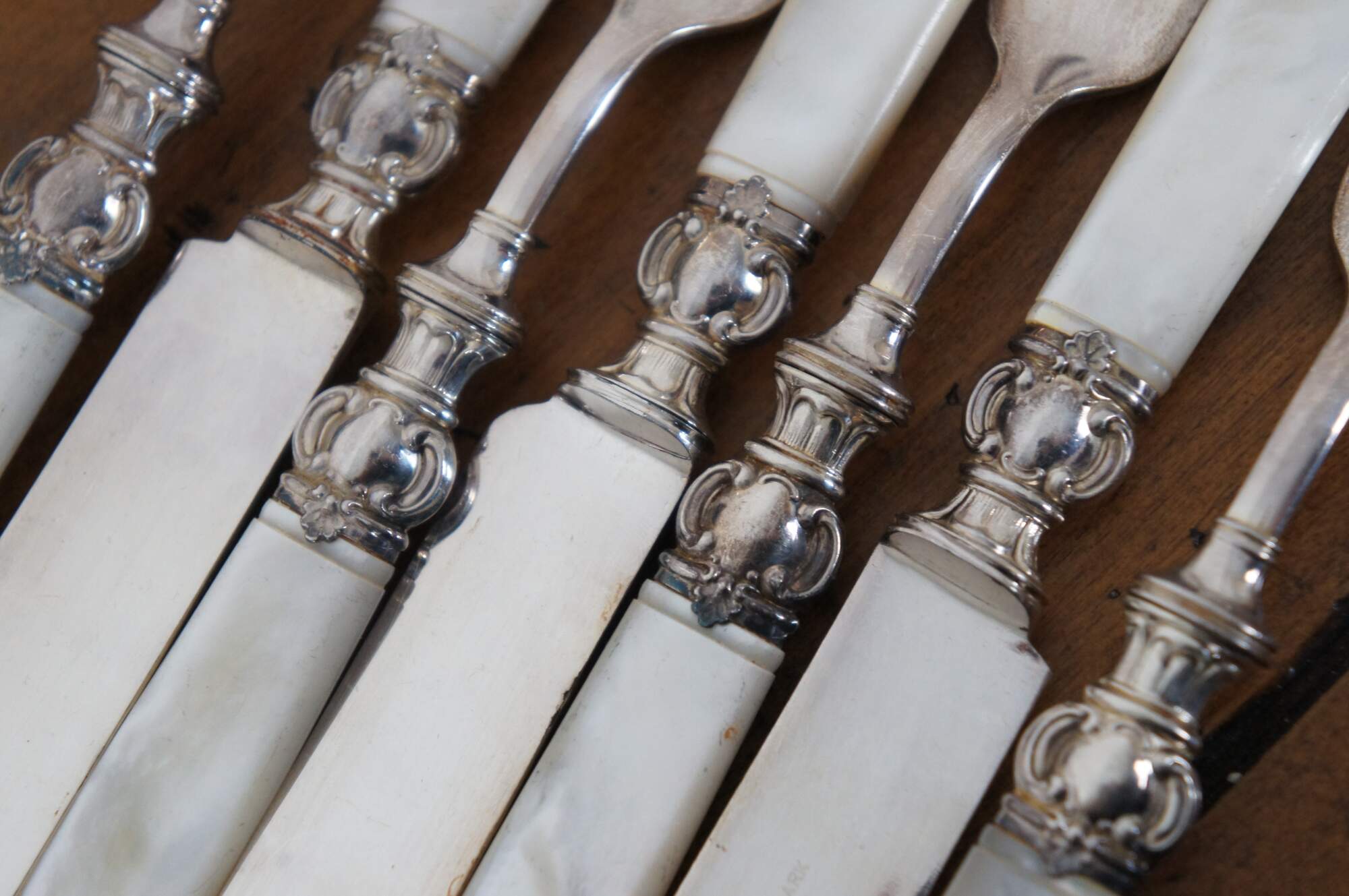 24 Piece antique set of Landers, Frary & Clark Aetna Works mother of pearl and sterling silver table knives and dinner forks.