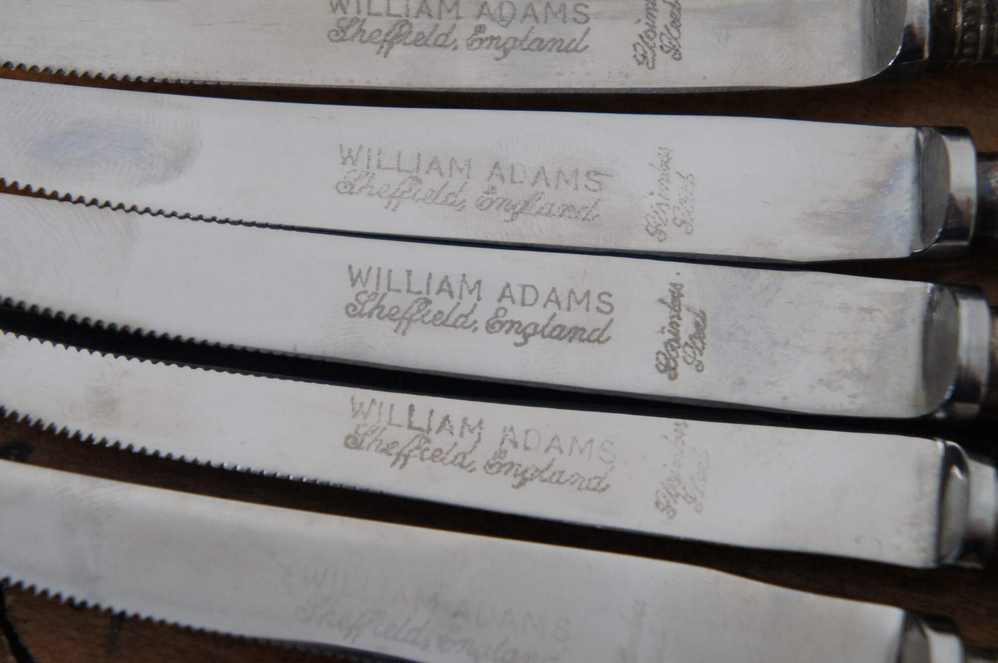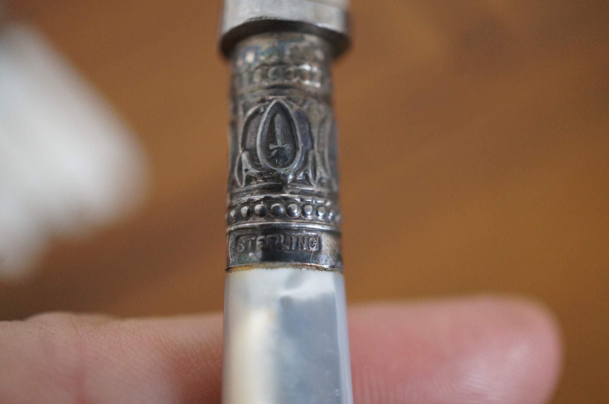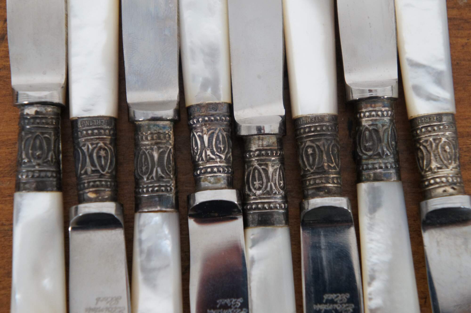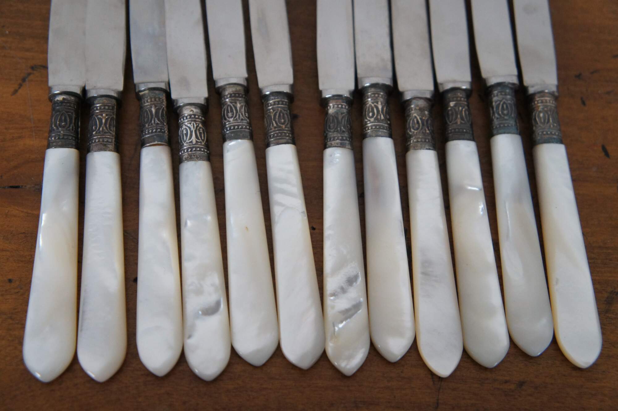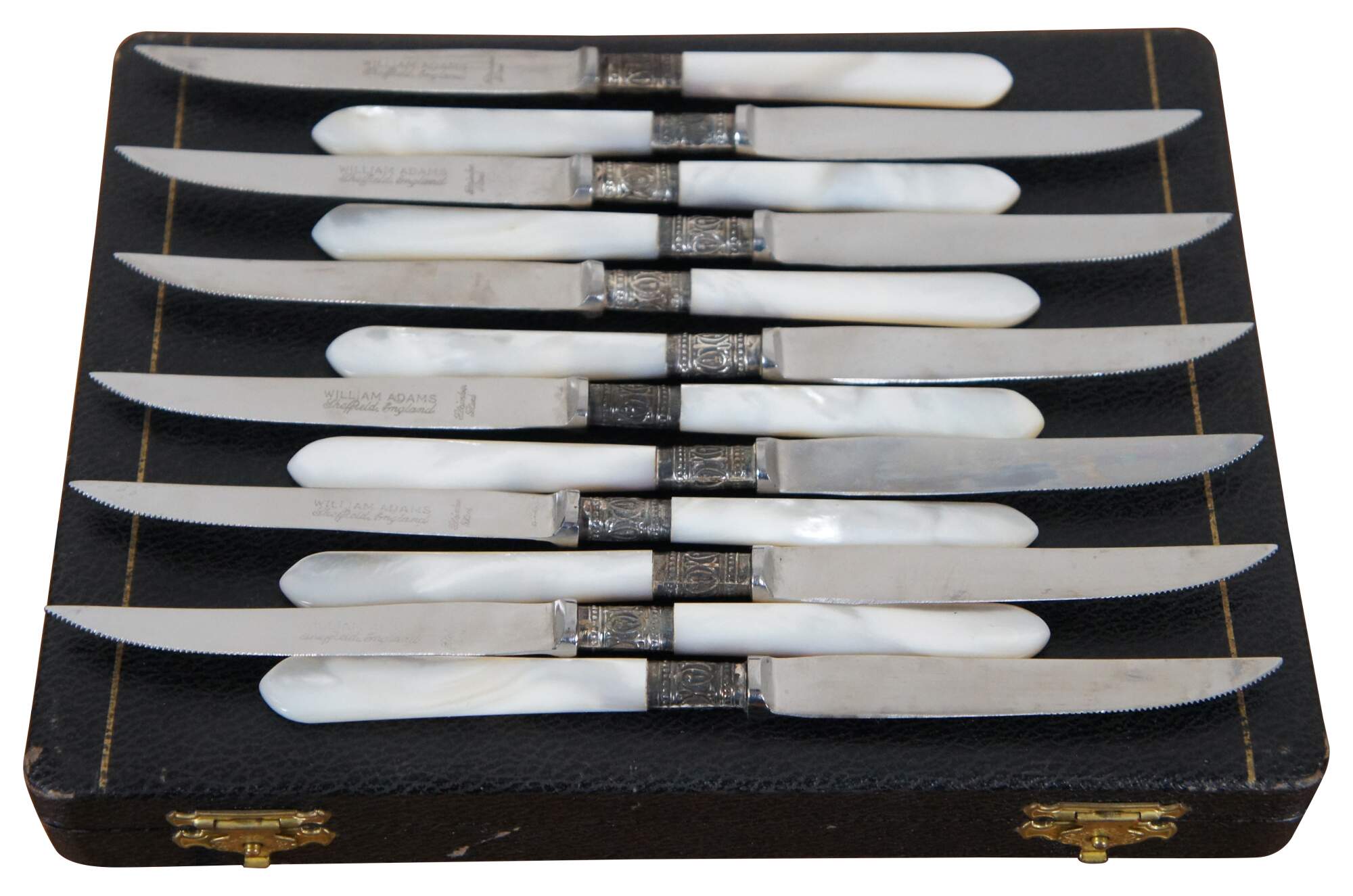 Set of 12 Antique fruit knives and box case by William Adams, featuring mother of pearl handles, sterling silver collars and stainless steel serrated tip blades.
