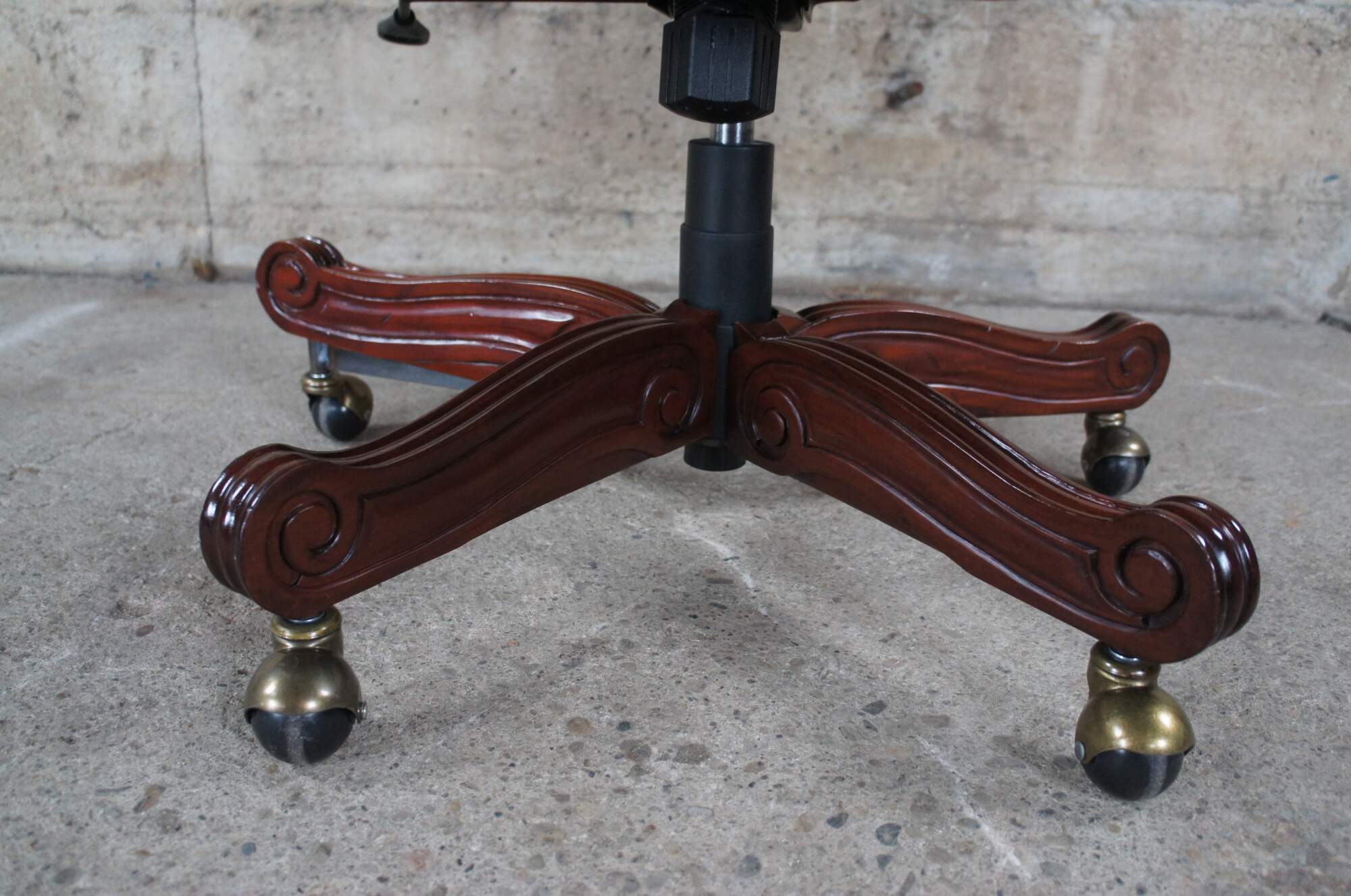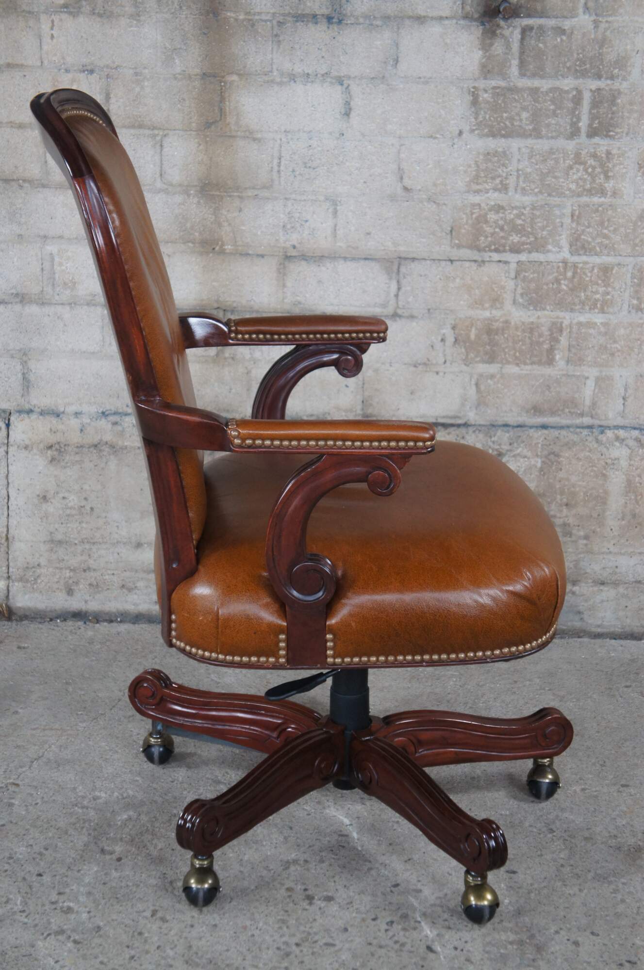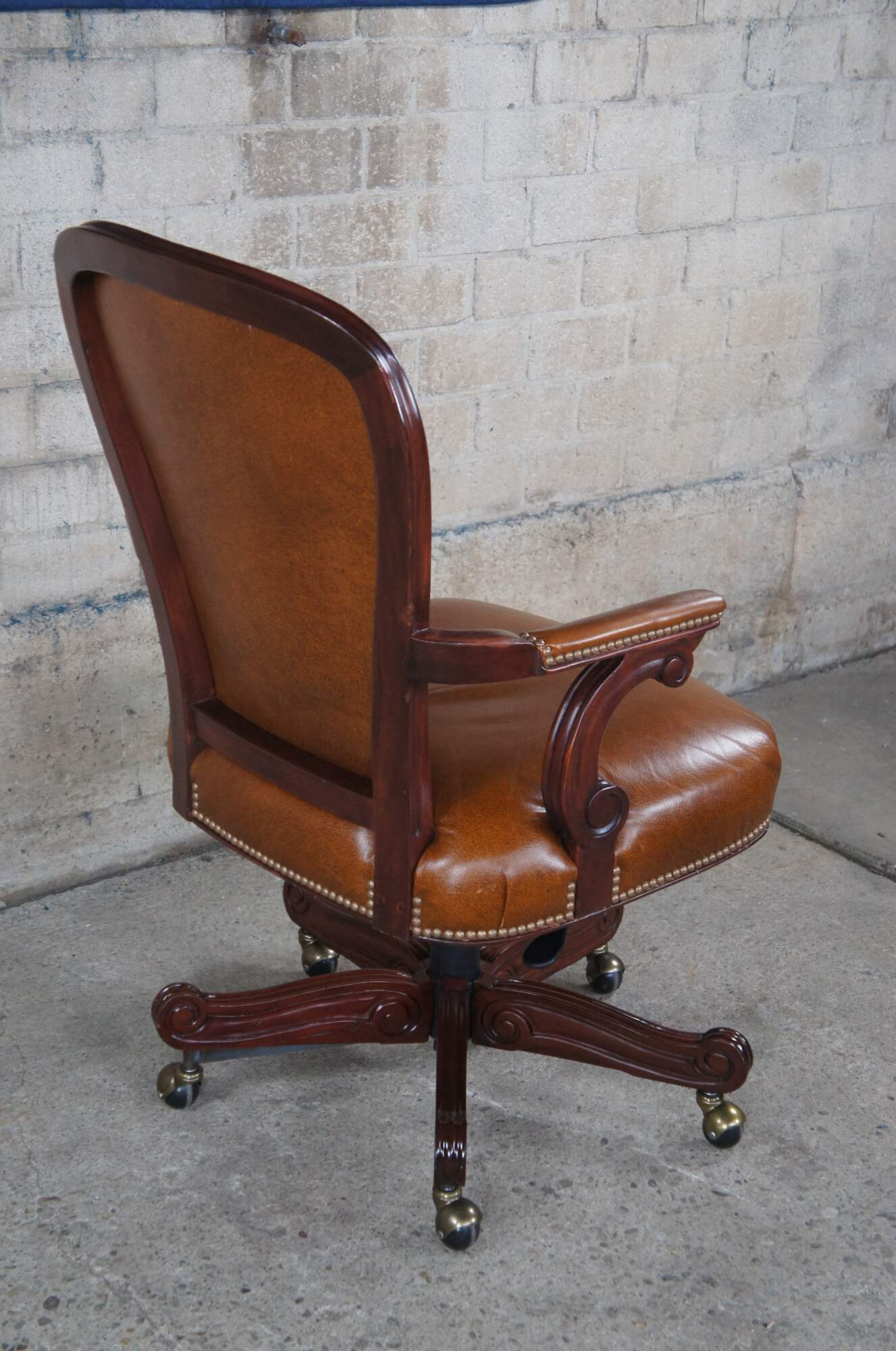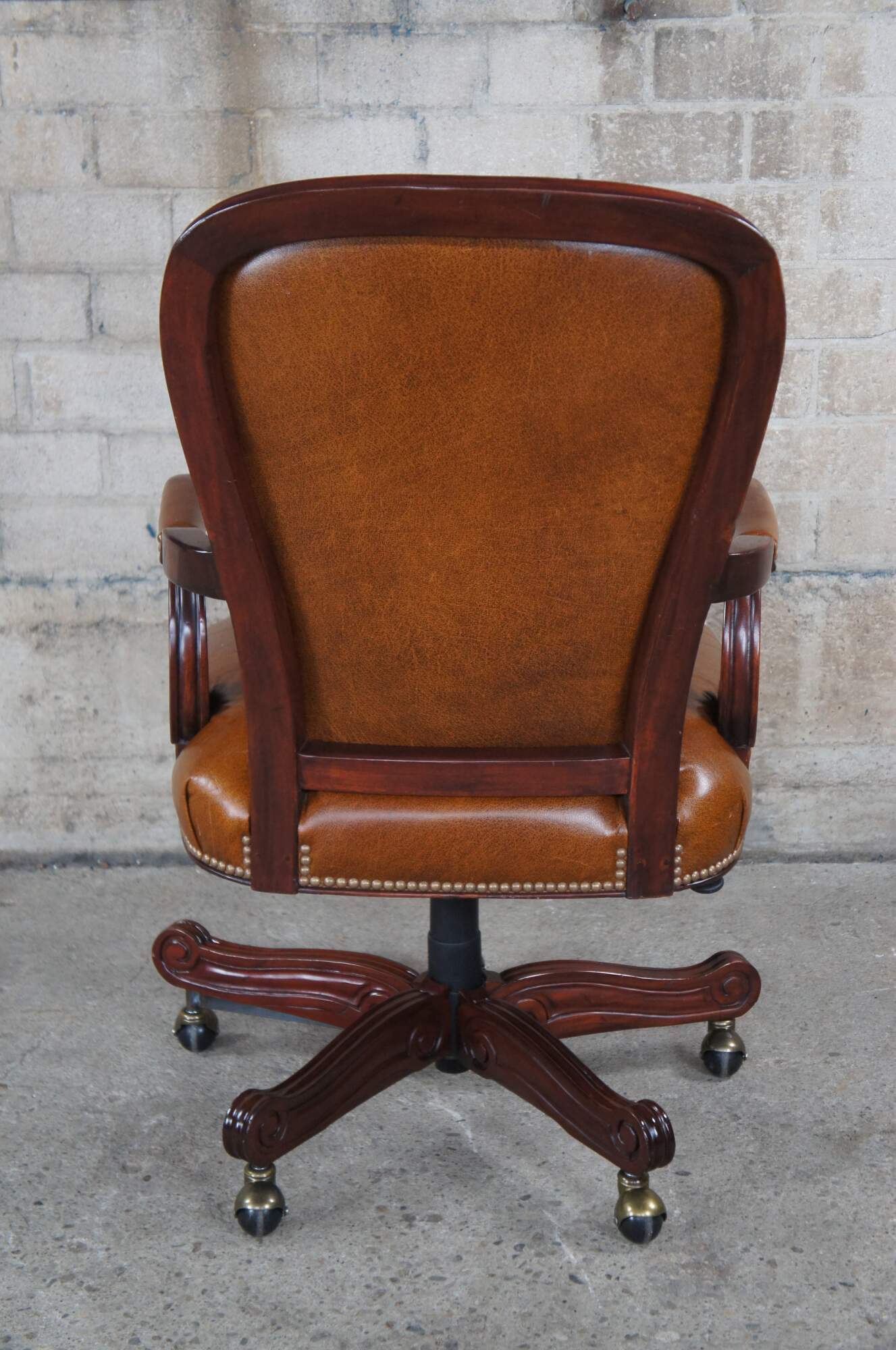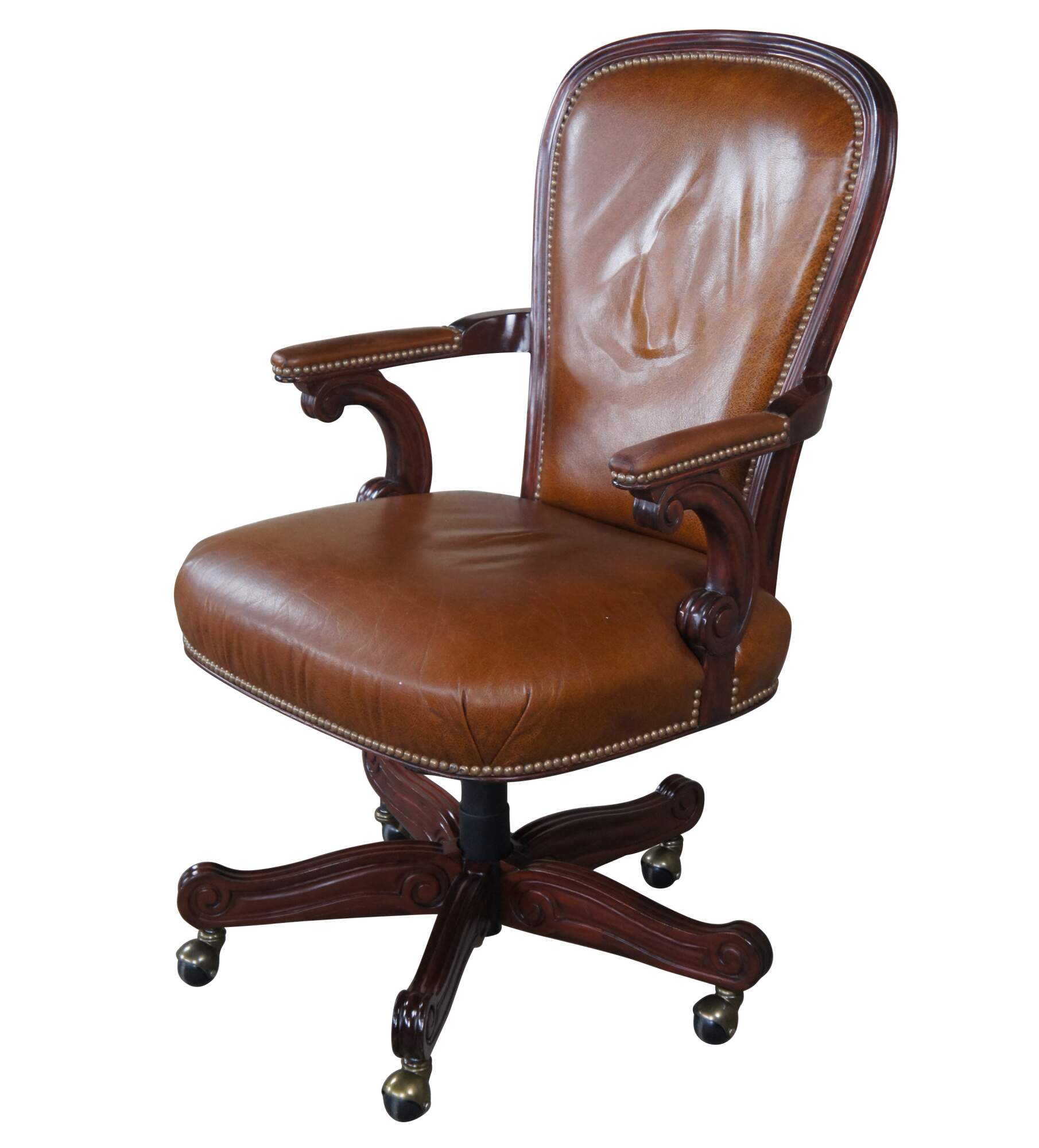 The Wiggins Executive Swivel Chair (SKU:693-27) by Leathercraft Furniture is a smooth and balanced piece that brings completeness to any home. Features a warm brown leather with nailhead trim. Made from beechwood with a mahogany finish.