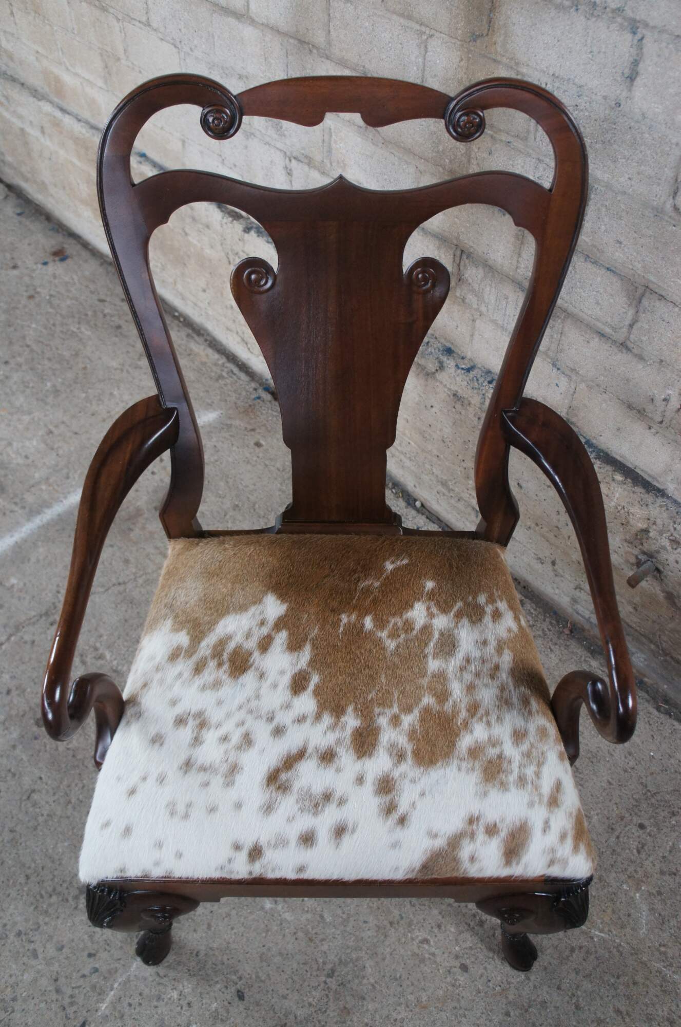 An exceptional pair of Vintage Ralph Lauren Henredon Beekman dining arm chairs. Made from mahogany in George II styling with serpentine pierced shoulder, vase shaped back, legs are crowned with carved shells and rest on hoof feet, while the rear legs posses bun feet acanthus accents. Seats are upholstered in cowhide. 1801-27