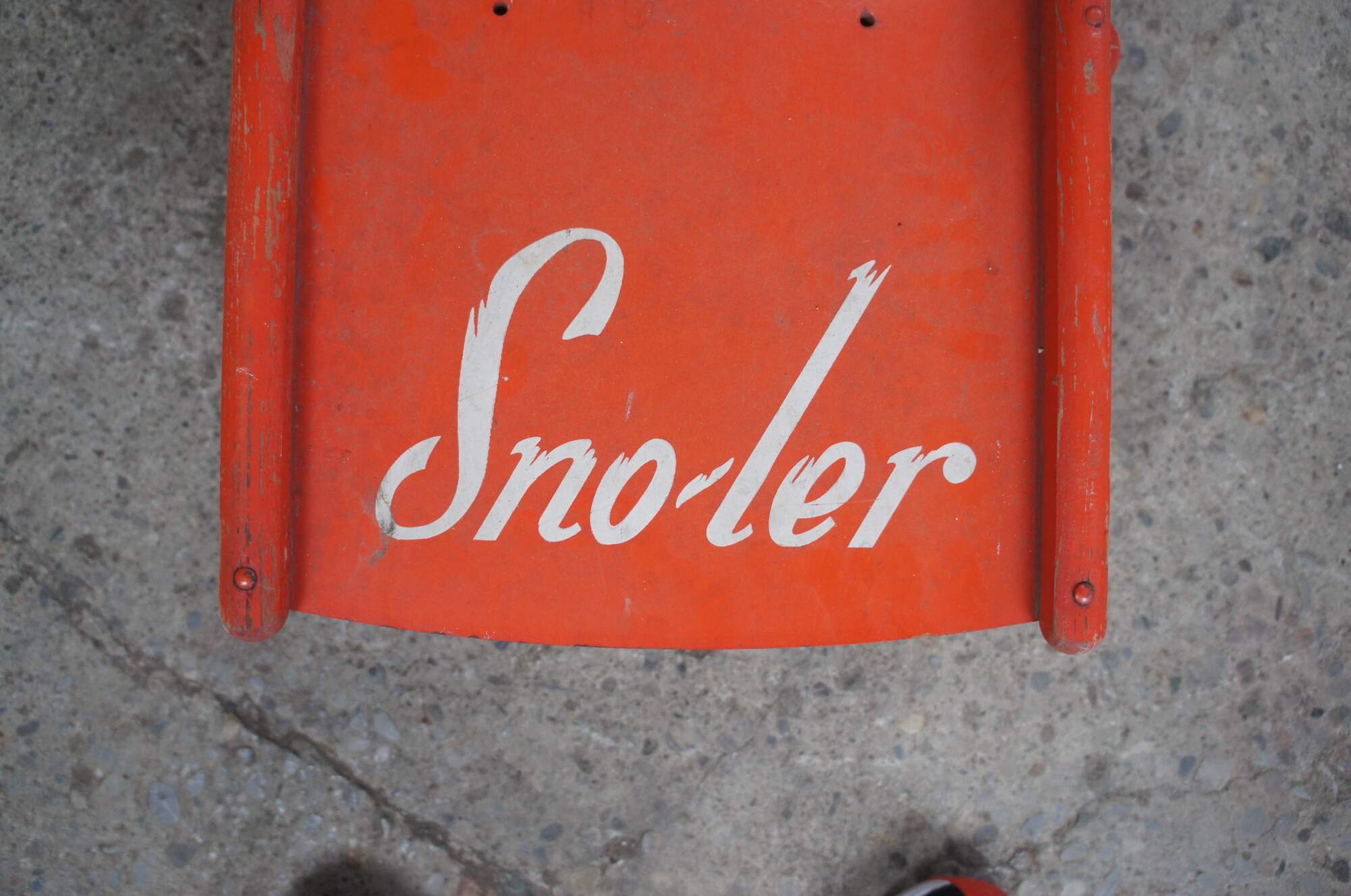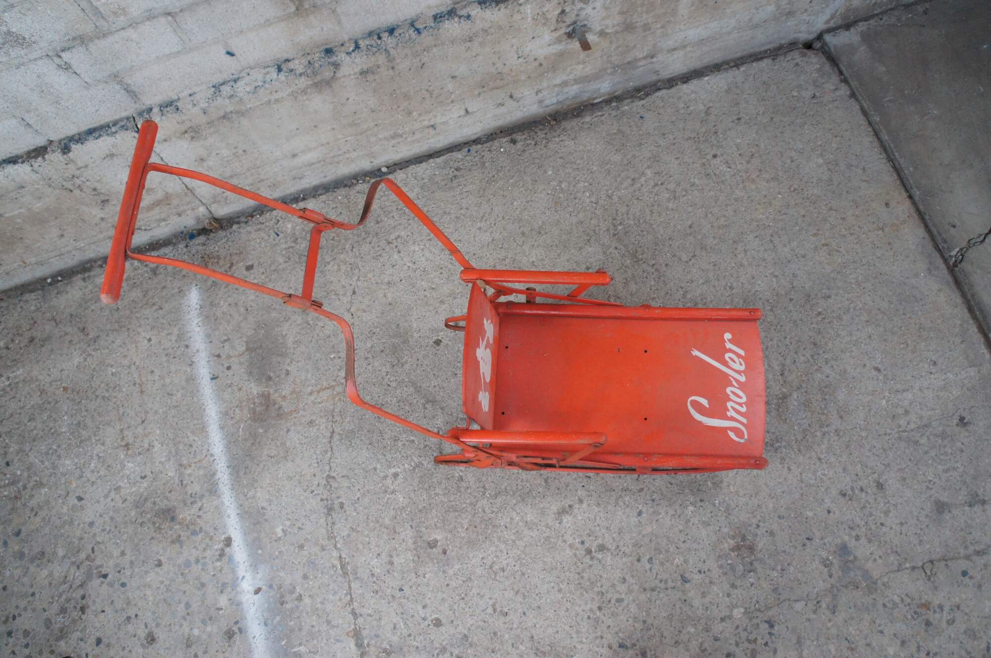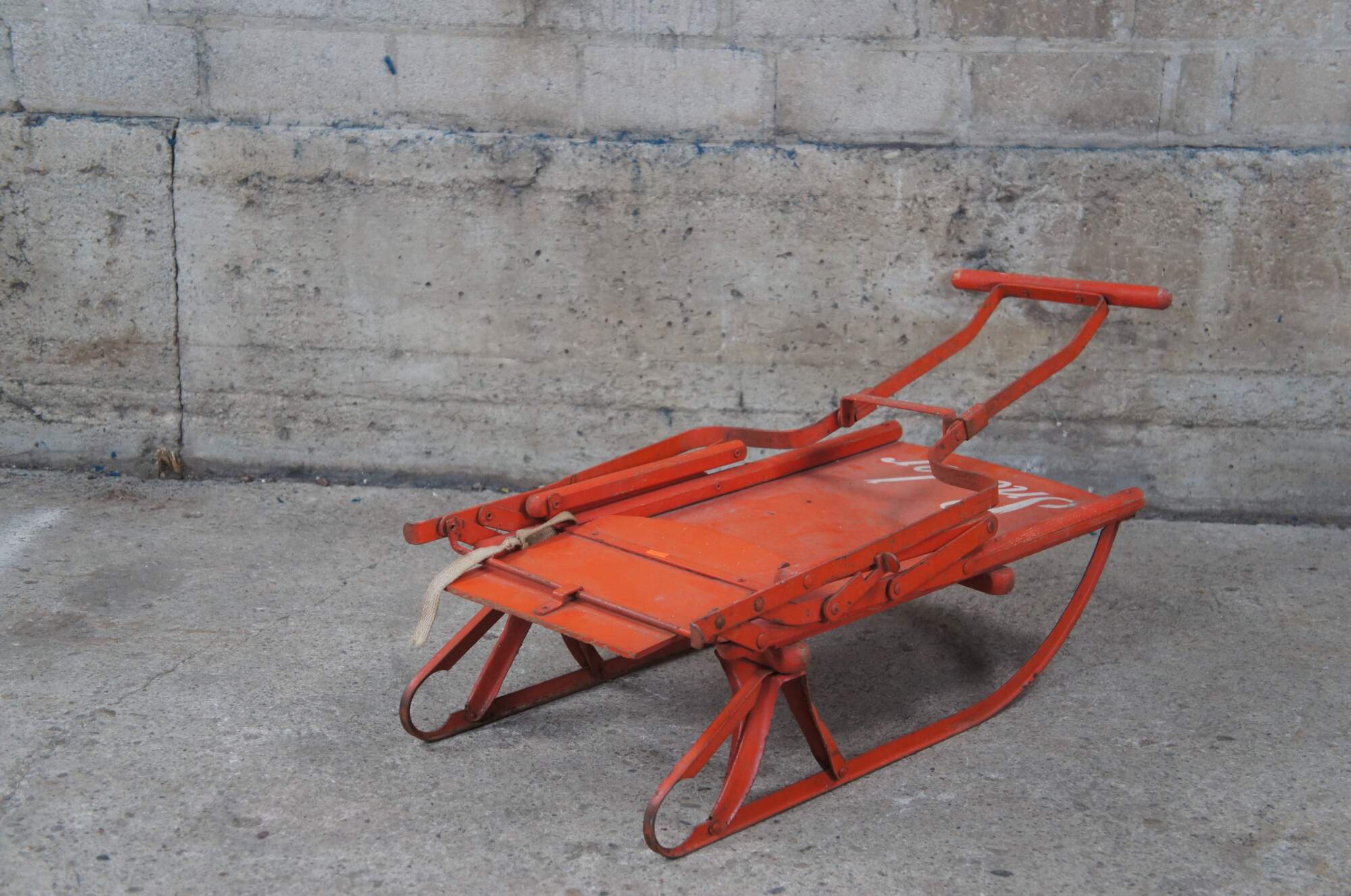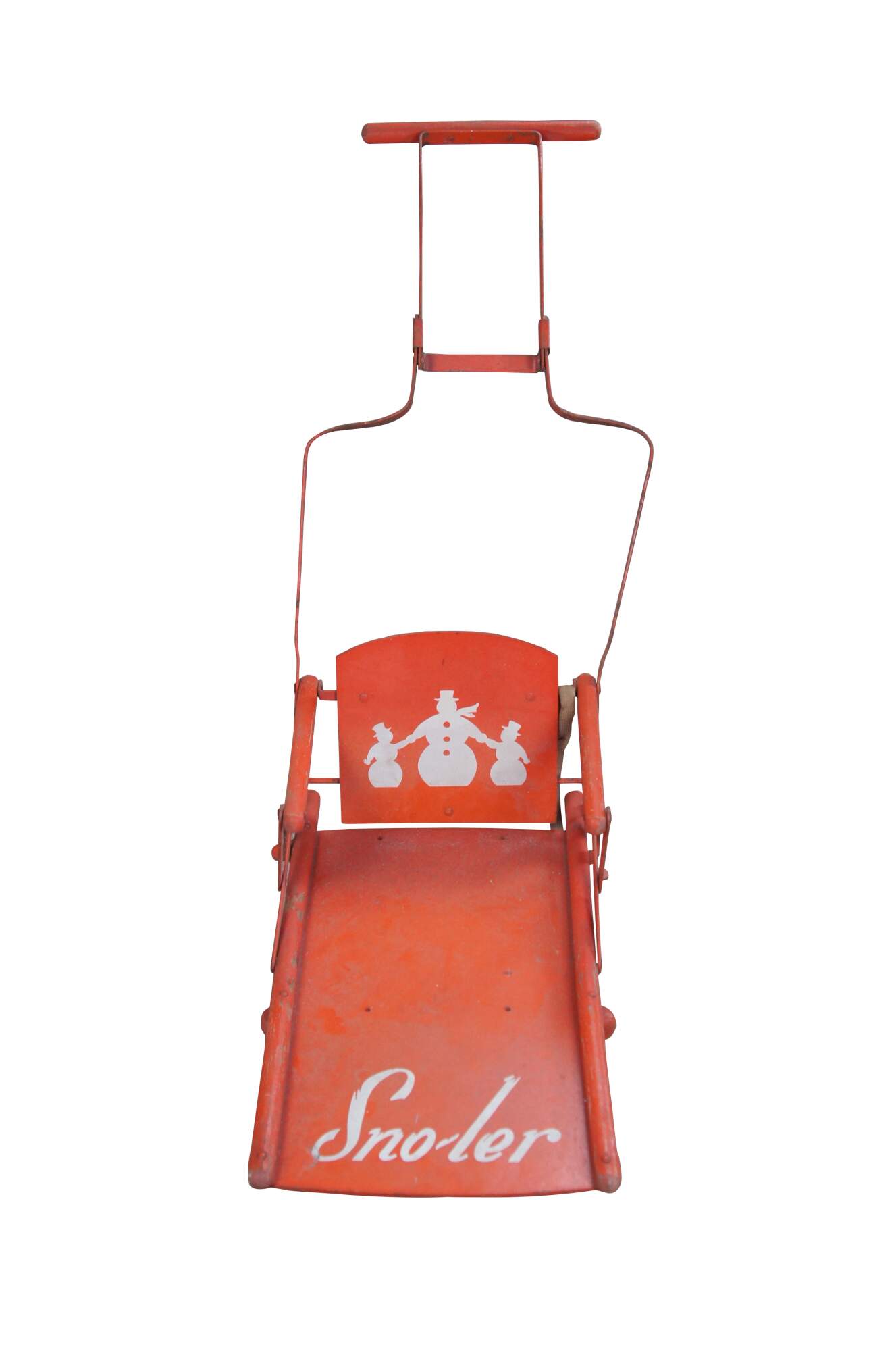 Vintage Sno-ler push sled, circa 1940s-50s. Made from wood with metal frame. Features a folding design allowing for ease of storage.