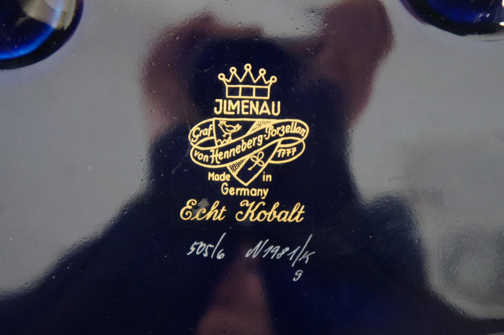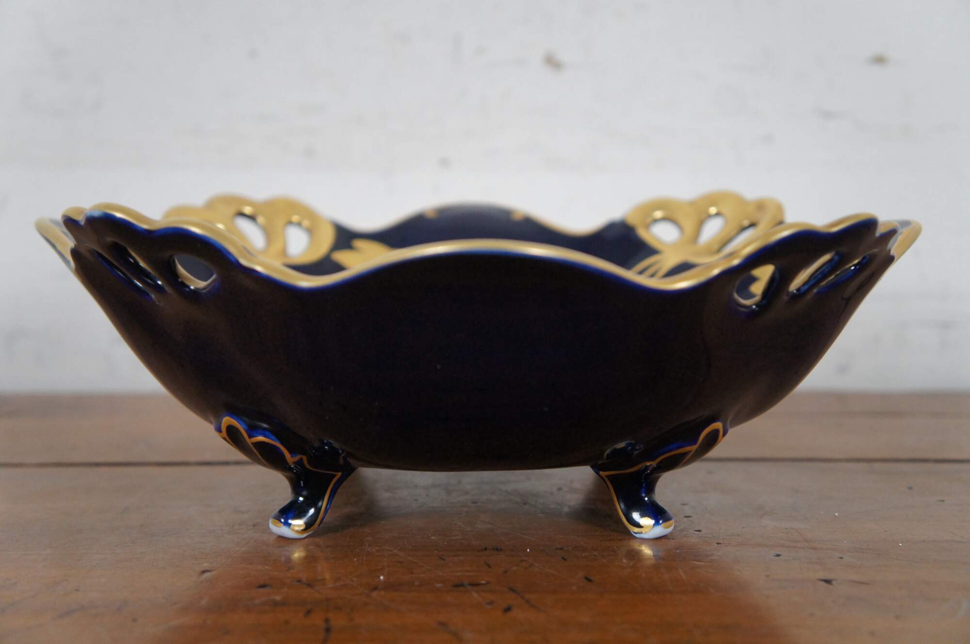 Vintage Graf von Henneberg Porzellan Echt Kobalt centerpiece bowl with pierced, scalloped edges, small cabriole feet, and 22k gold painted floral details on a deep cobalt blue surface.