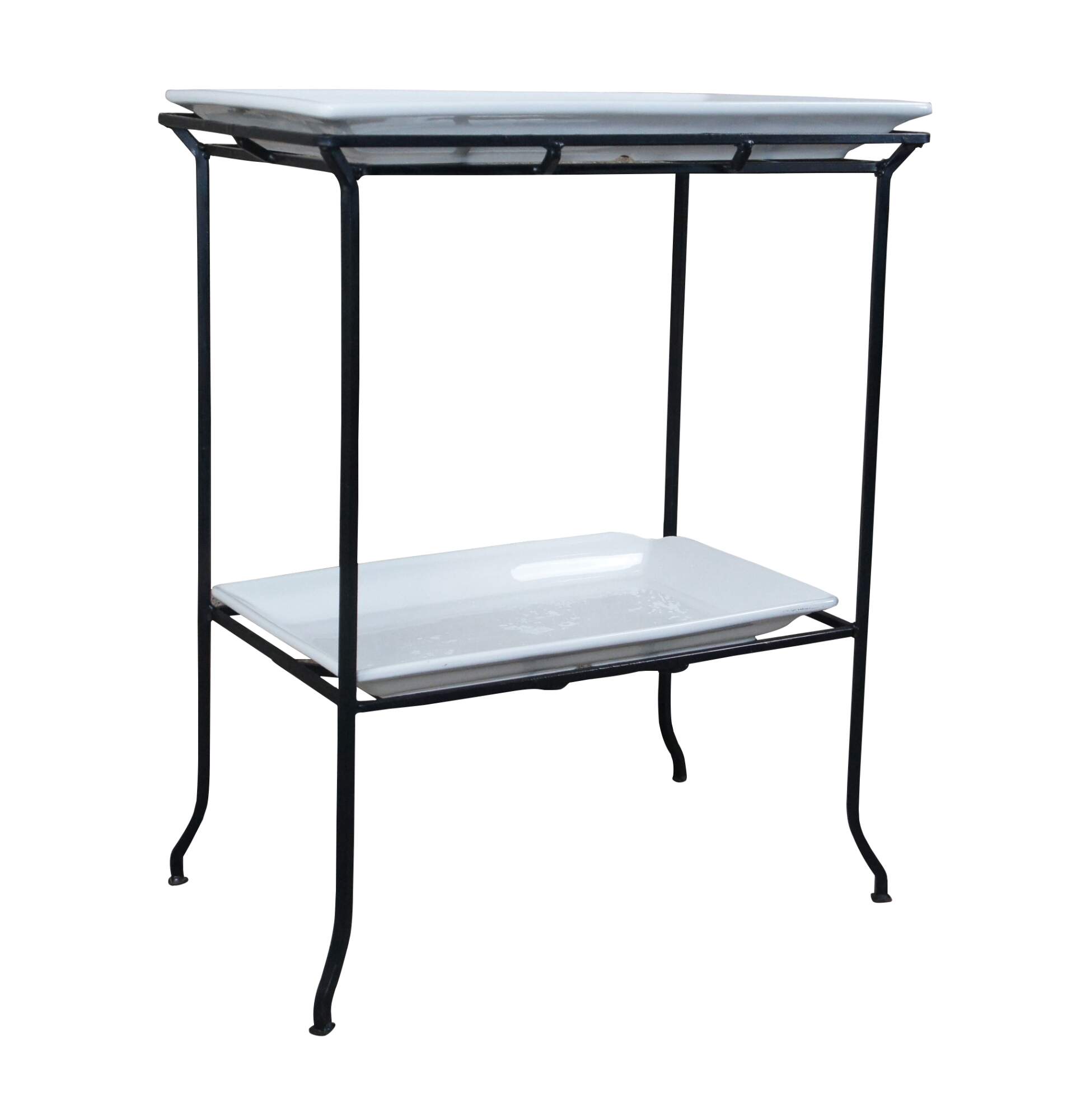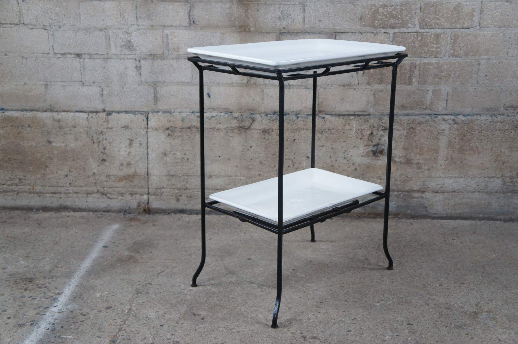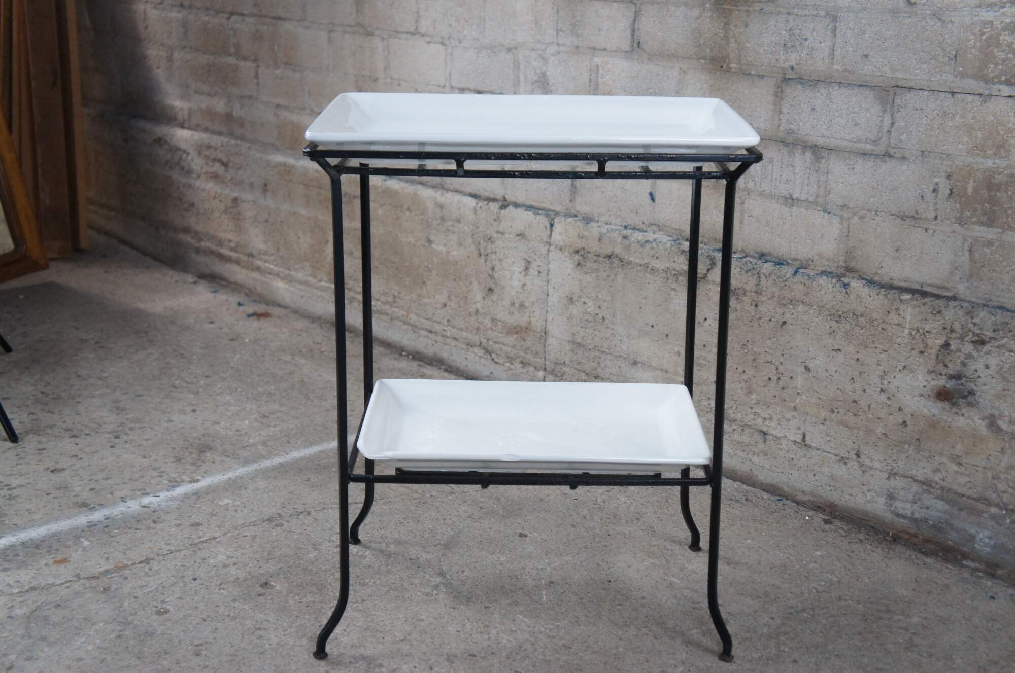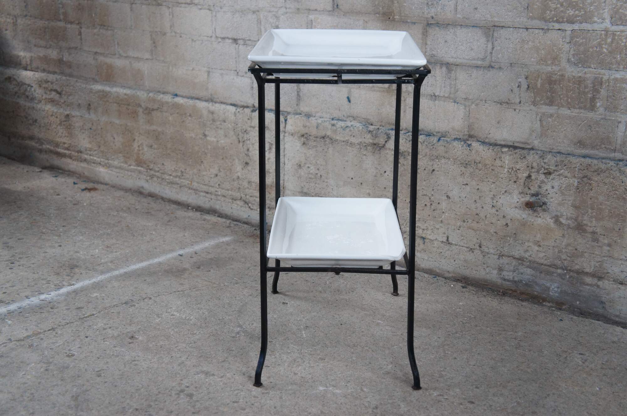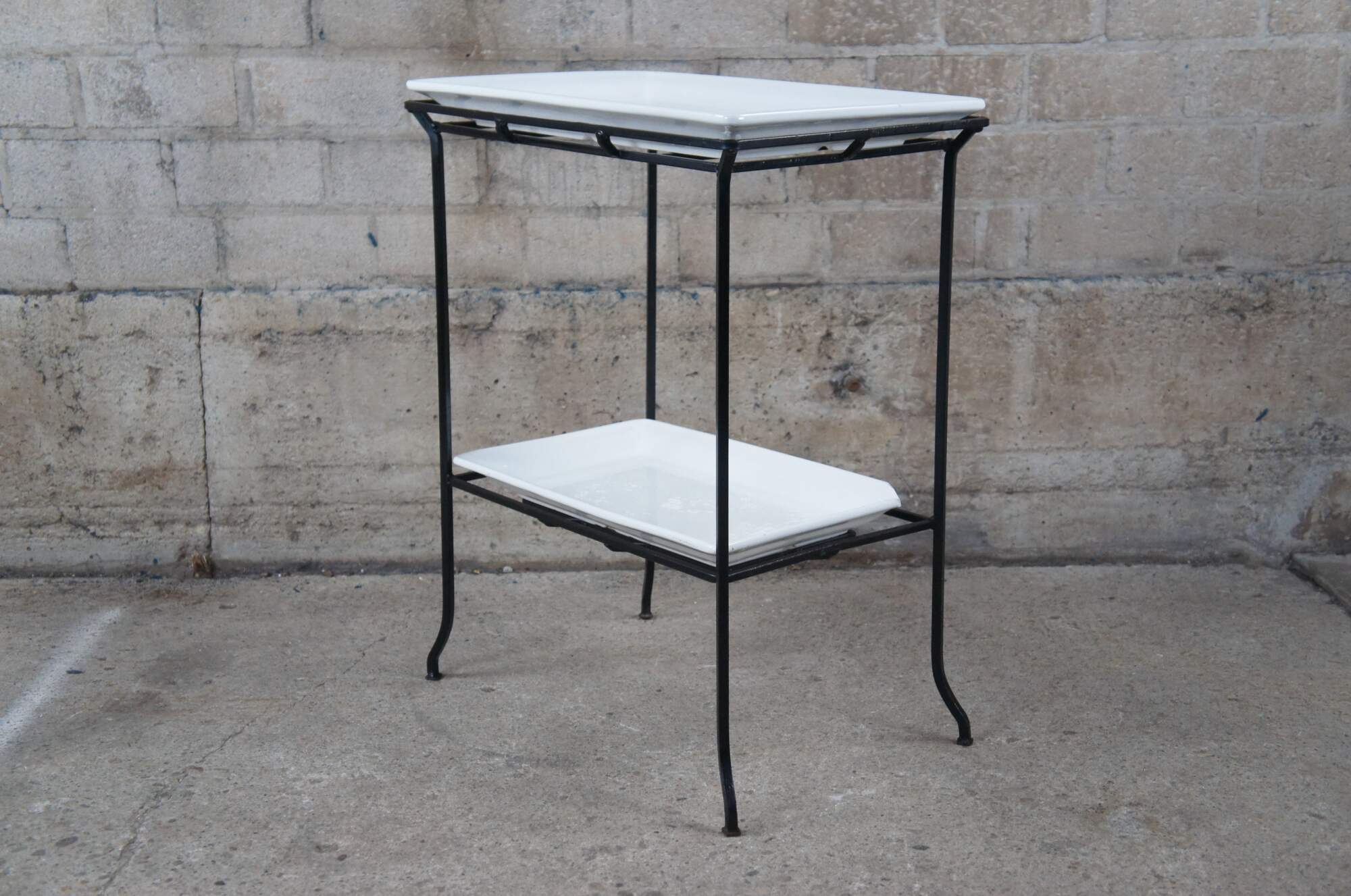 Industrial iron two tier table with porcelain inserts. Great for use as a dry bar, tray table or flower display.