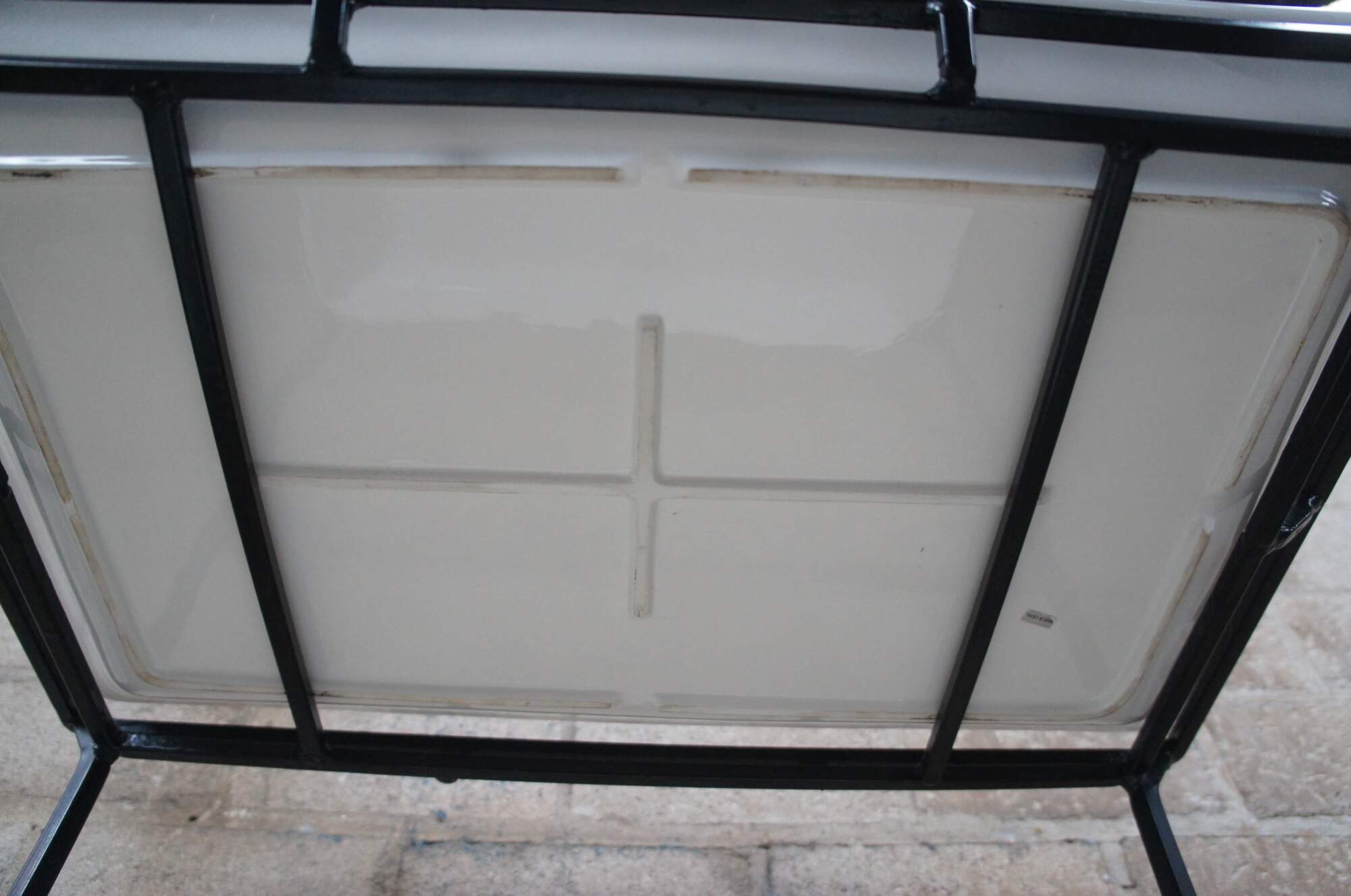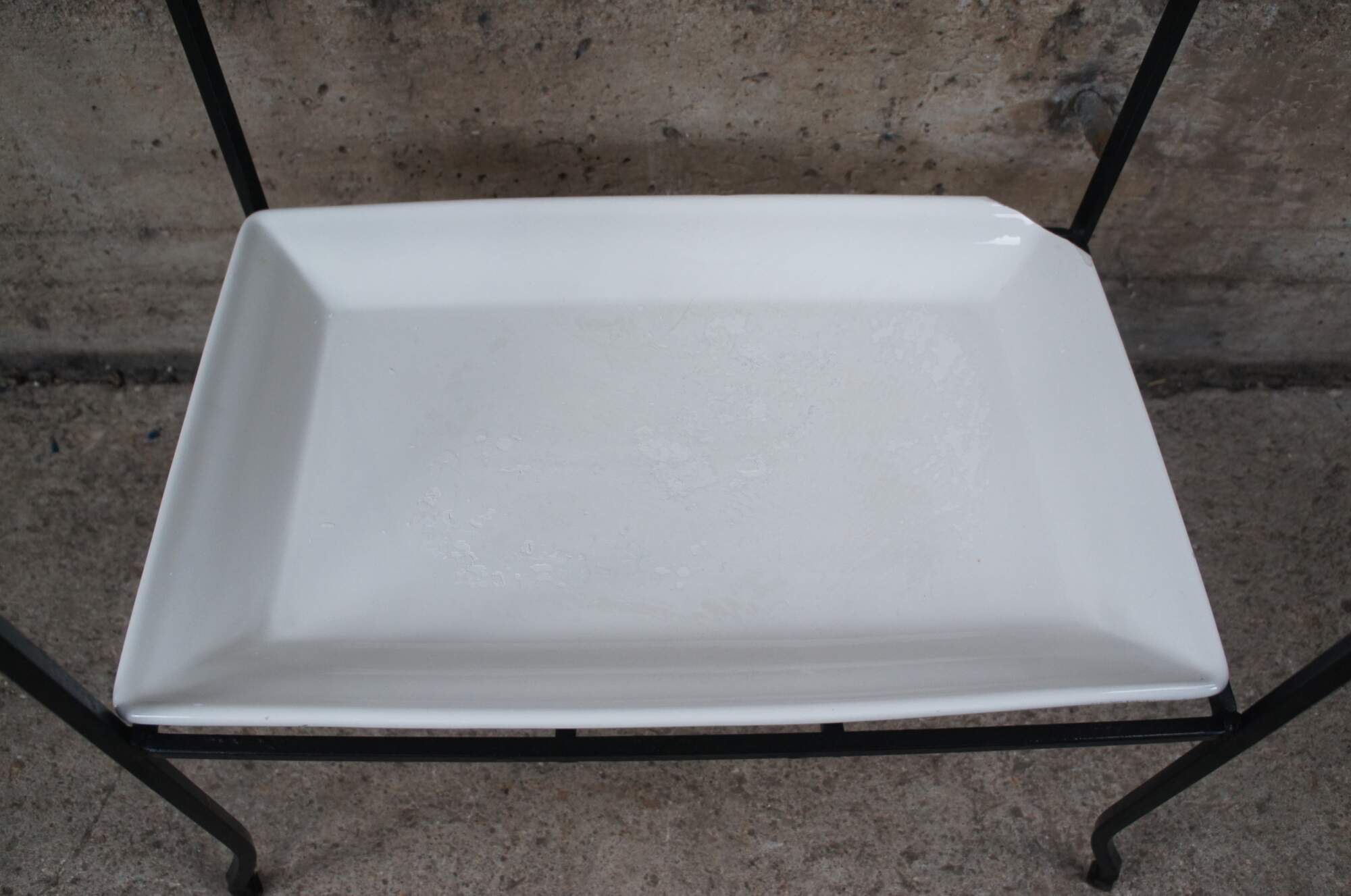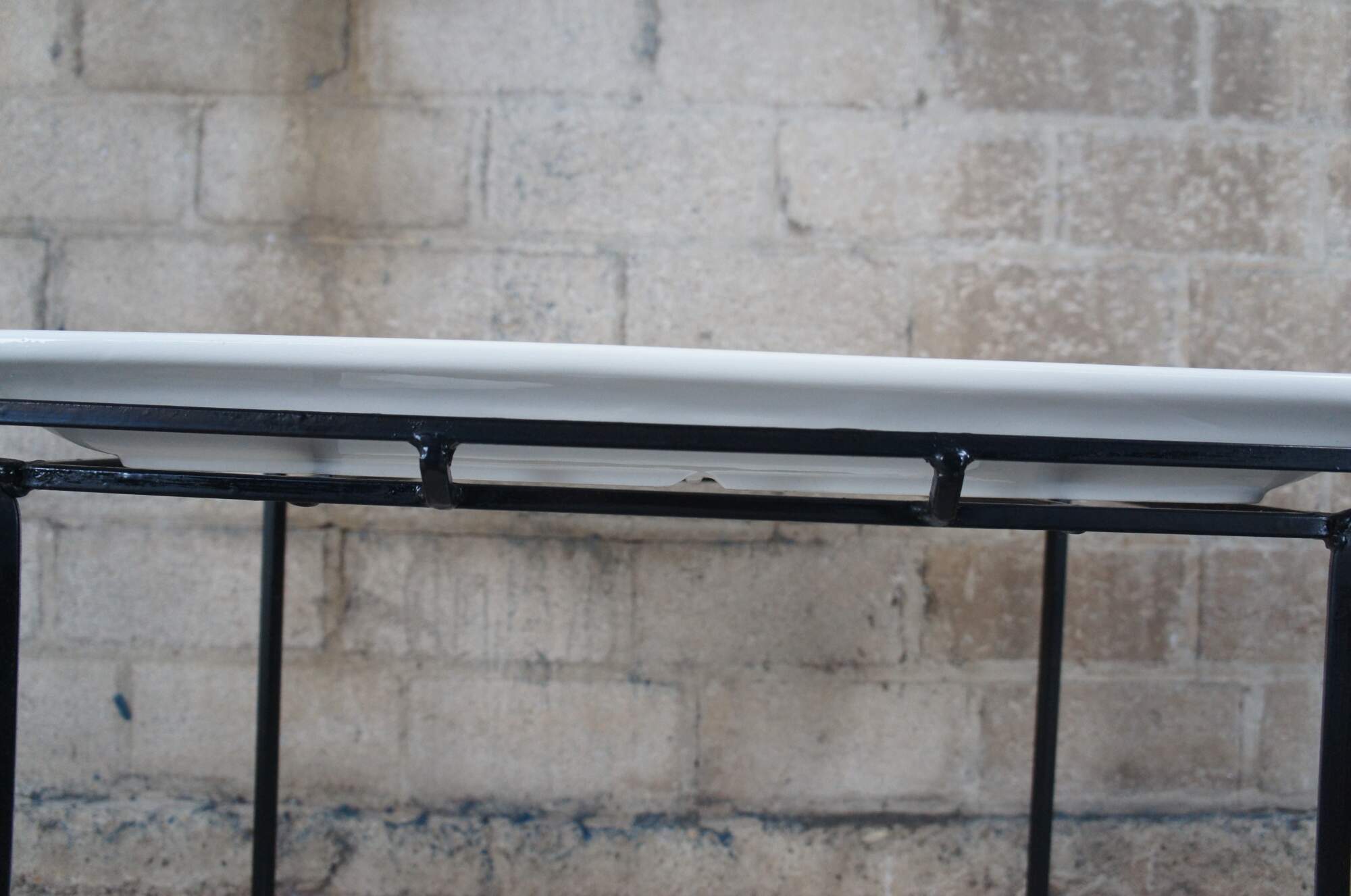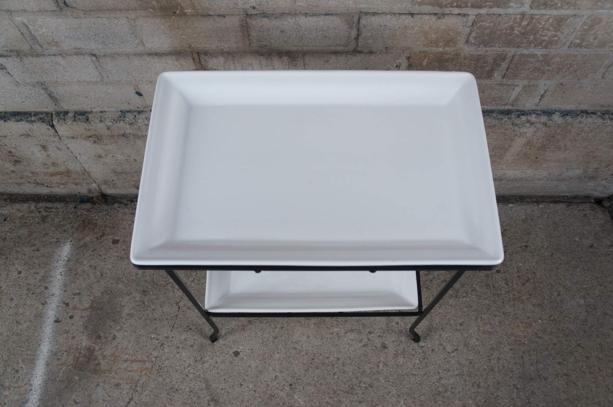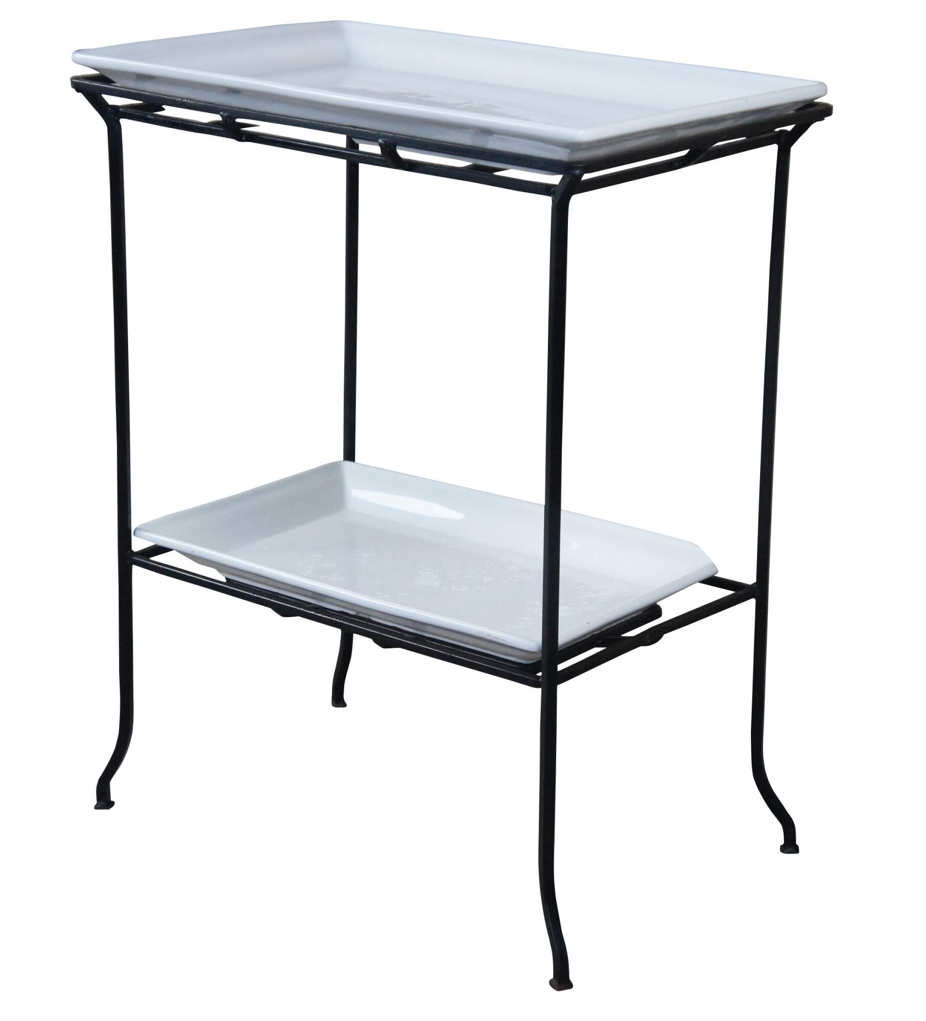 Industrial iron two tier table with porcelain inserts. Great for use as a dry bar, tray table or flower display.