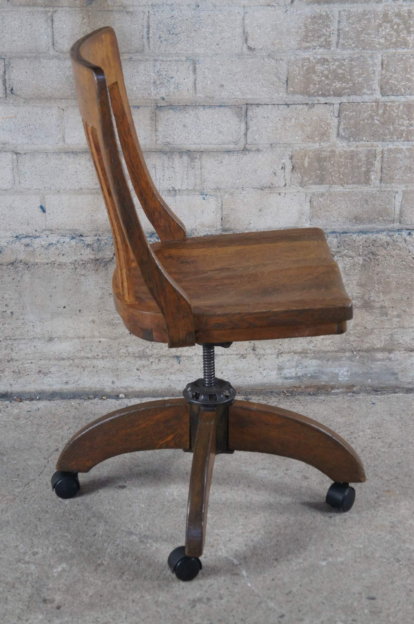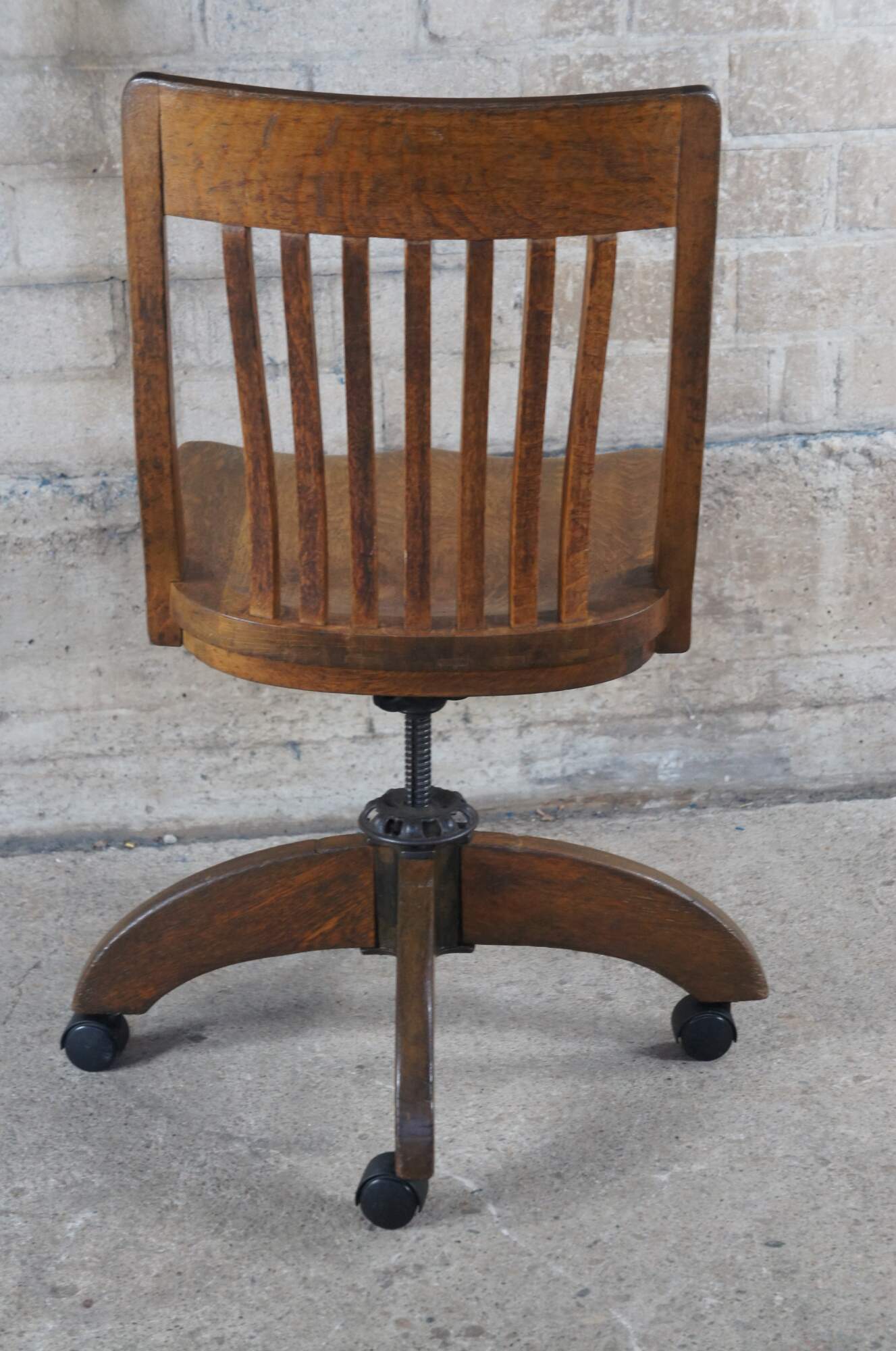 Antique W.H. Gunlocke quartersawn oak bankers / lawyers / executive desk chair featuring a slatted back and adjustable swivel recline.