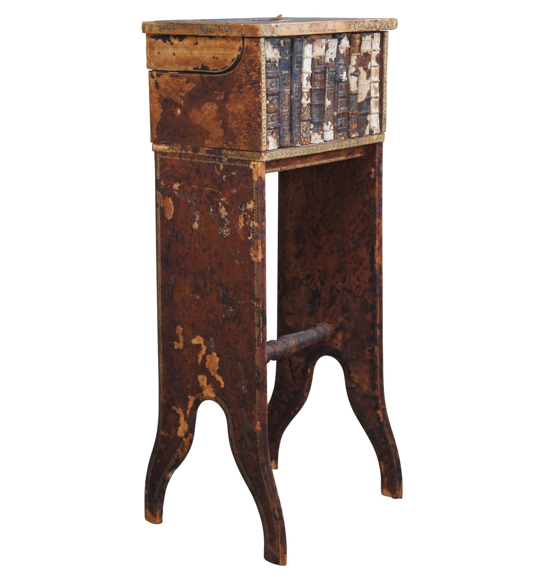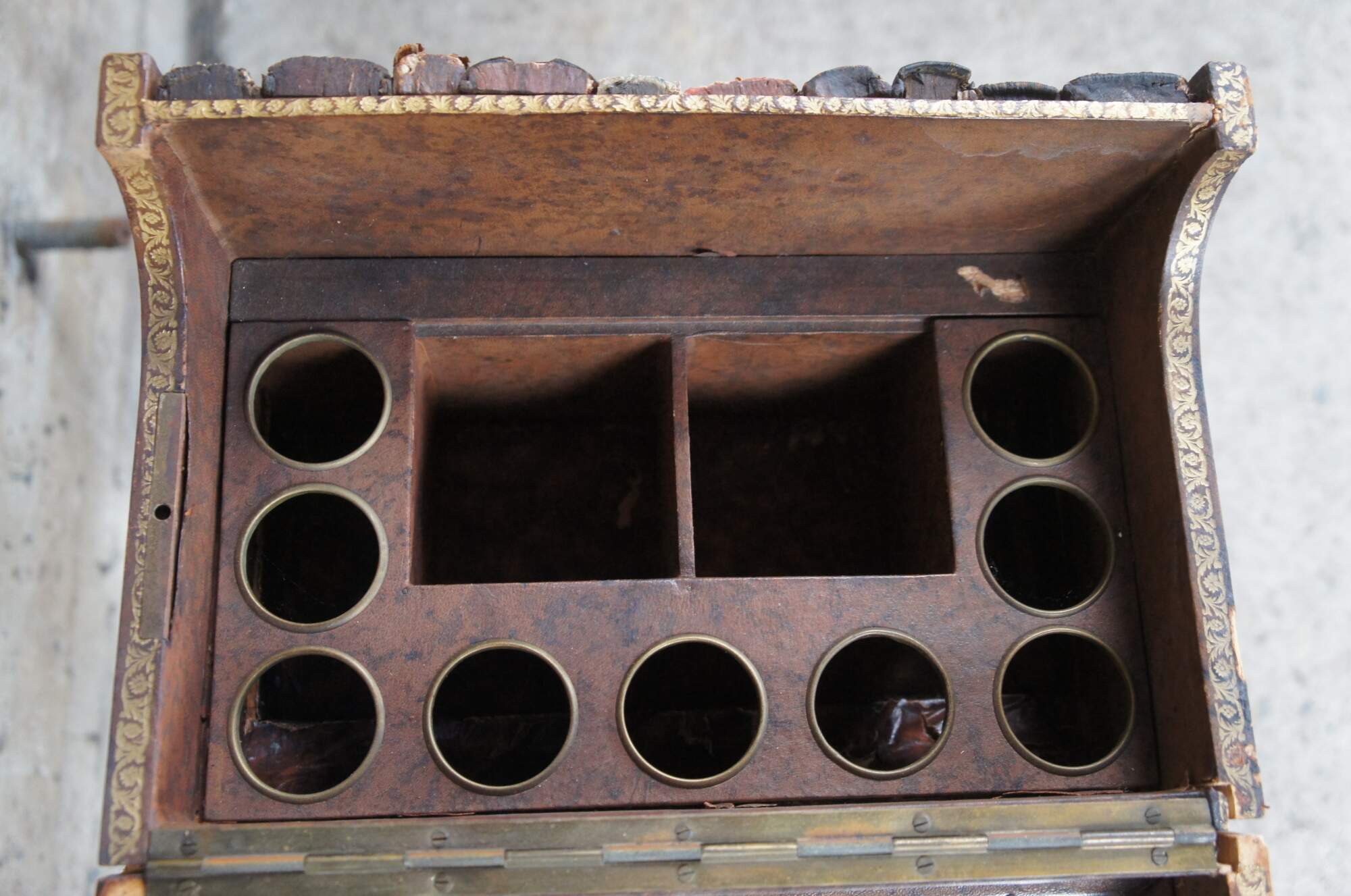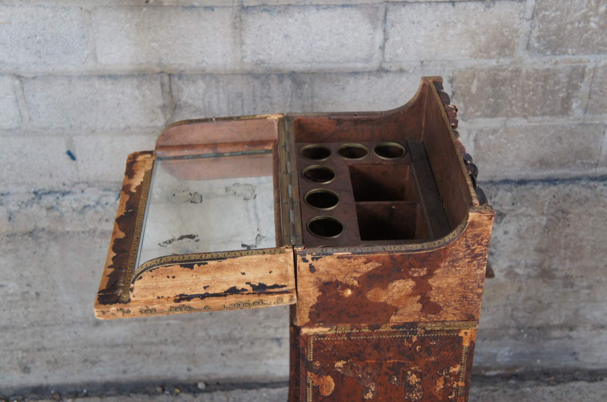 Antique tooled leather tantalus case. Features a faux leather bookcase table form that opens to a mirror and space for two bottles and 9 glasses. Includes a lock along the side (untested)