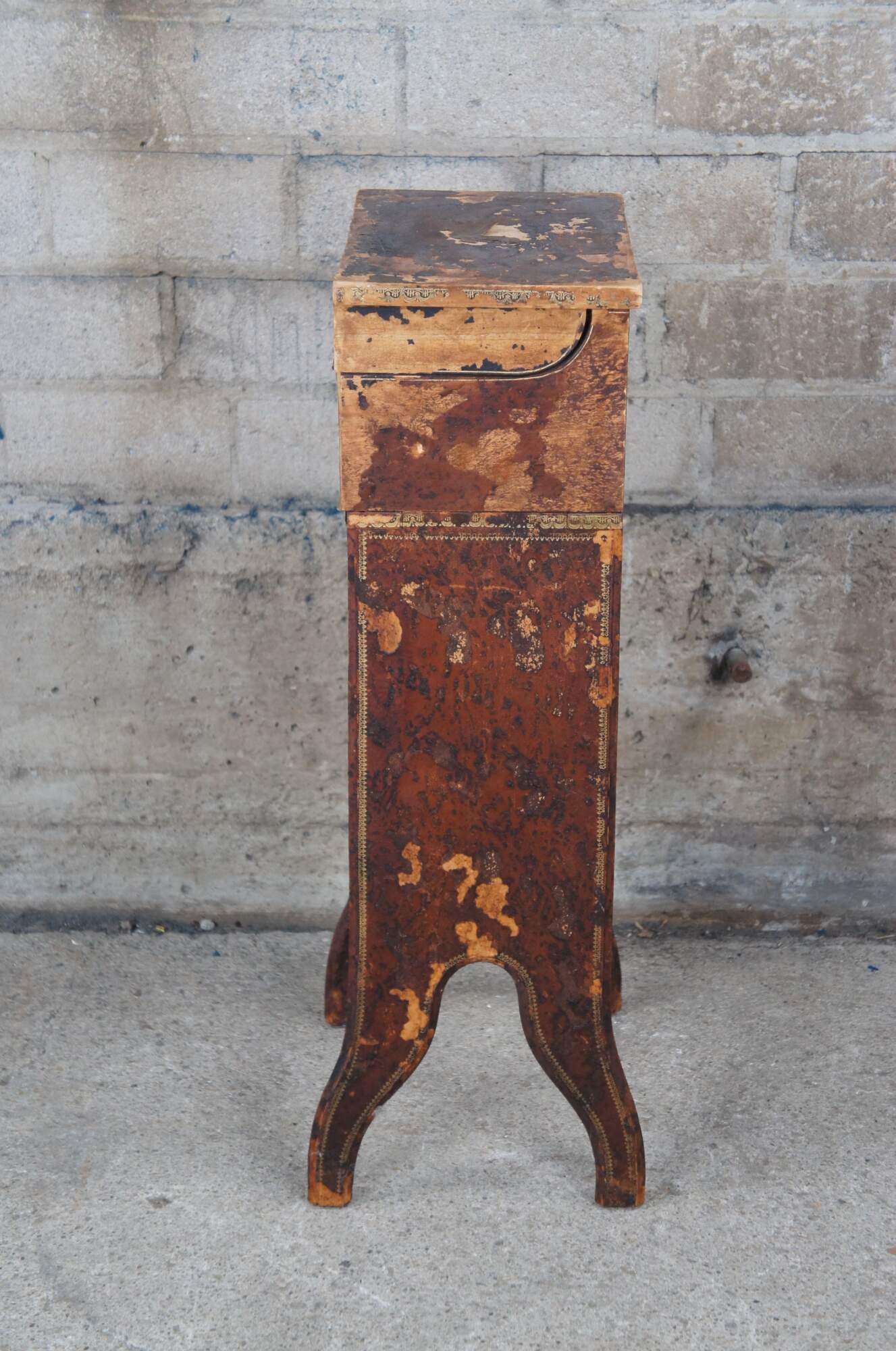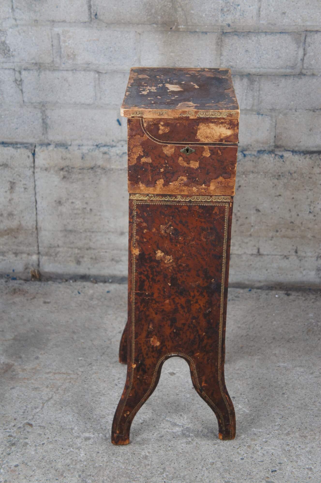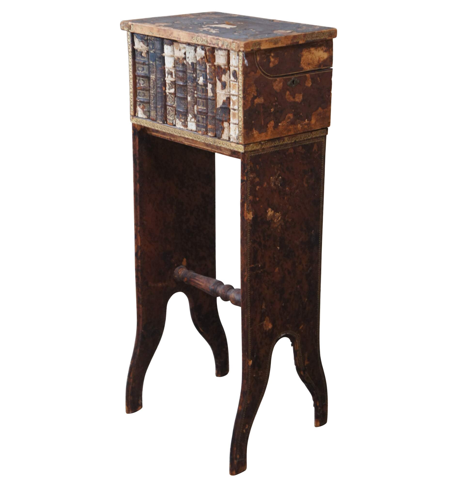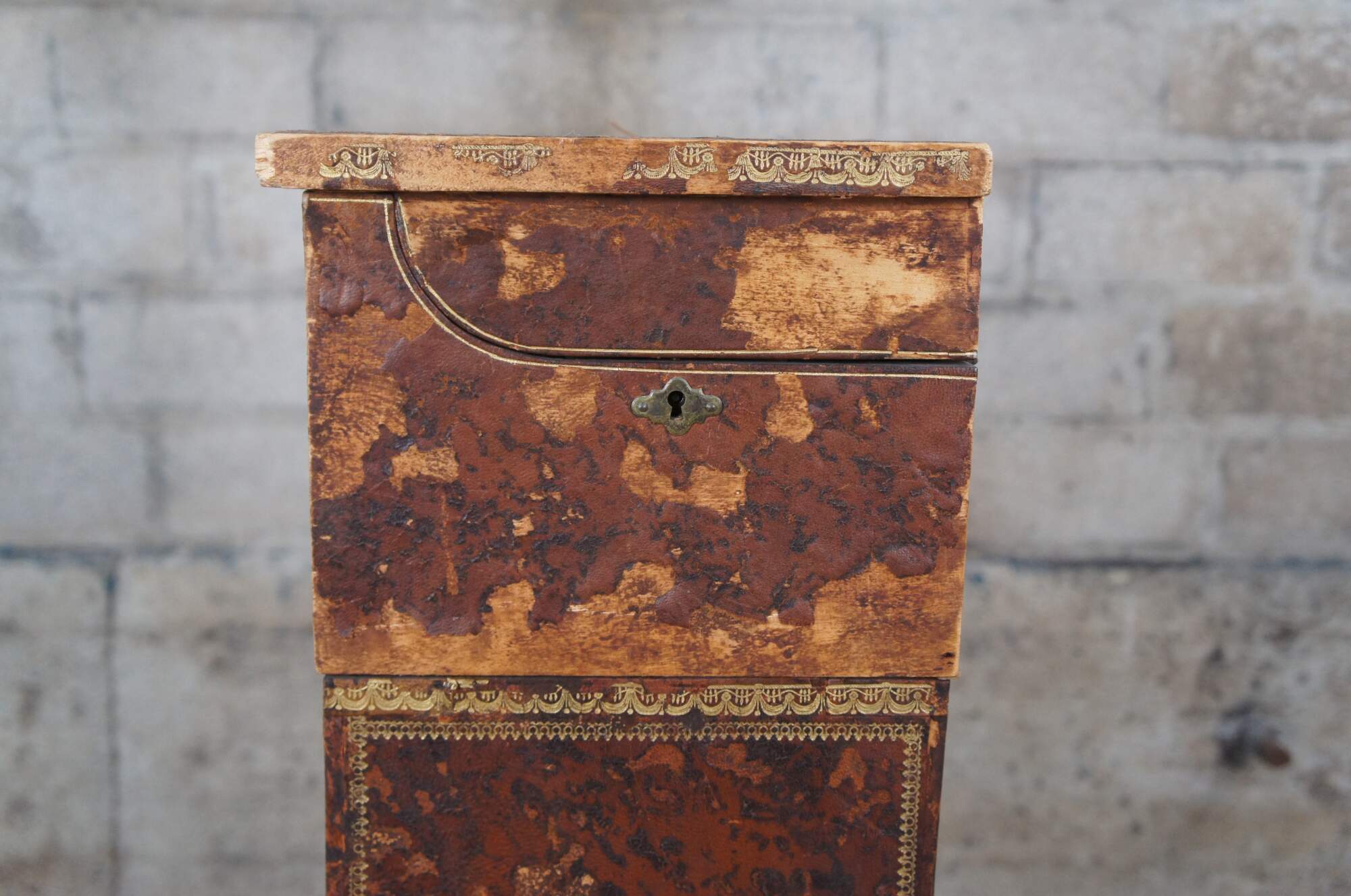 Antique tooled leather tantalus case. Features a faux leather bookcase table form that opens to a mirror and space for two bottles and 9 glasses. Includes a lock along the side (untested)