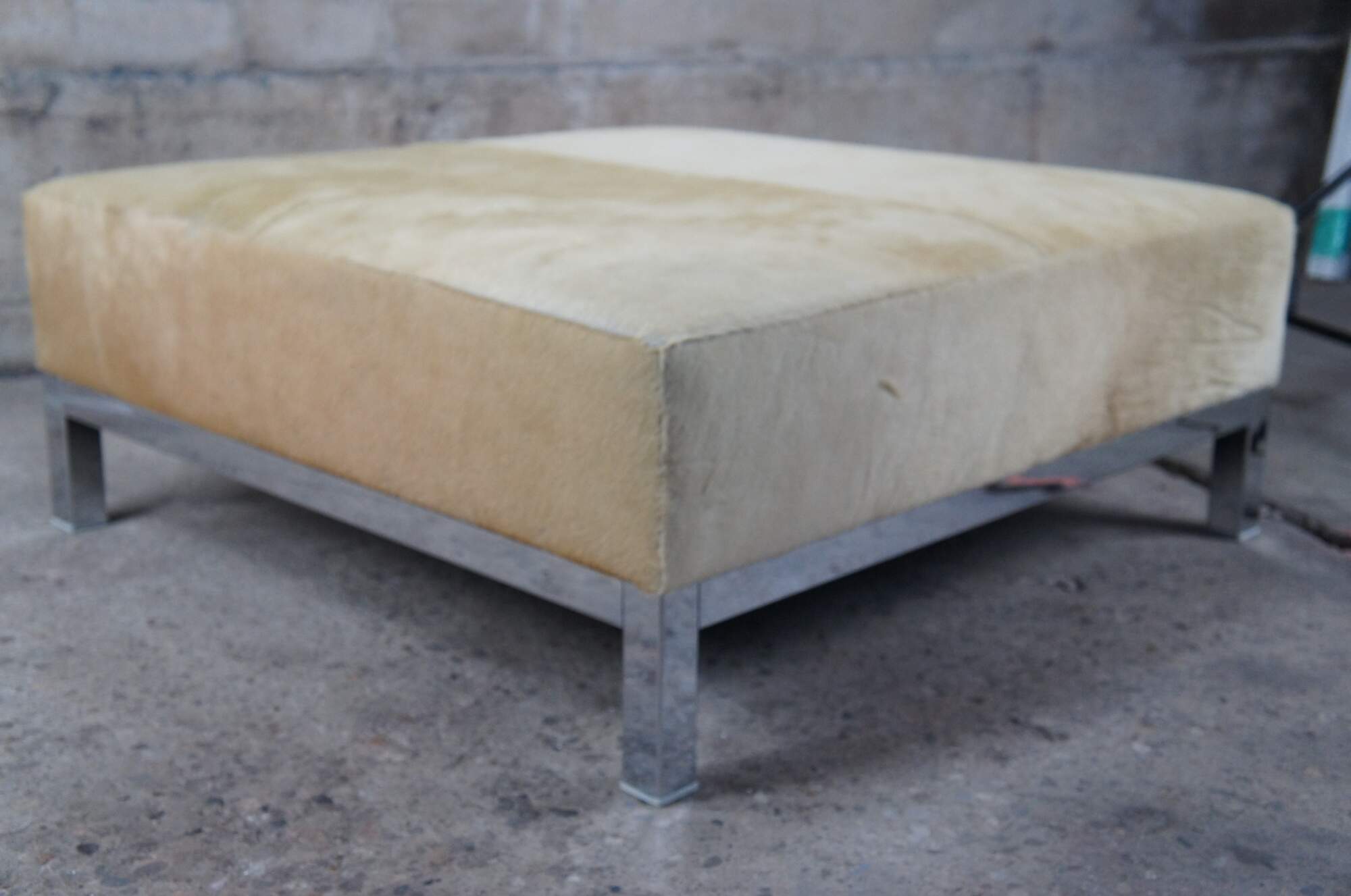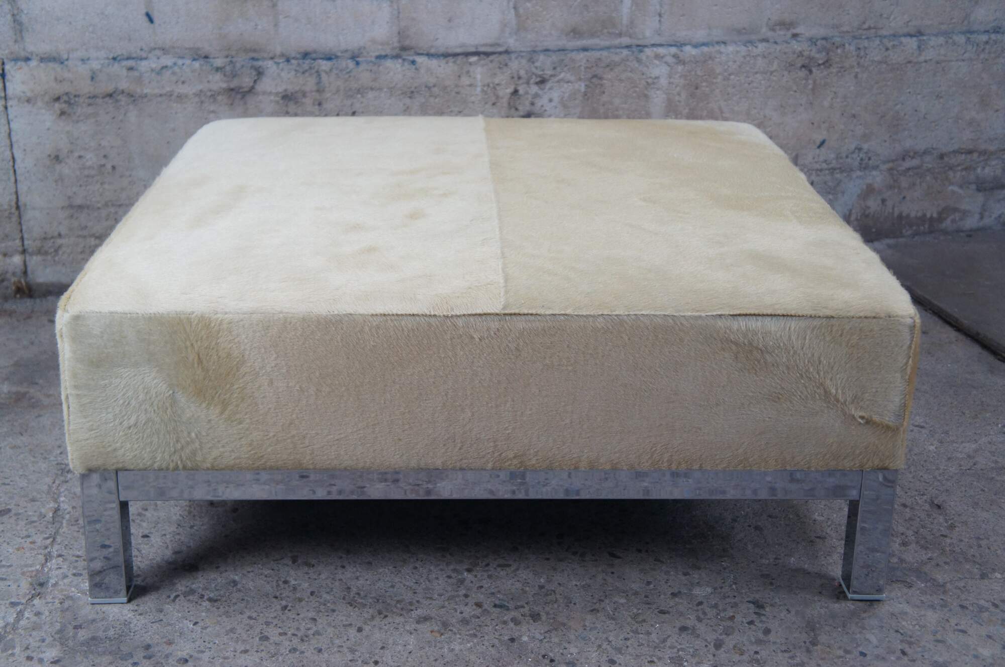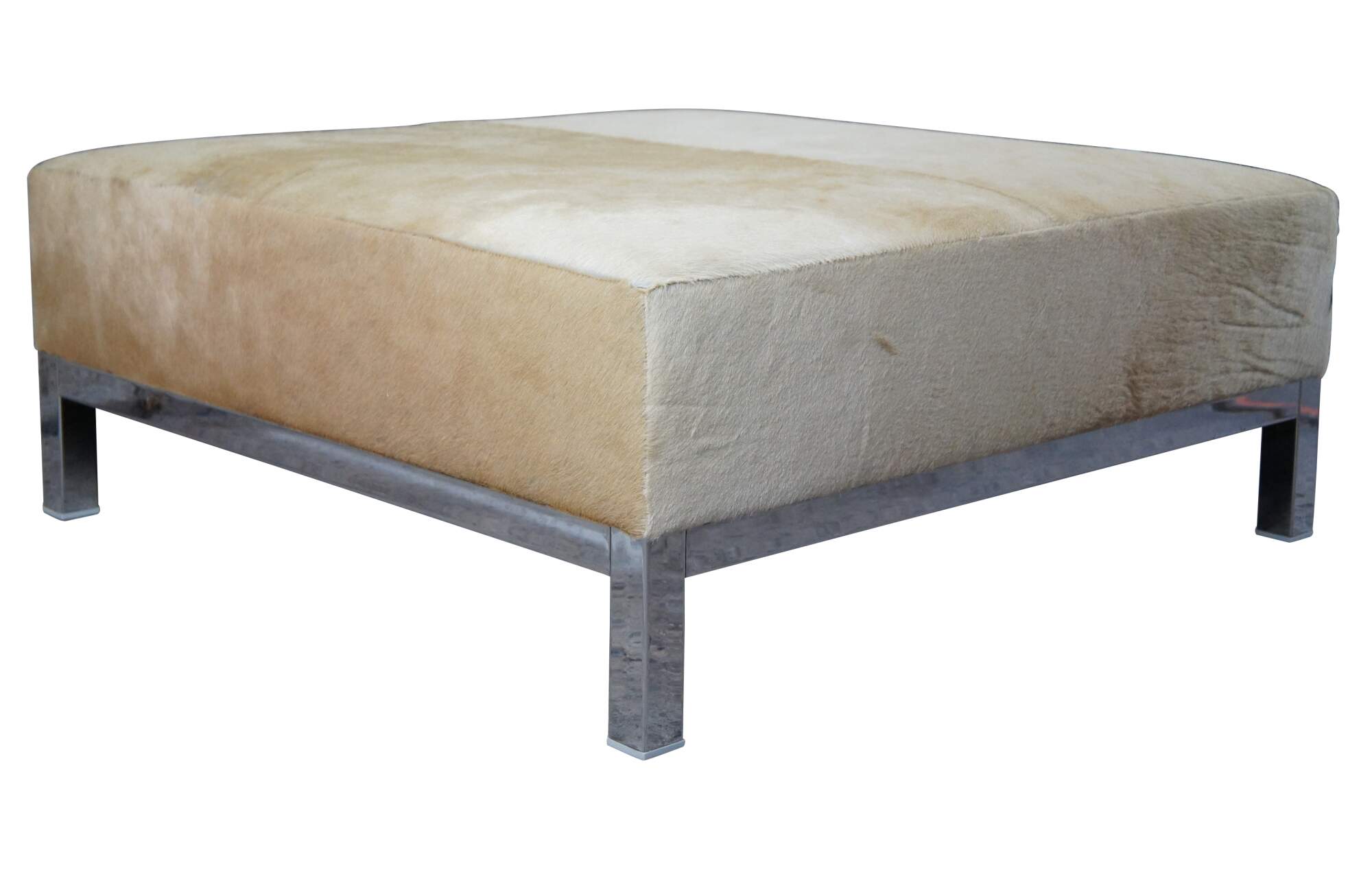 An exquisite Italian ottoman by Minotti, circa last quarter 20th century. Features a streamline form with cowhide cushioned top over chrome base.