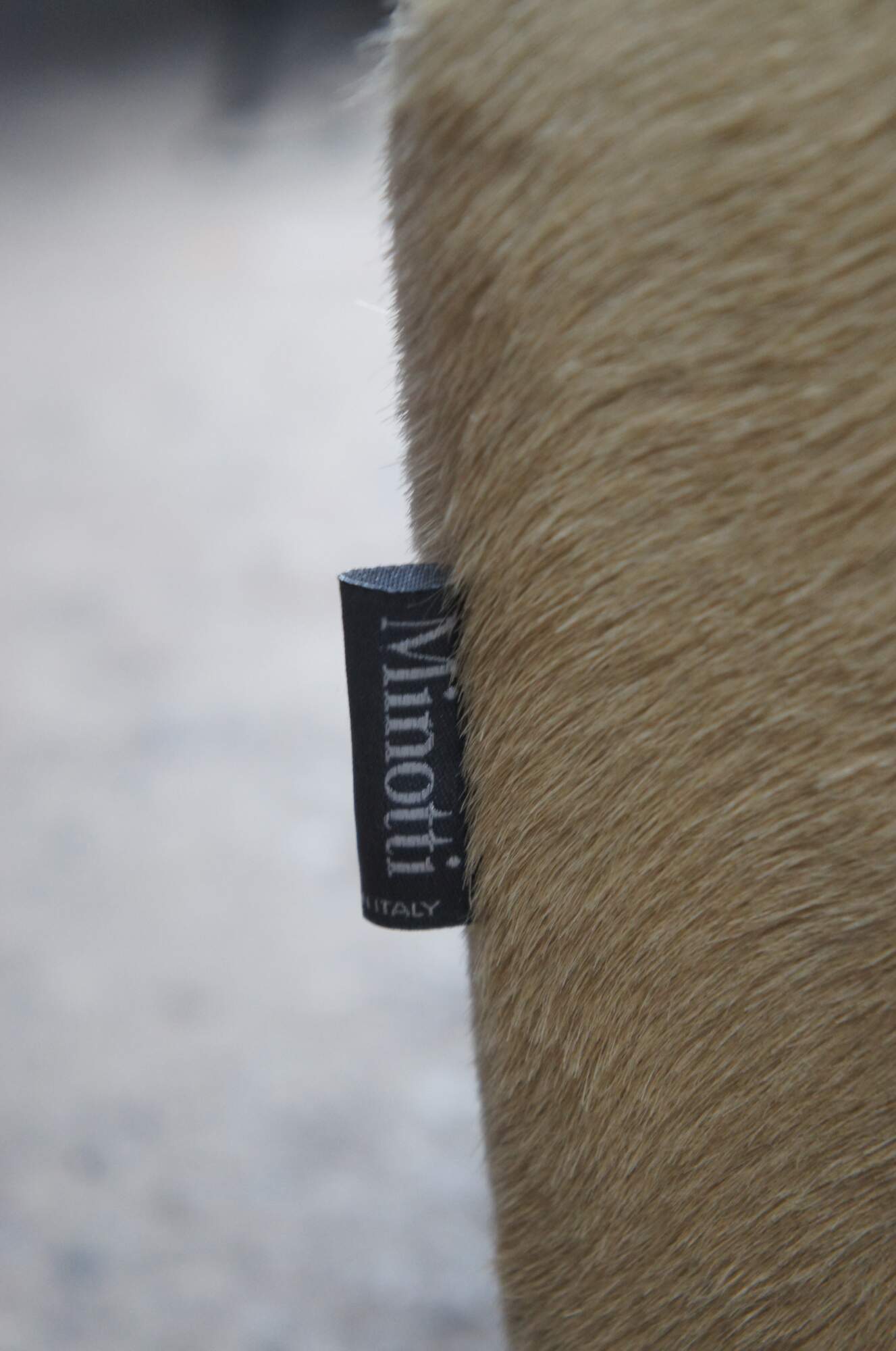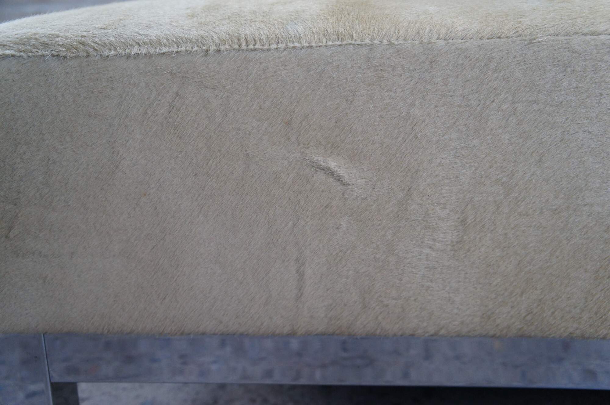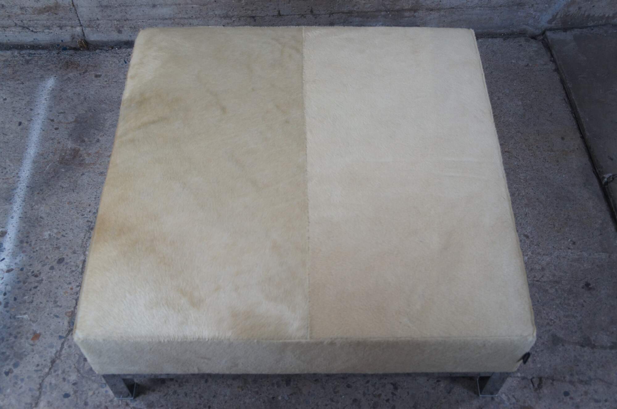 An exquisite Italian ottoman by Minotti, circa last quarter 20th century. Features a streamline form with cowhide cushioned top over chrome base.