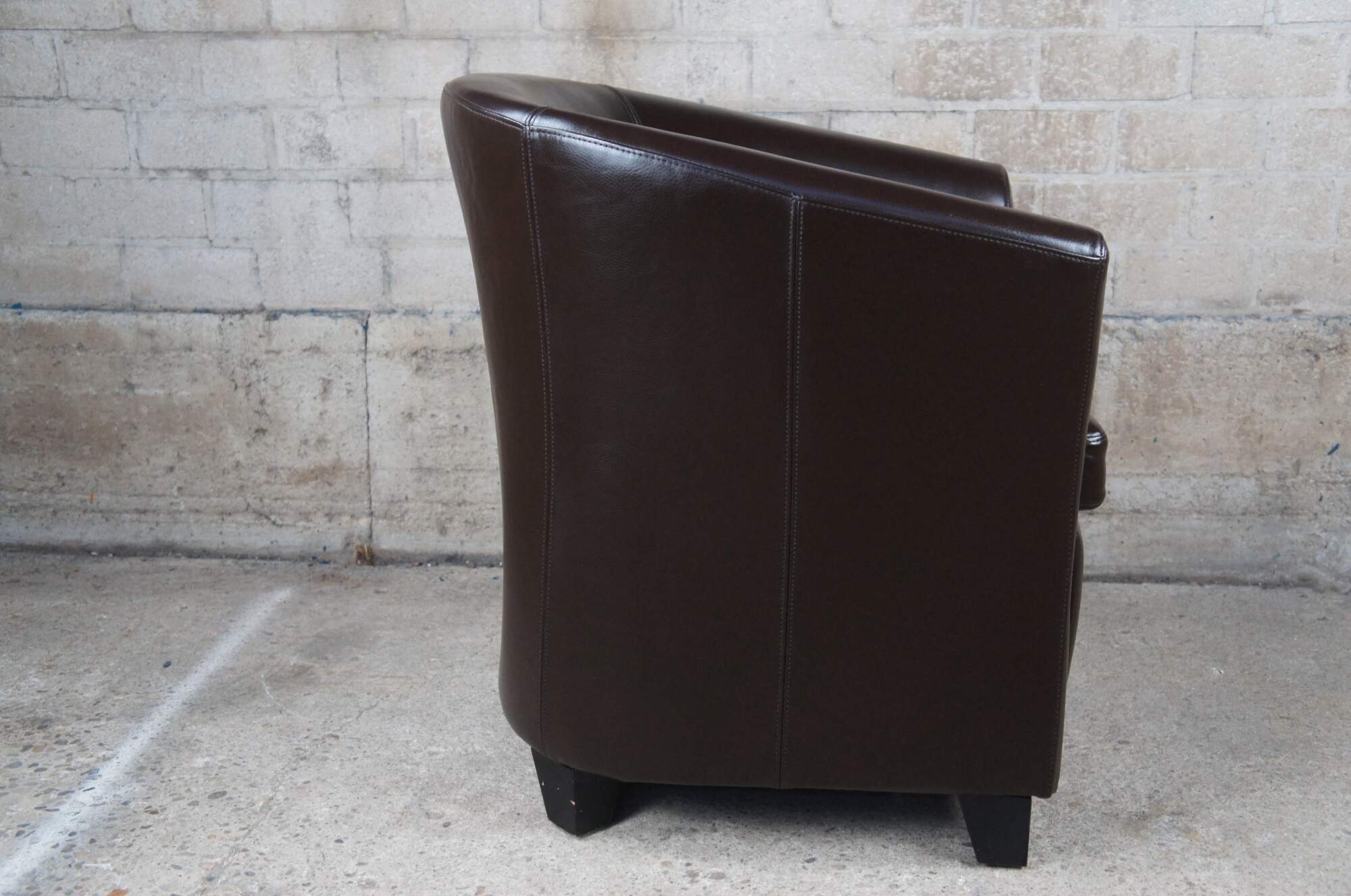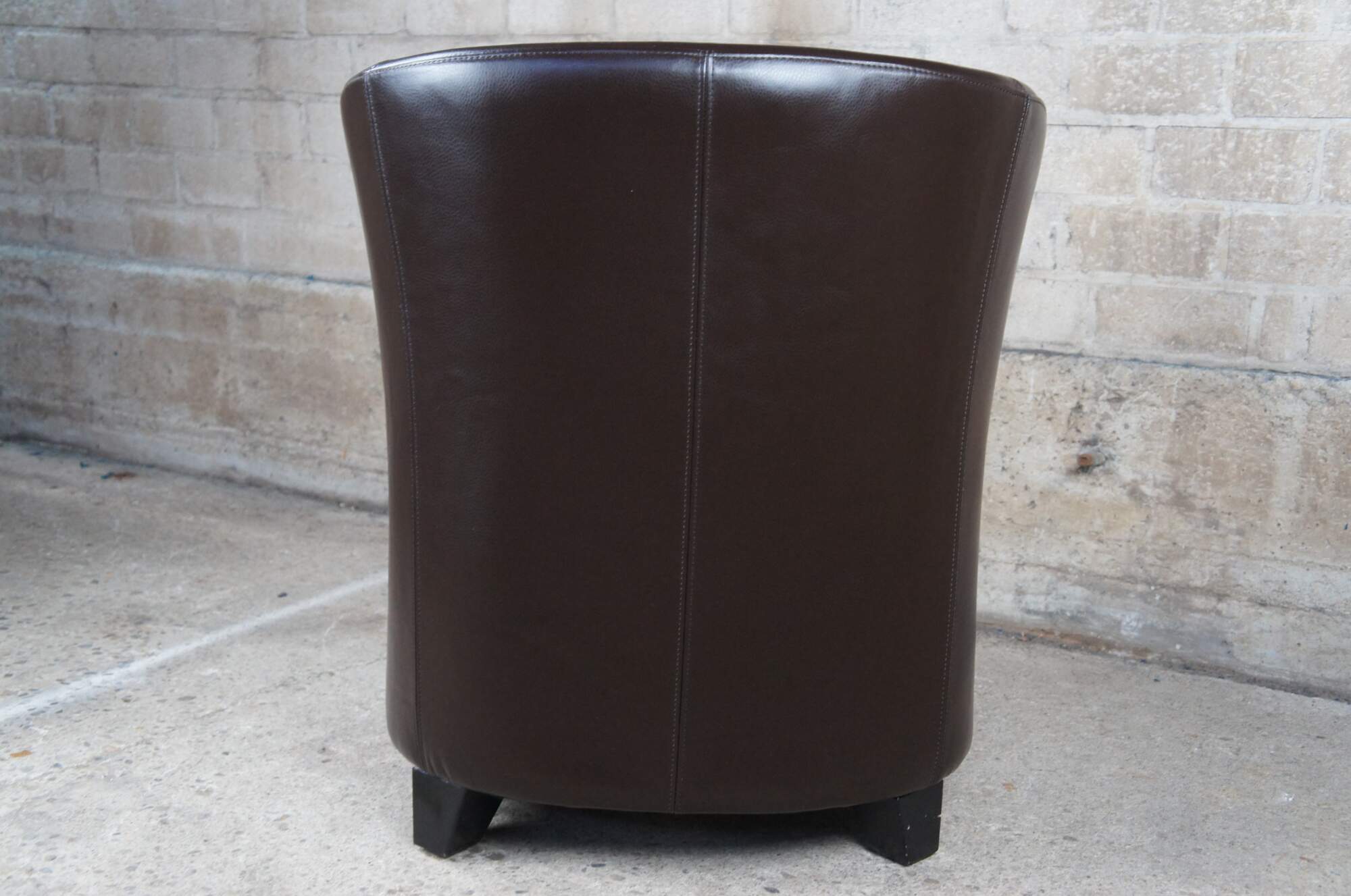 Grandin Road Contemporary barrel back chair has a smooth and sleek look with a curved back leading to flared arms, all covered in an espresso brown leather upholstery. Squared wooden feet add to the contemporary appeal.