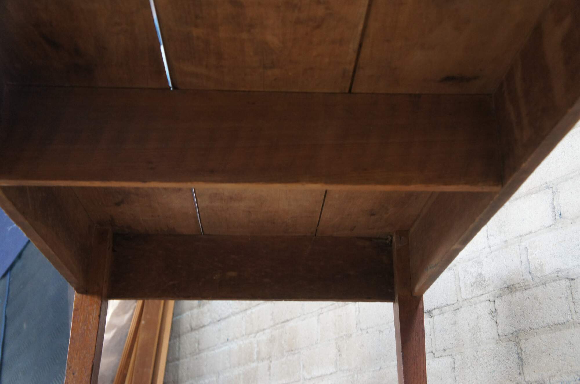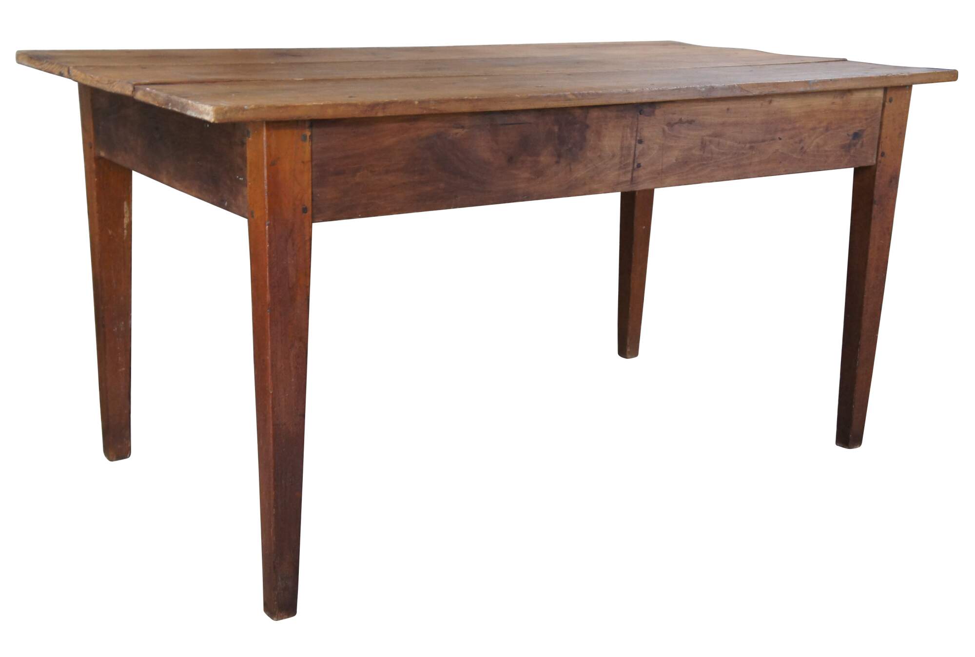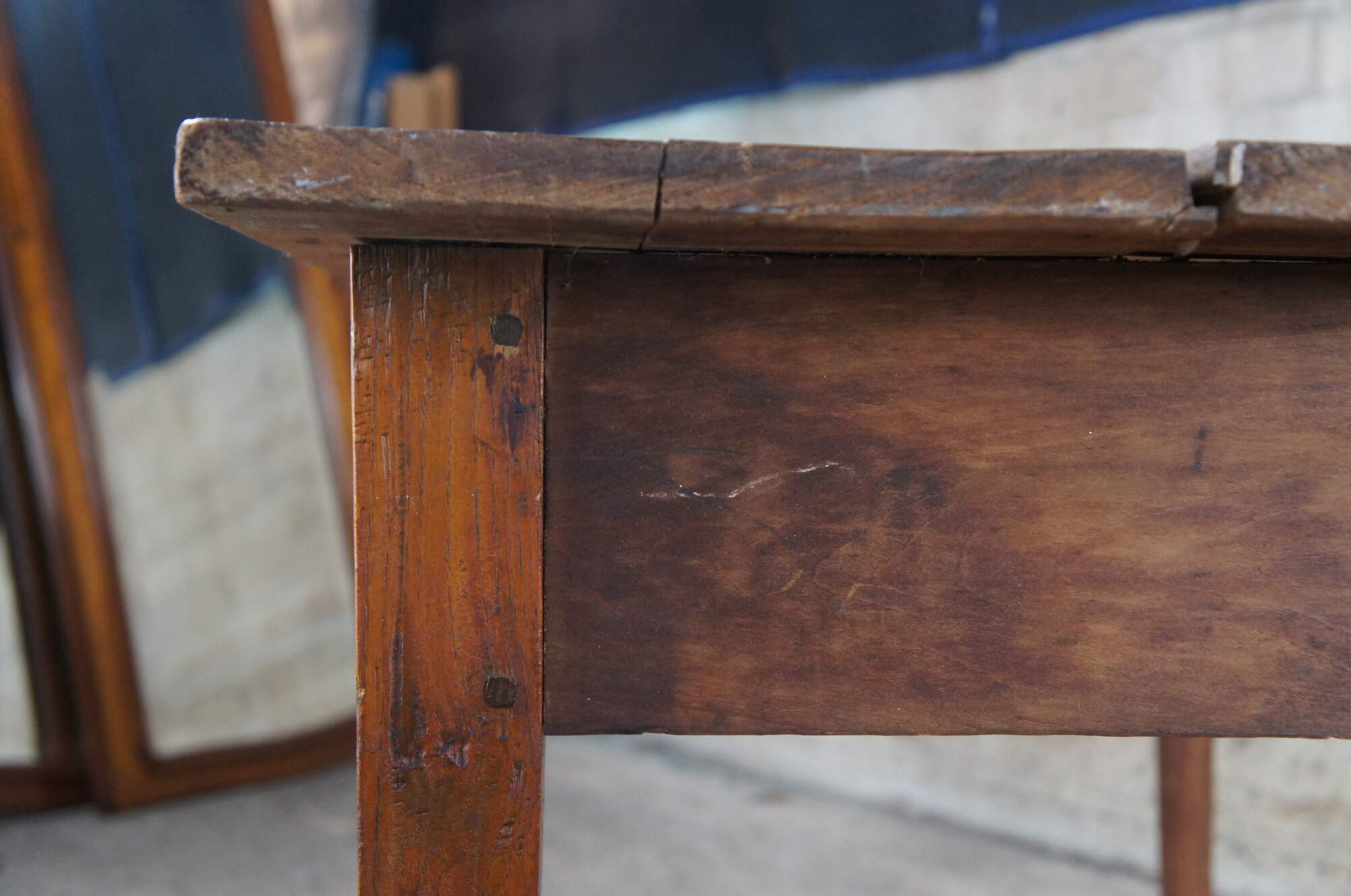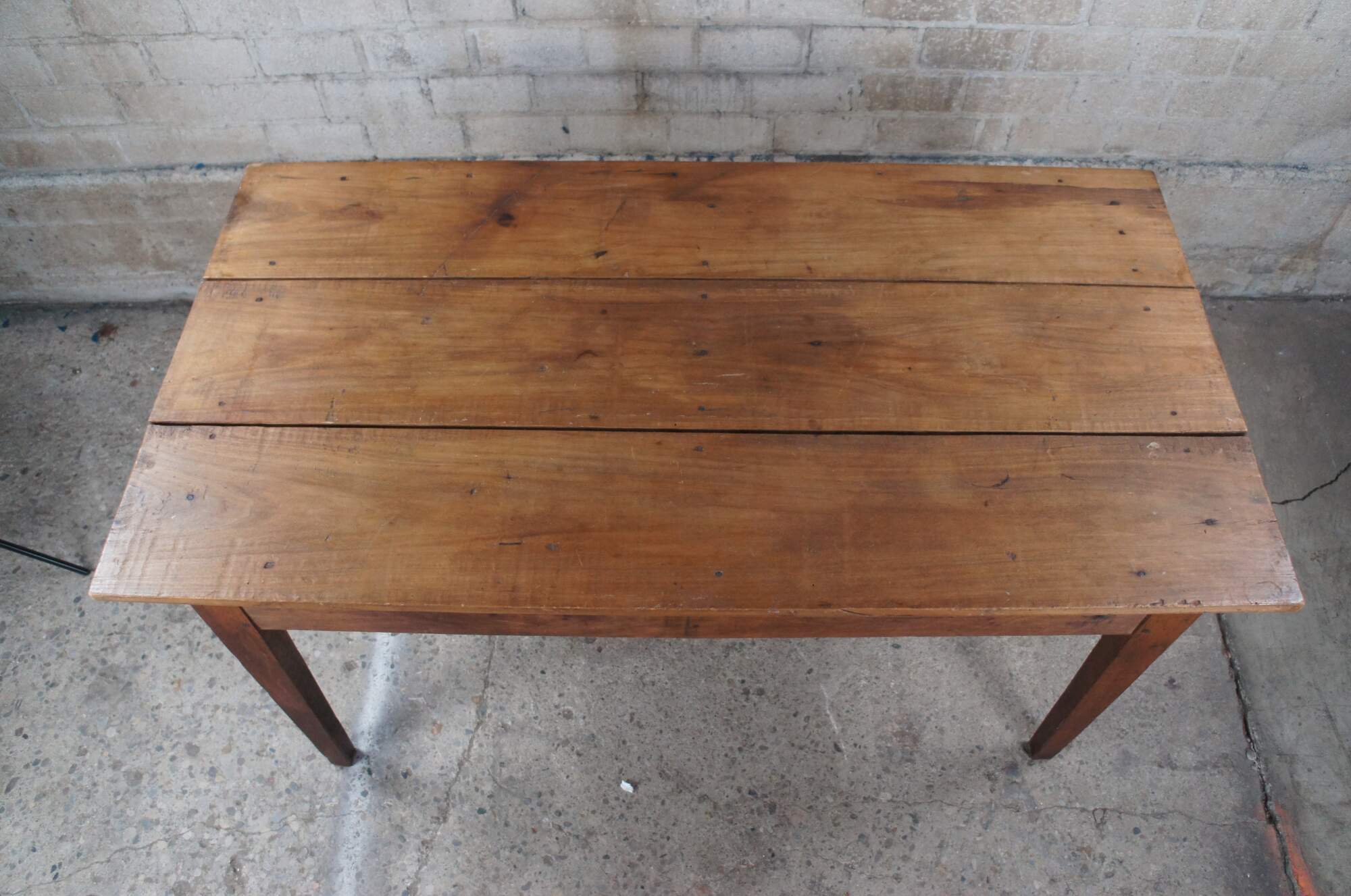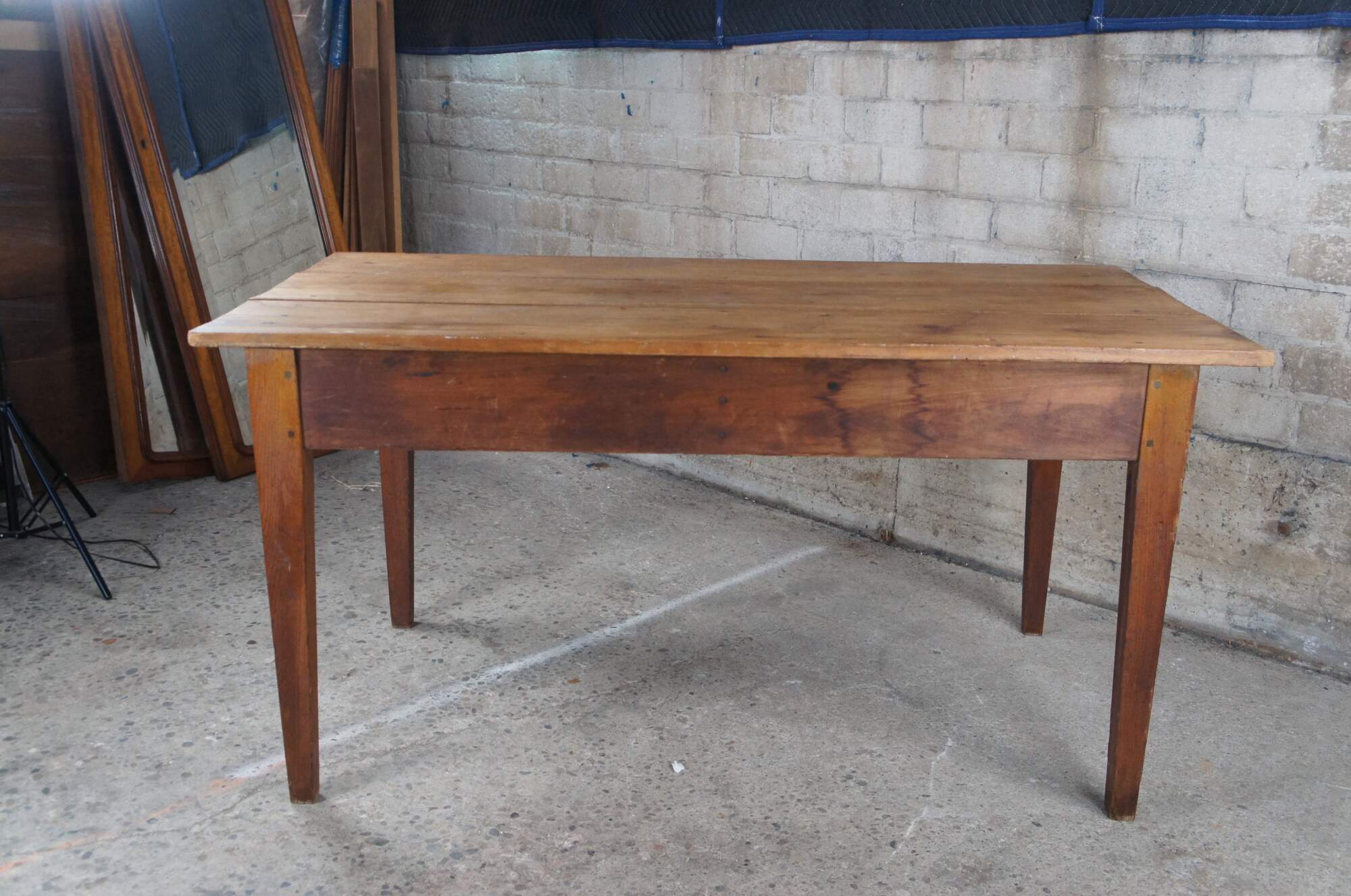 Antique primitive Tennessee farm house breakfast / dining table or desk. Made of pine planks featuring rectangular form with a three plank top and square tapered legs.