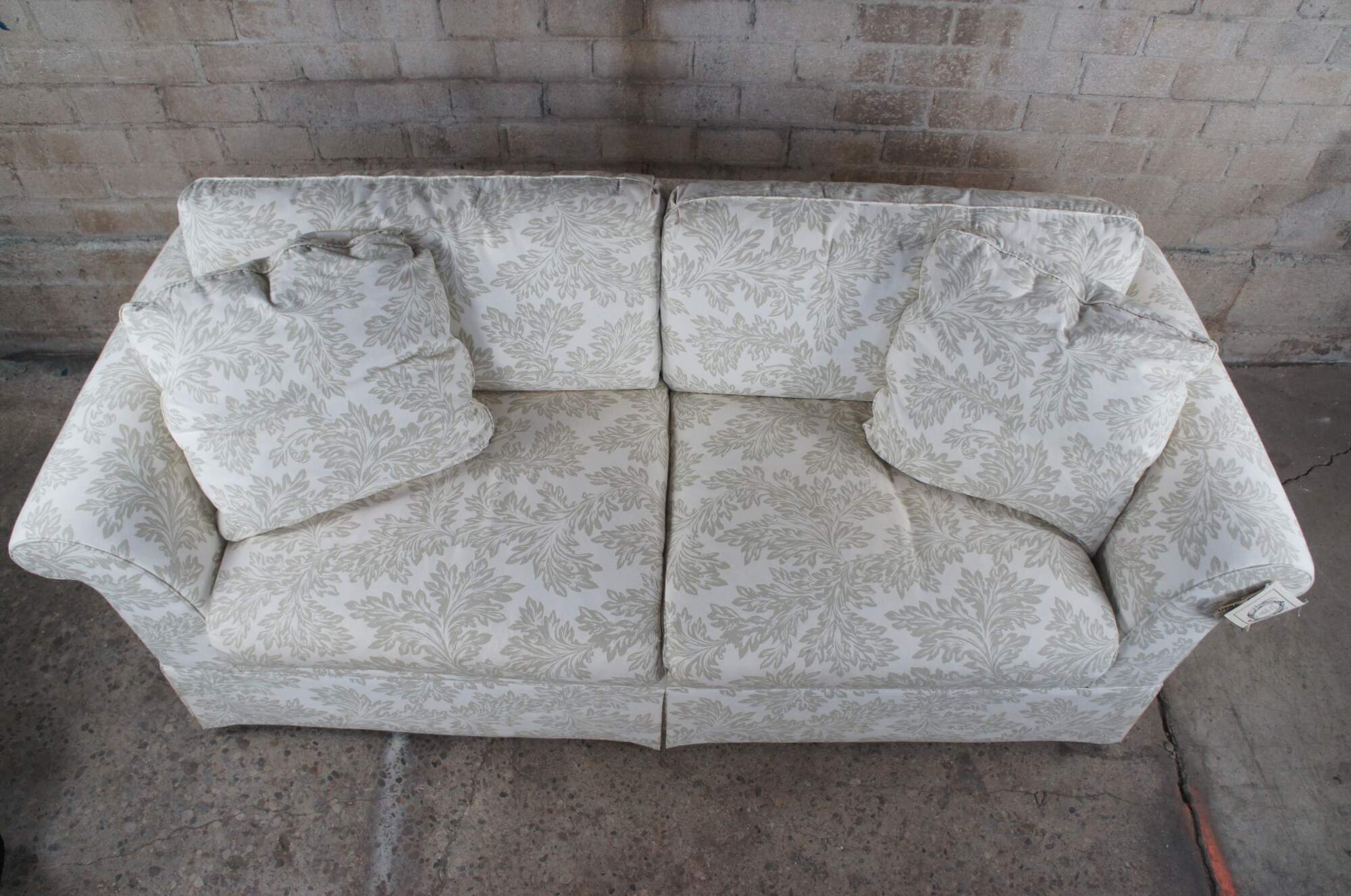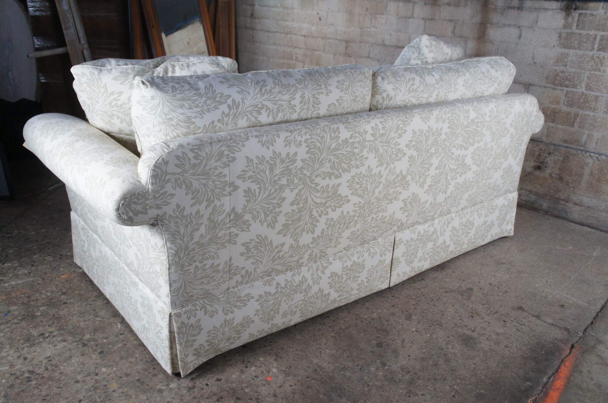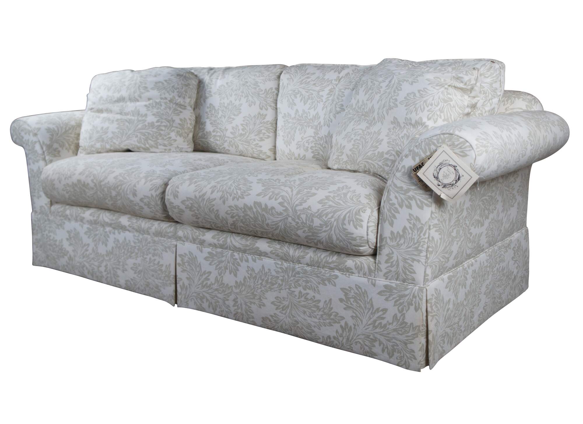 Vintage Baker Crown & Tulip Collection Sofa, circa last quarter 20th century. Features a rectangular form with rolled arms, down filled cushions and throw pillows. #6819-88C. Upholstered in an off-white fabric with olive green / acanthus design. Bares the original tags which are attached to the arm.
