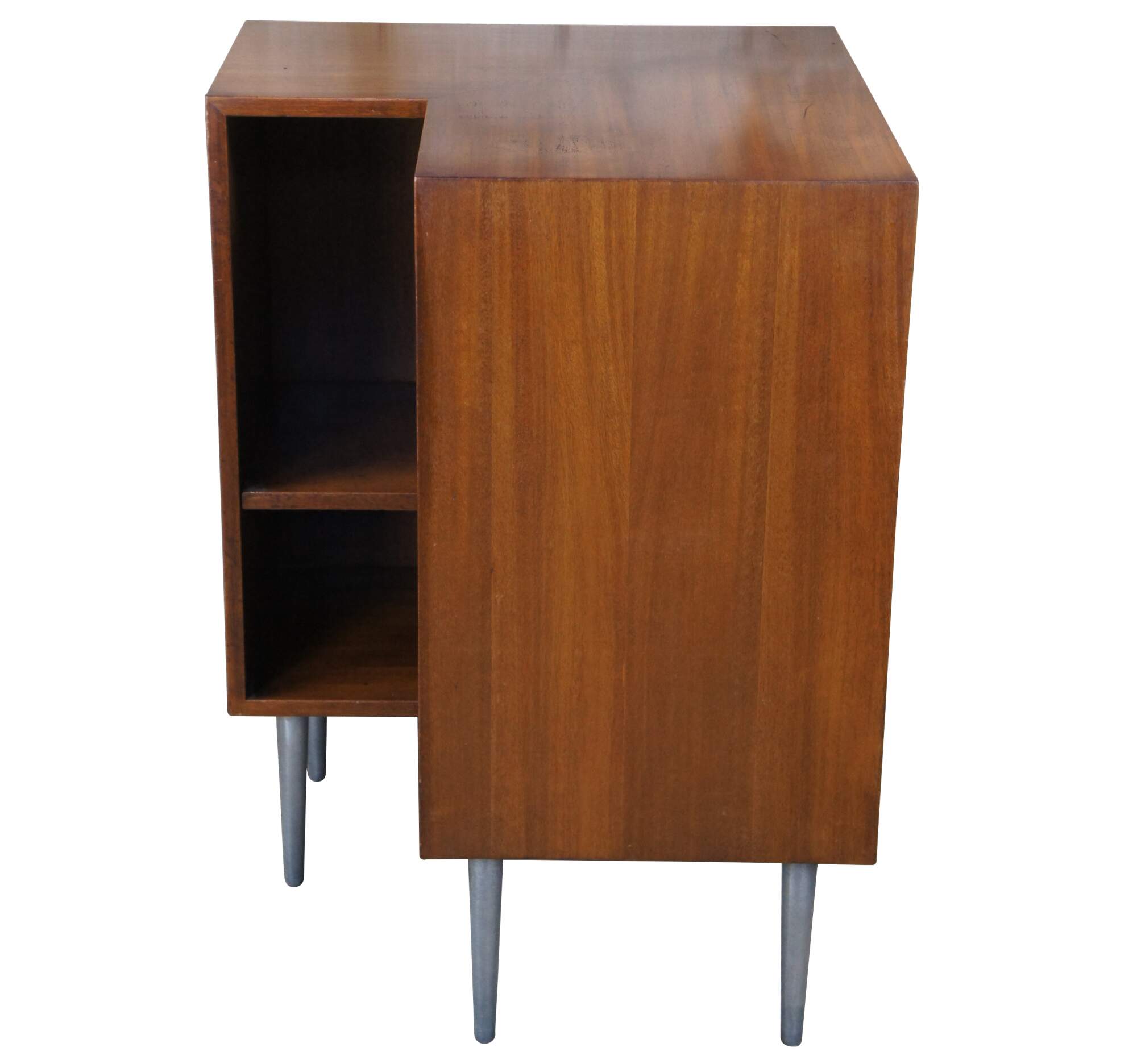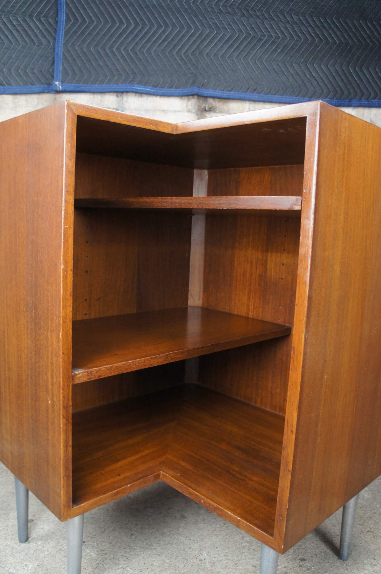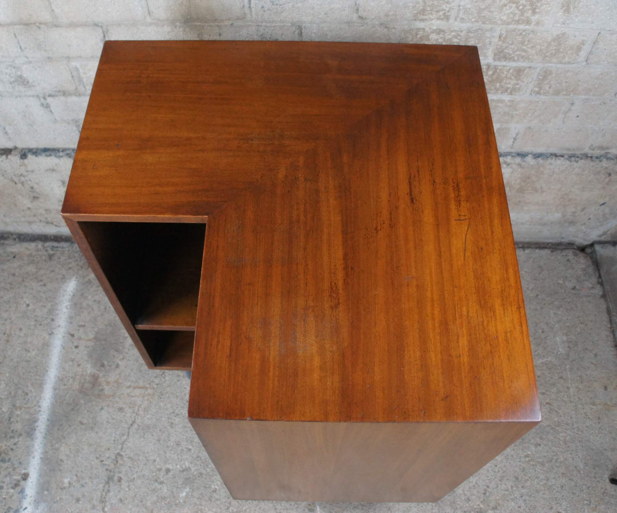Mid century modern Edward Wormley for Dunbar Furniture corner cabinet bookcase or record console. Made of walnut featuring modular cubist "L" shape form with five tapered metal legs.
