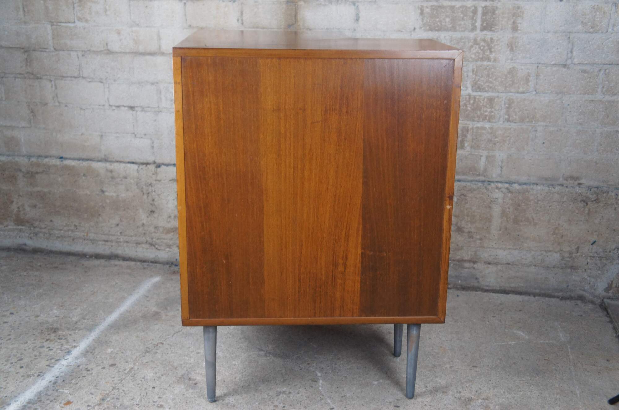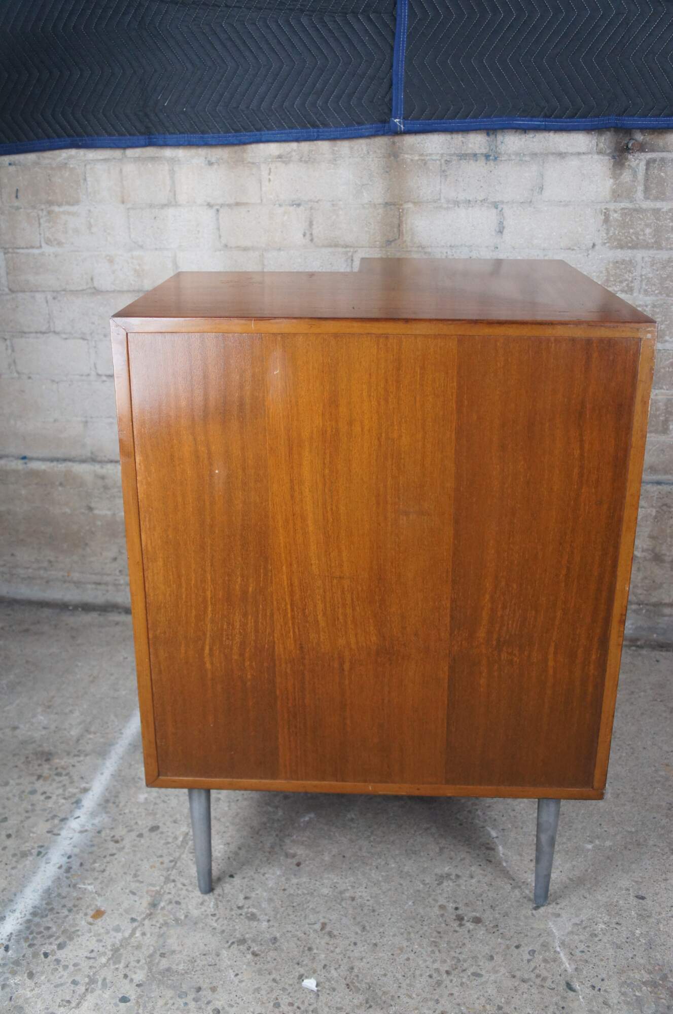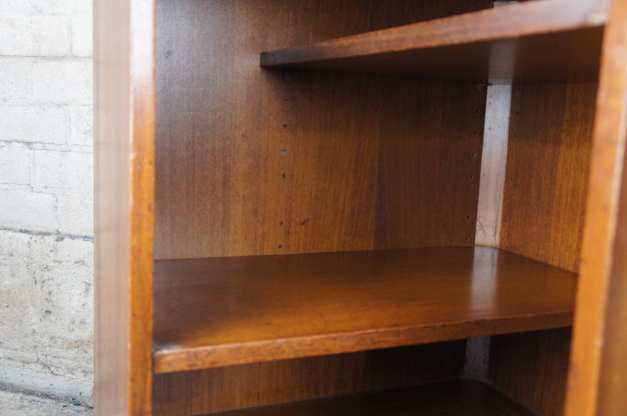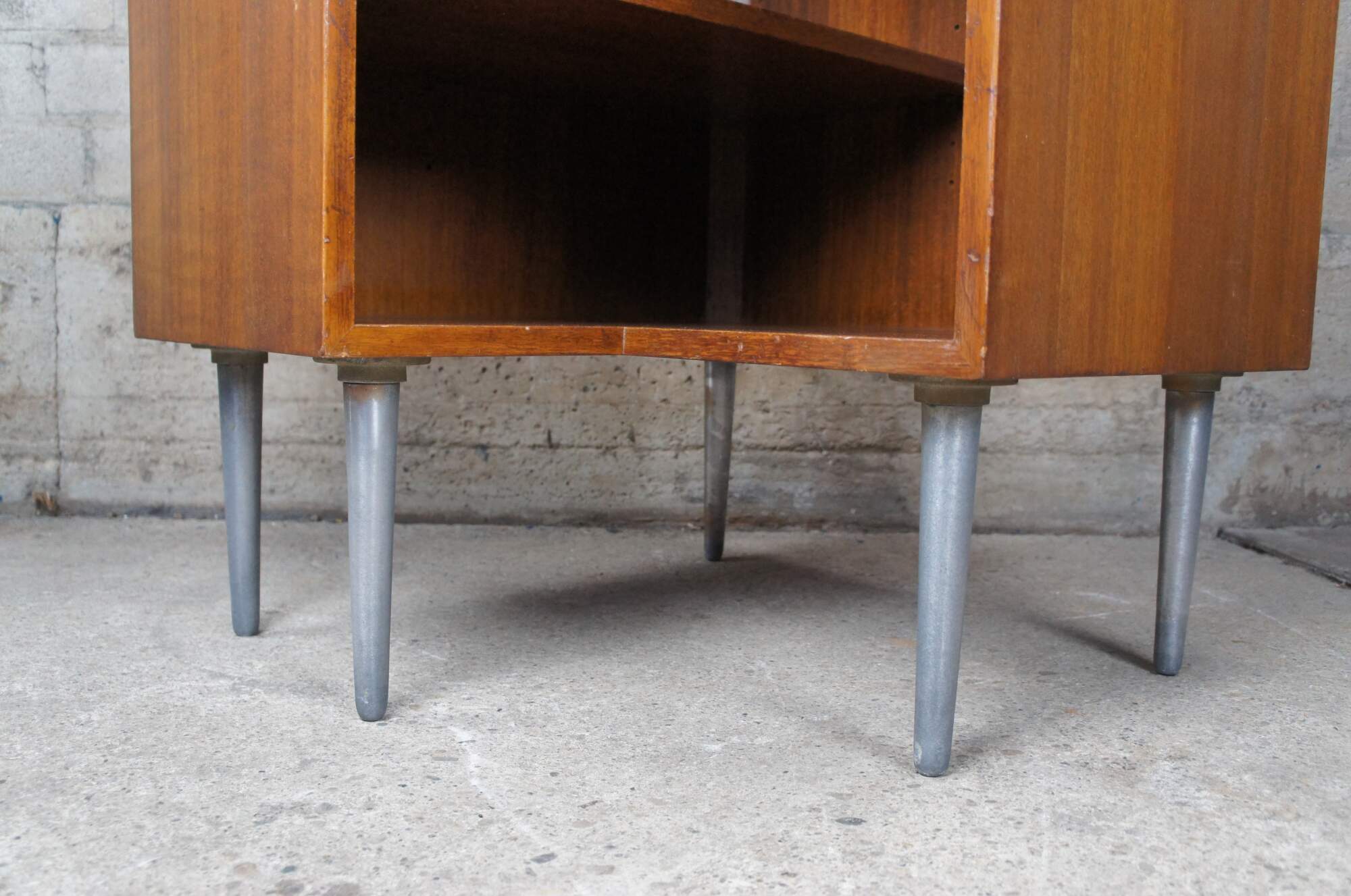 Mid century modern Edward Wormley for Dunbar Furniture corner cabinet bookcase or record console. Made of walnut featuring modular cubist "L" shape form with five tapered metal legs.
