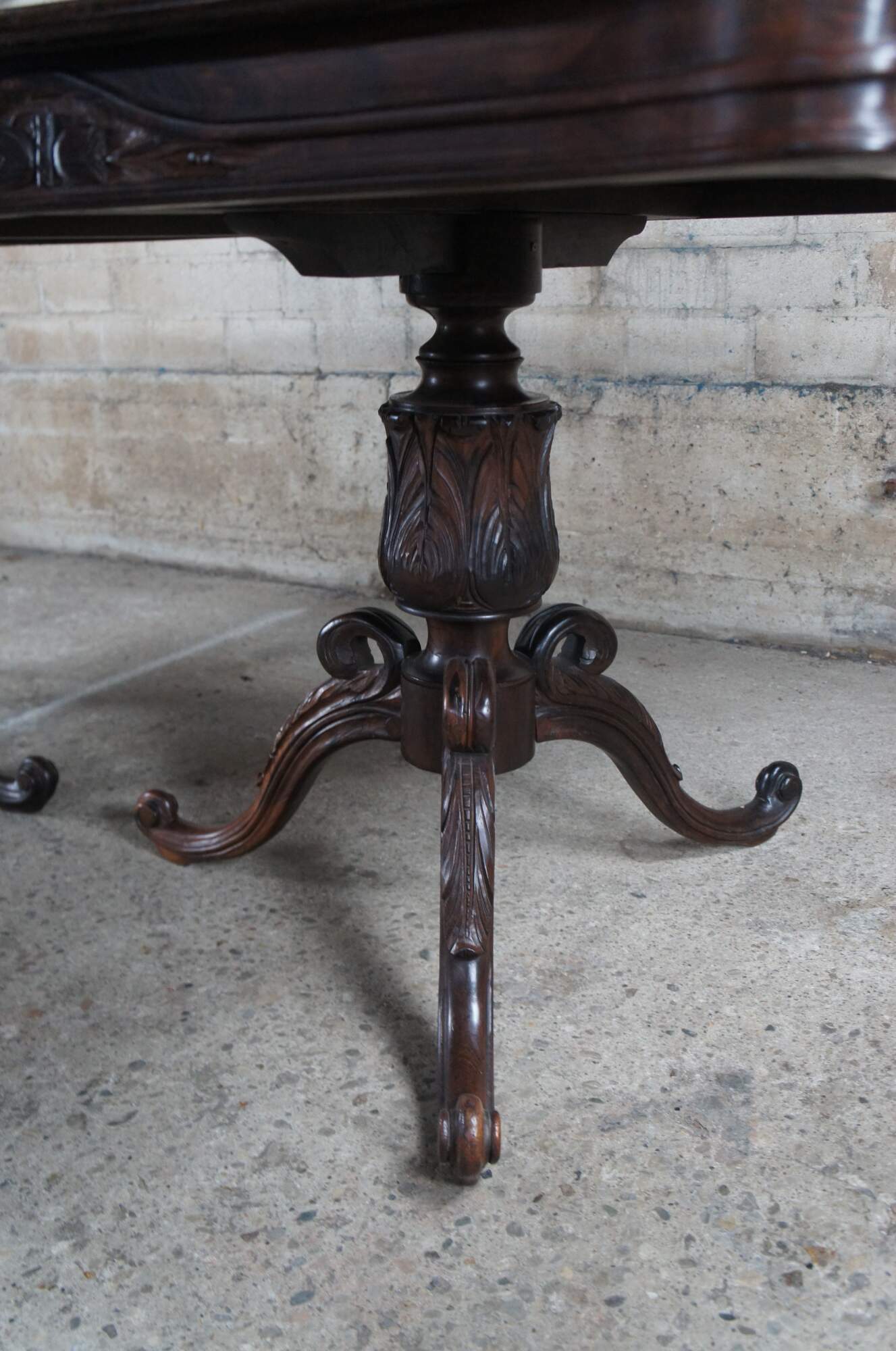 Mid century Brazilian Rosewood (Jacaranda) dining table, circa 1960s. Features rectangular serpentine form with double pedestal tri foot base, carved acanthus and floral motif and one extendable leaf.