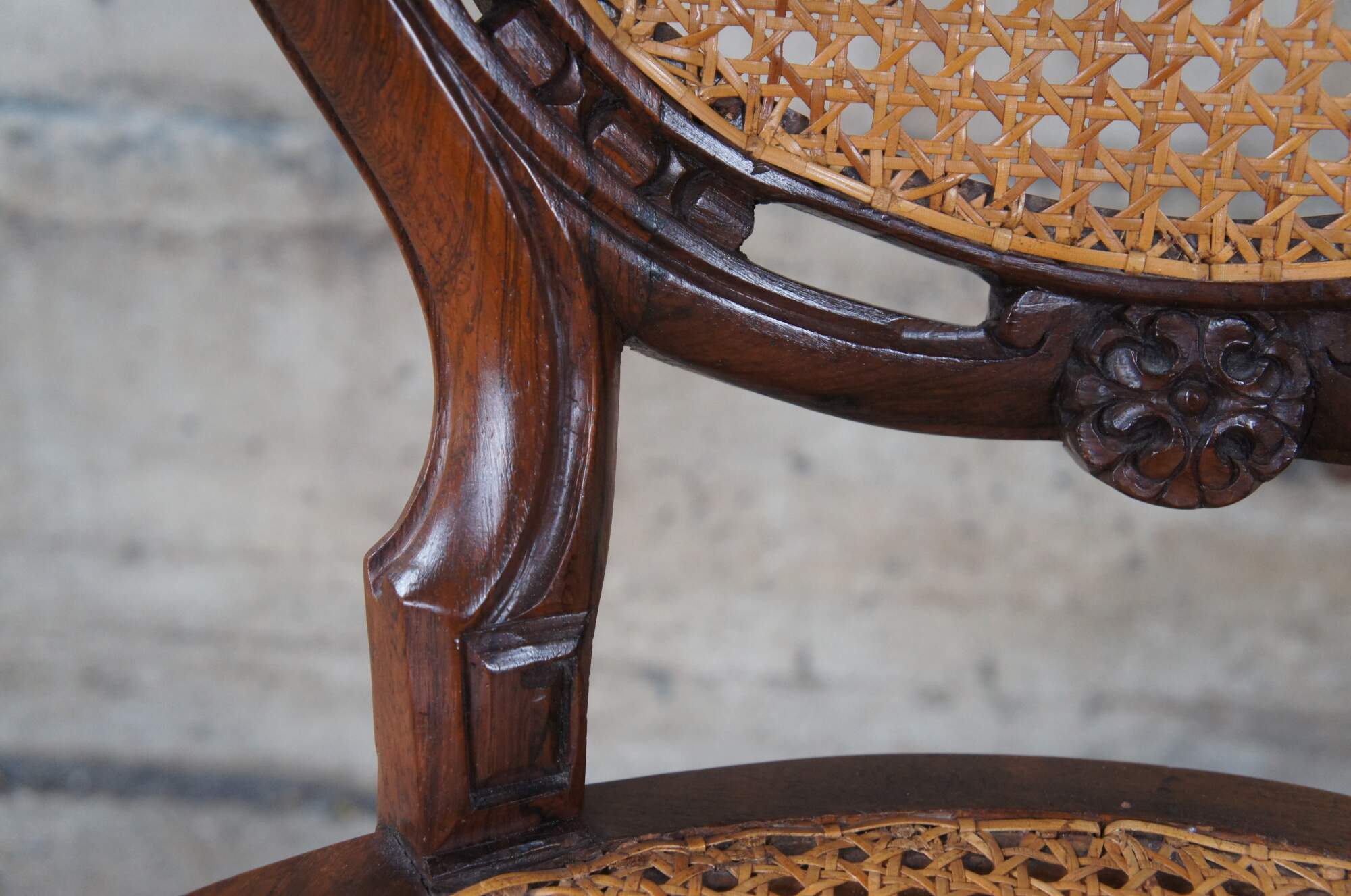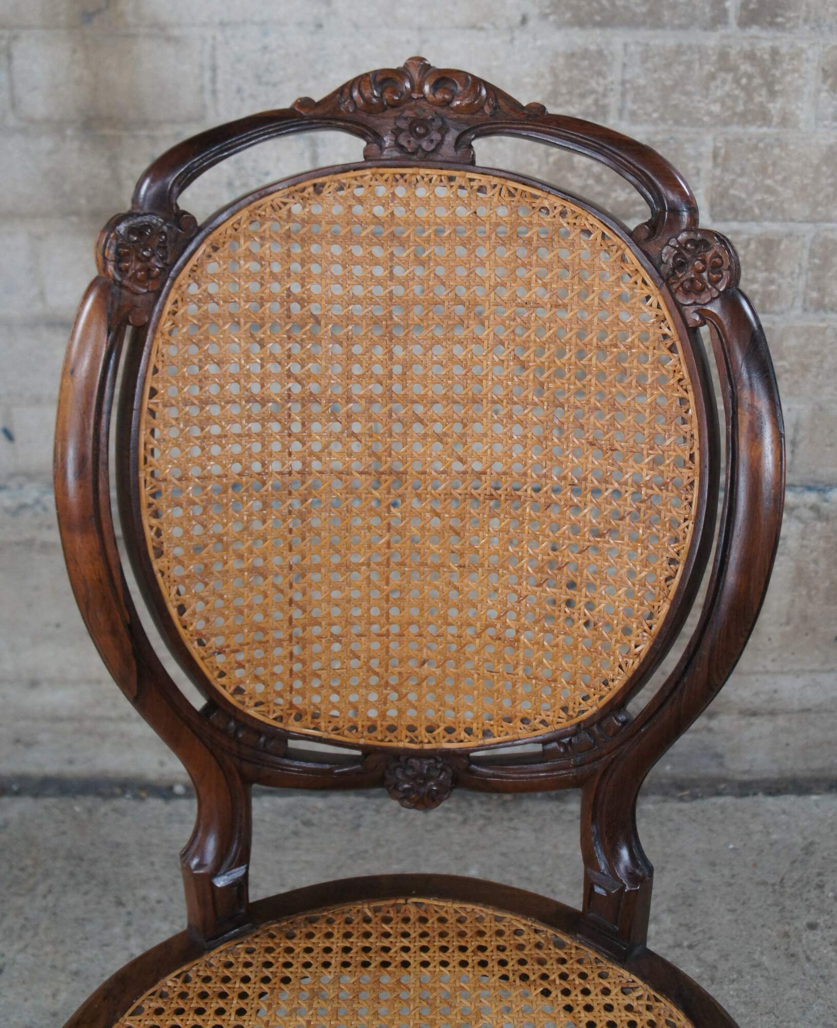 6 Mid 20th century Louis XV style balloon back dining chairs. Made from walnut with cane back and seat. Features a pierced and carved seat back over cabriole legs.