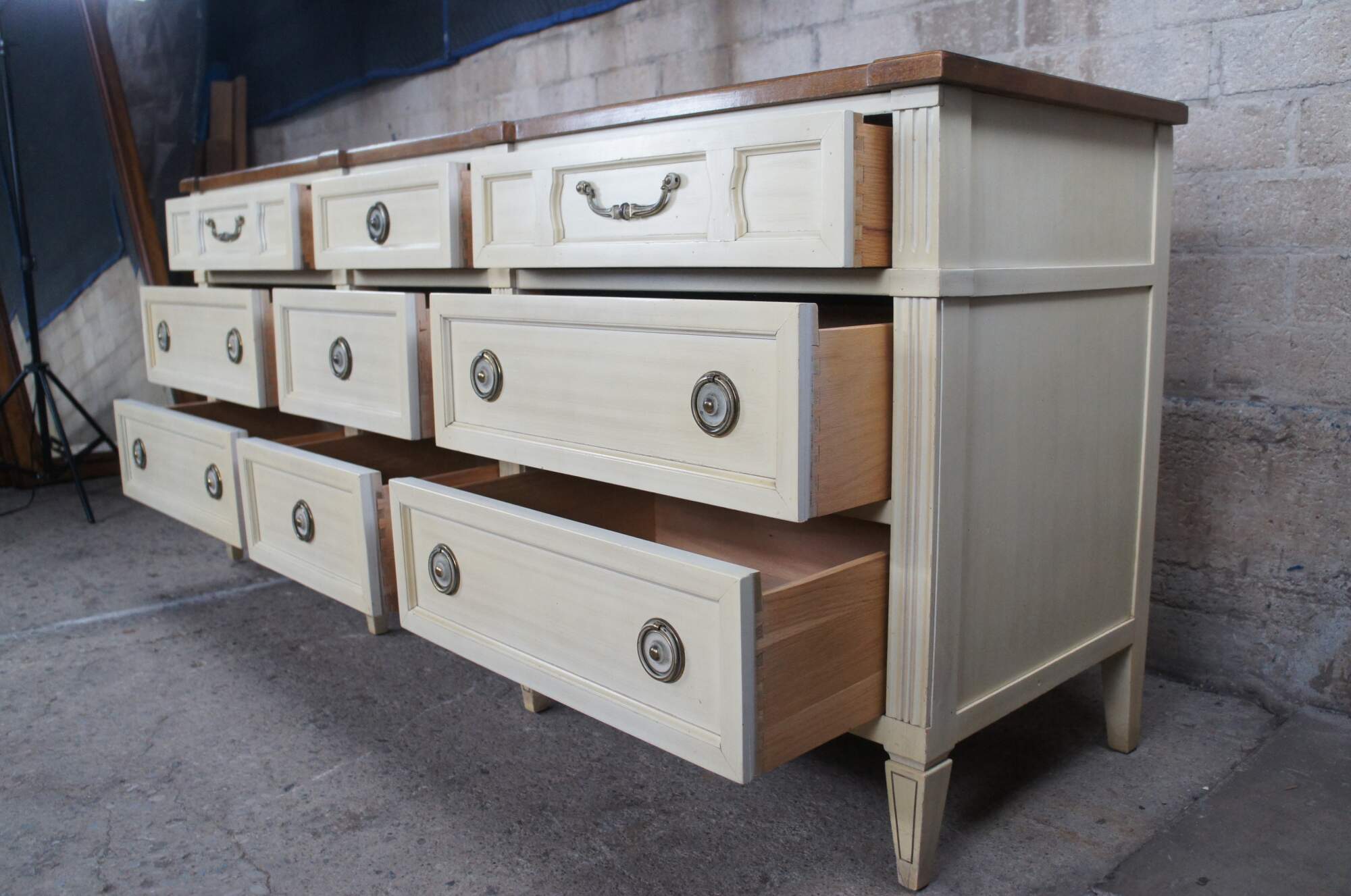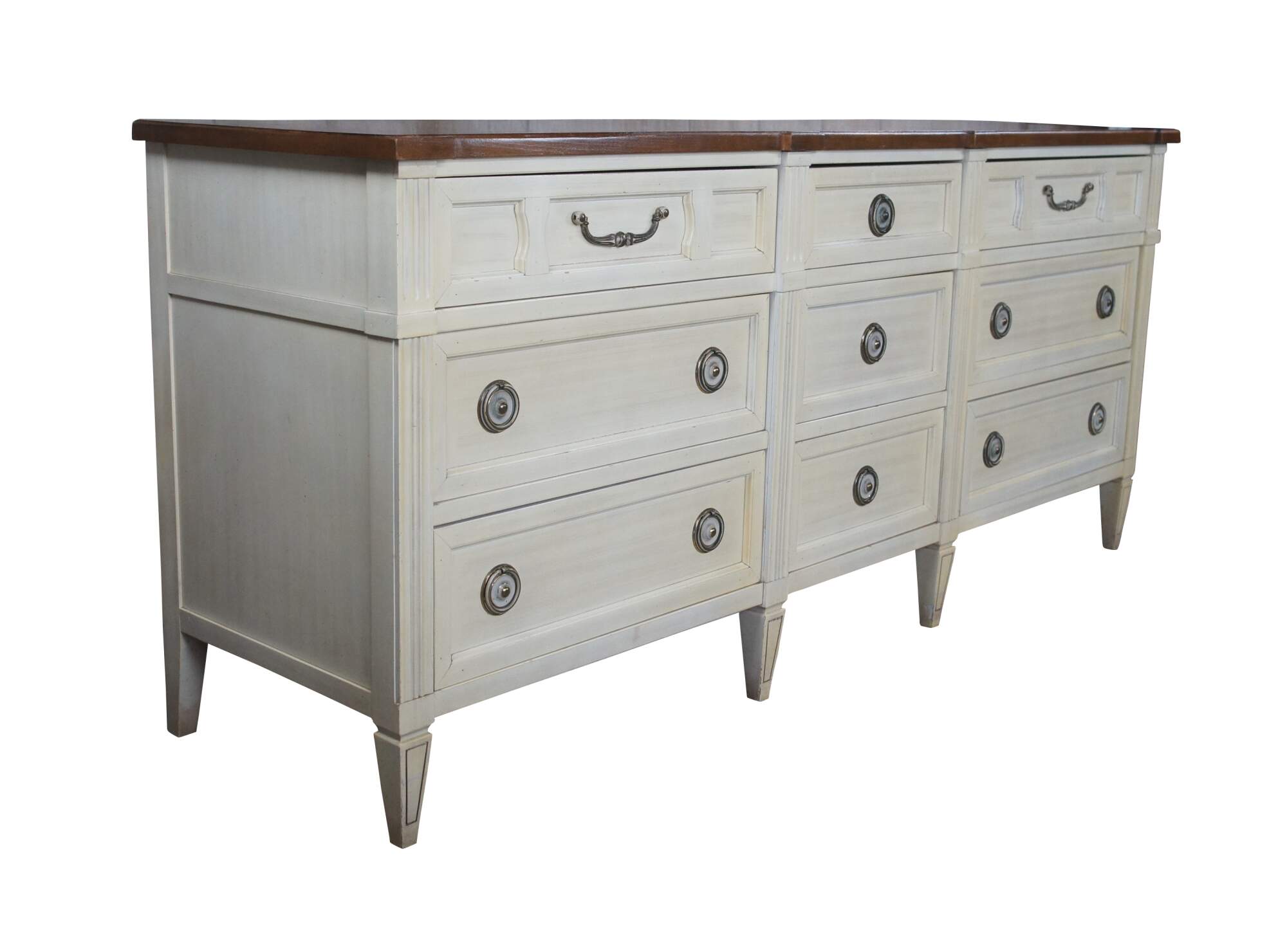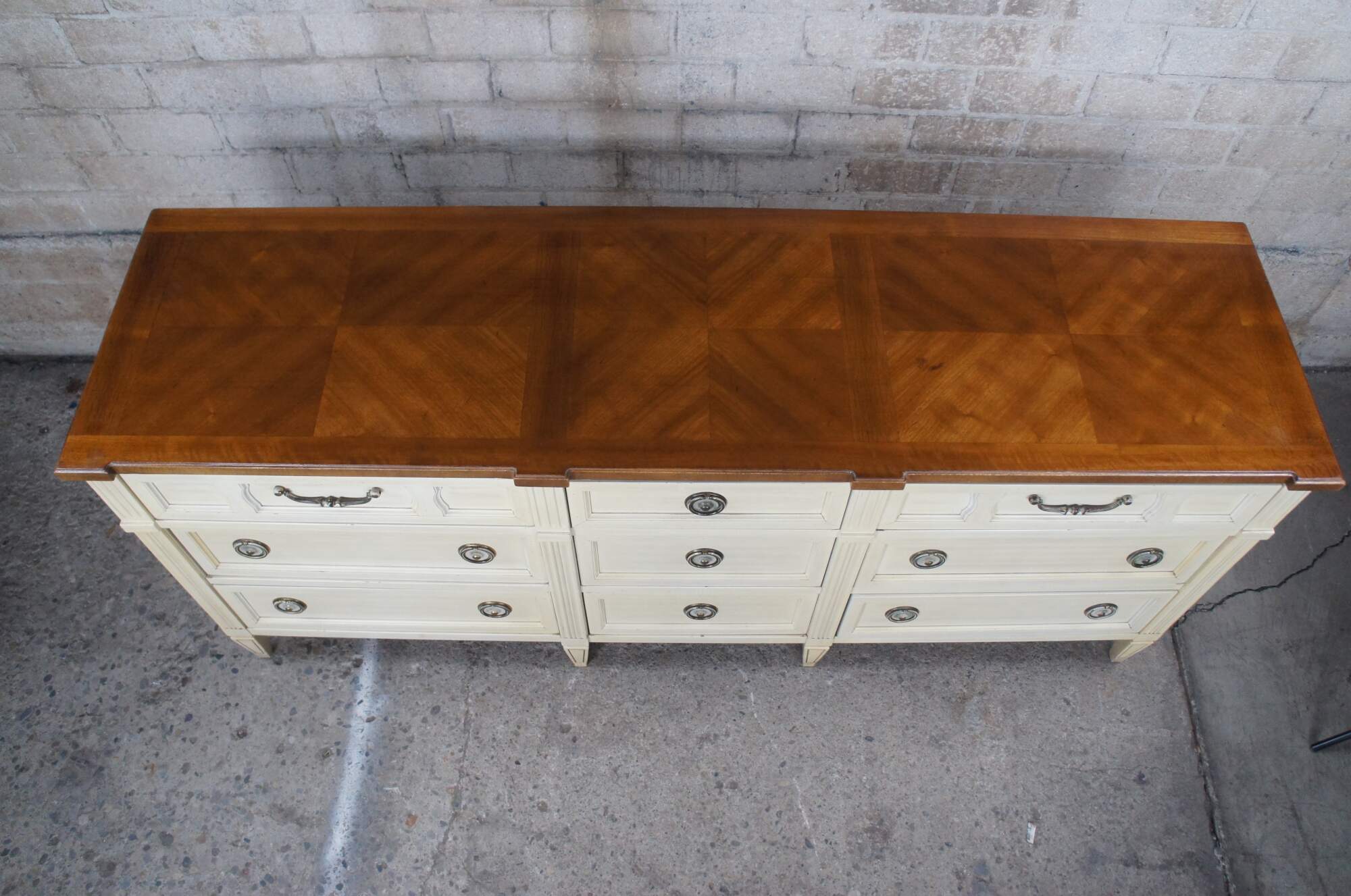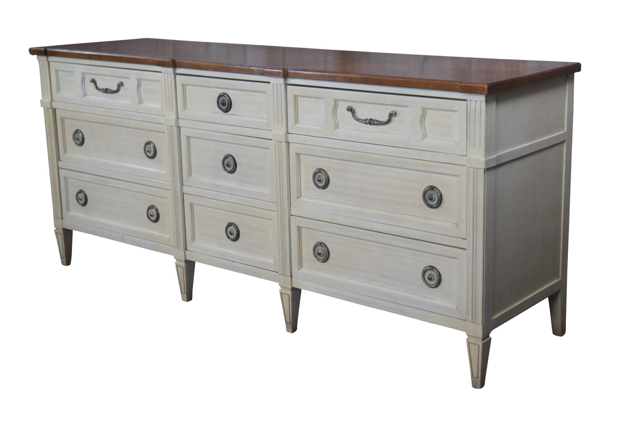 A charming dresser by American of Martinsville, circa 1960s. Traditional design drawing inspiration from Louis XVI with a French Provincial finish. A rectangular form made from walnut with a natural matchbook top over a case of nine drawers. Each drawer is made from oak with dovetailing and ornate brass hardware. The dresser has fluted stiles, panelled sides and is raised over square tapered feet. A heavy well built dresser made to stand the test of time. Marked along the back 6176-2 Dr Base. Upper right drawer bears the American of Martinsville stamp as well as a tag from the original purchase location ""Town House Fine Furniture, Akron, Ohio"". The chest could also be used as a dining buffet, sideboard or console table.