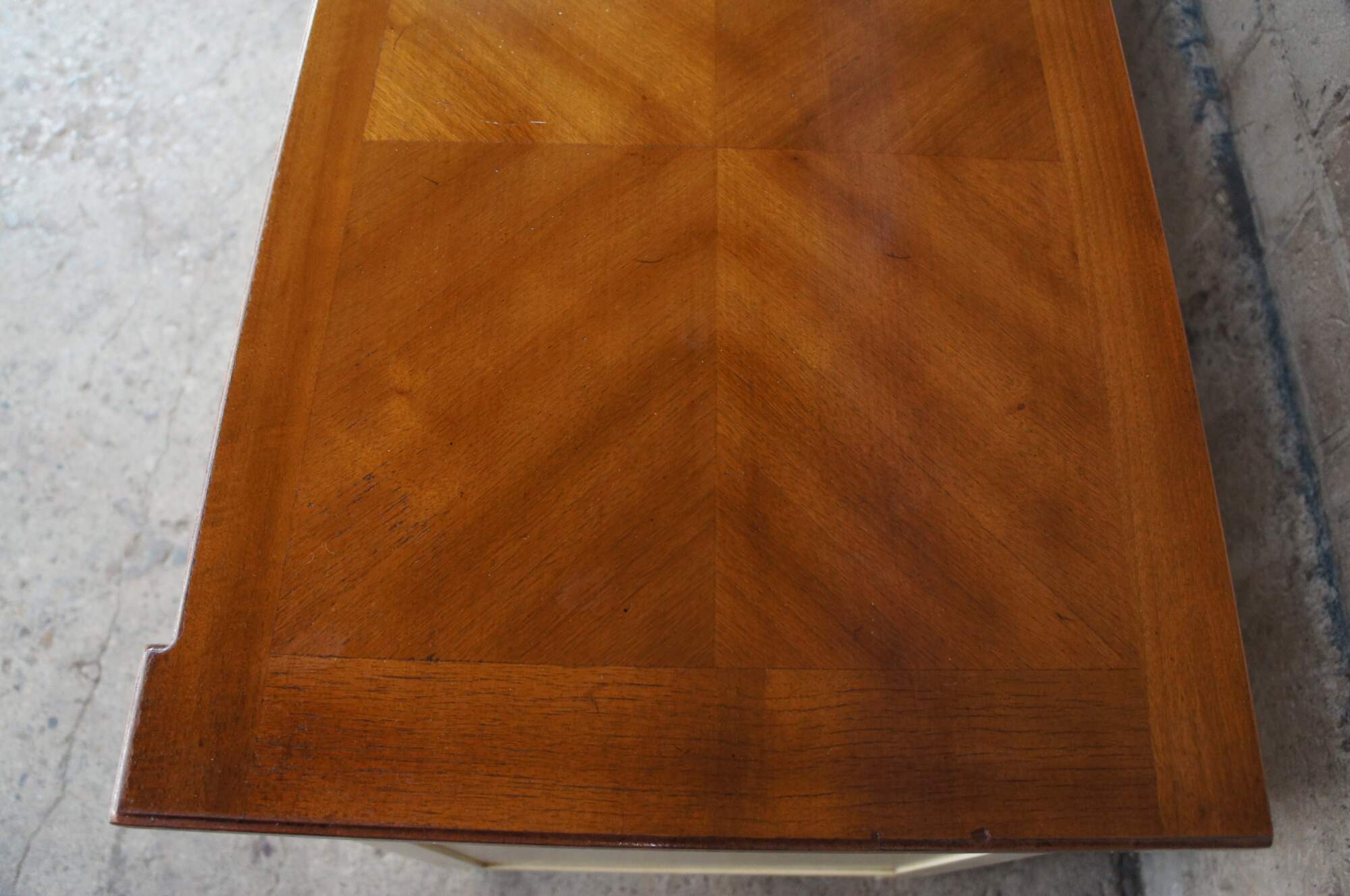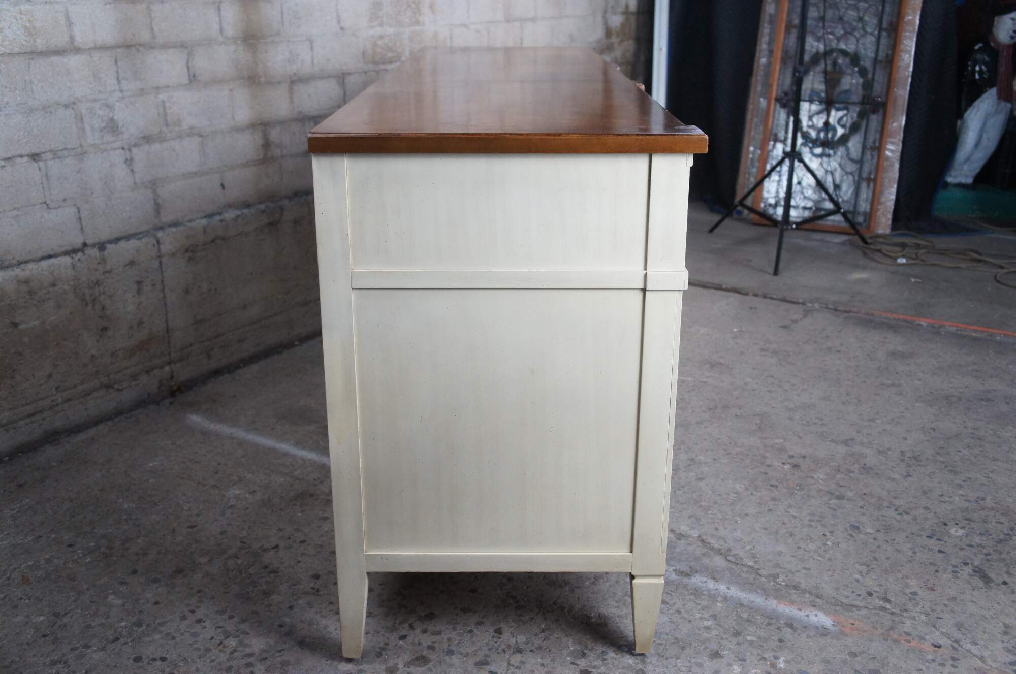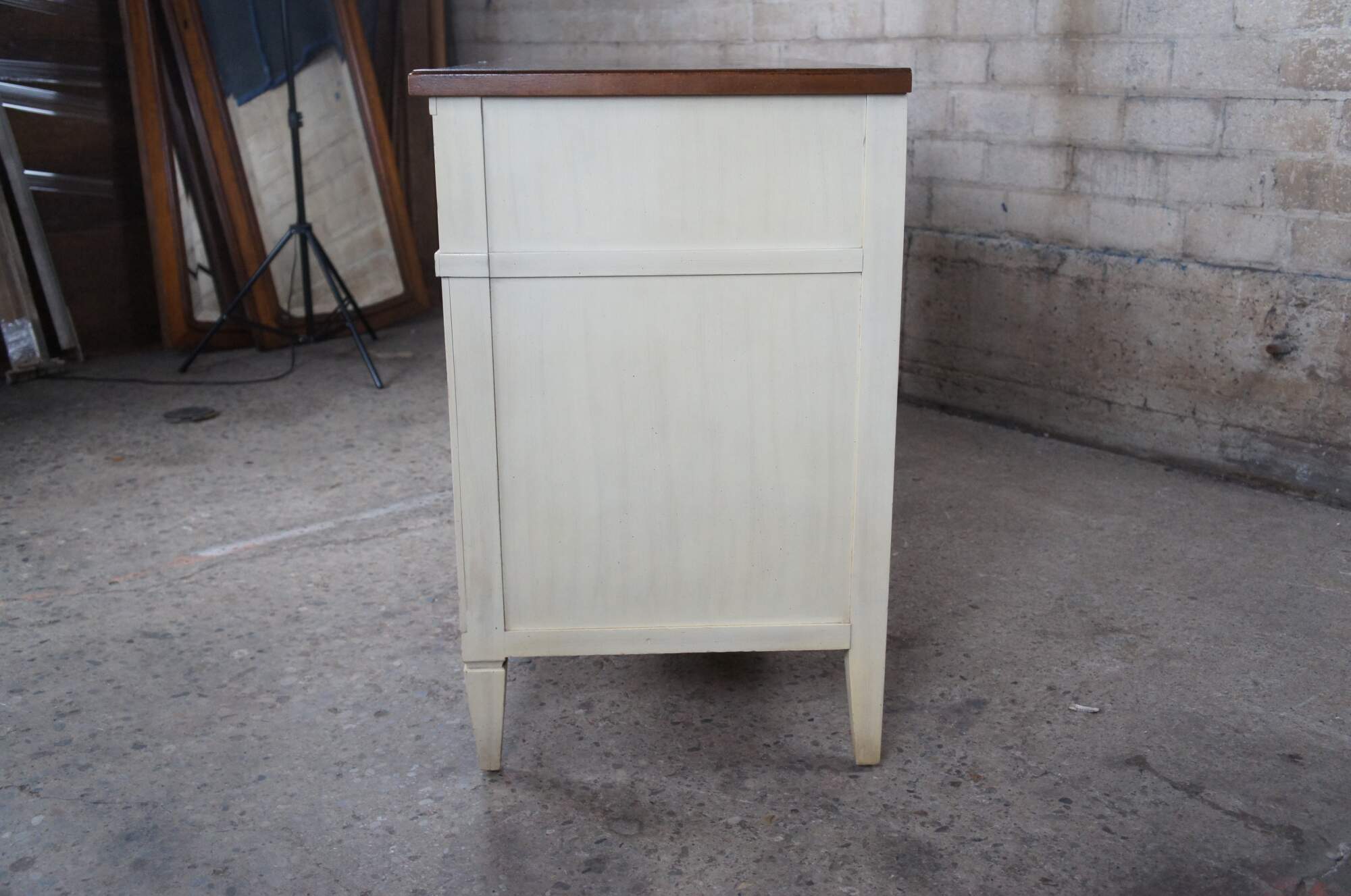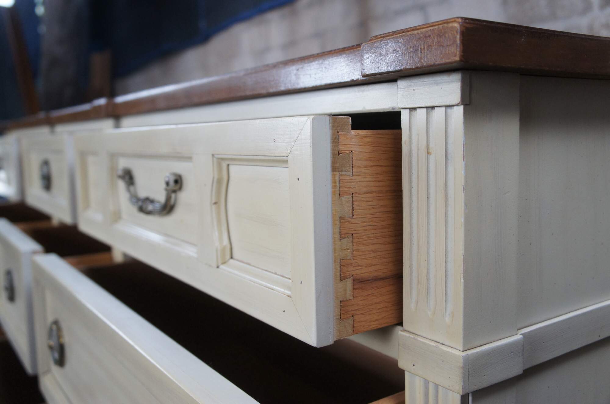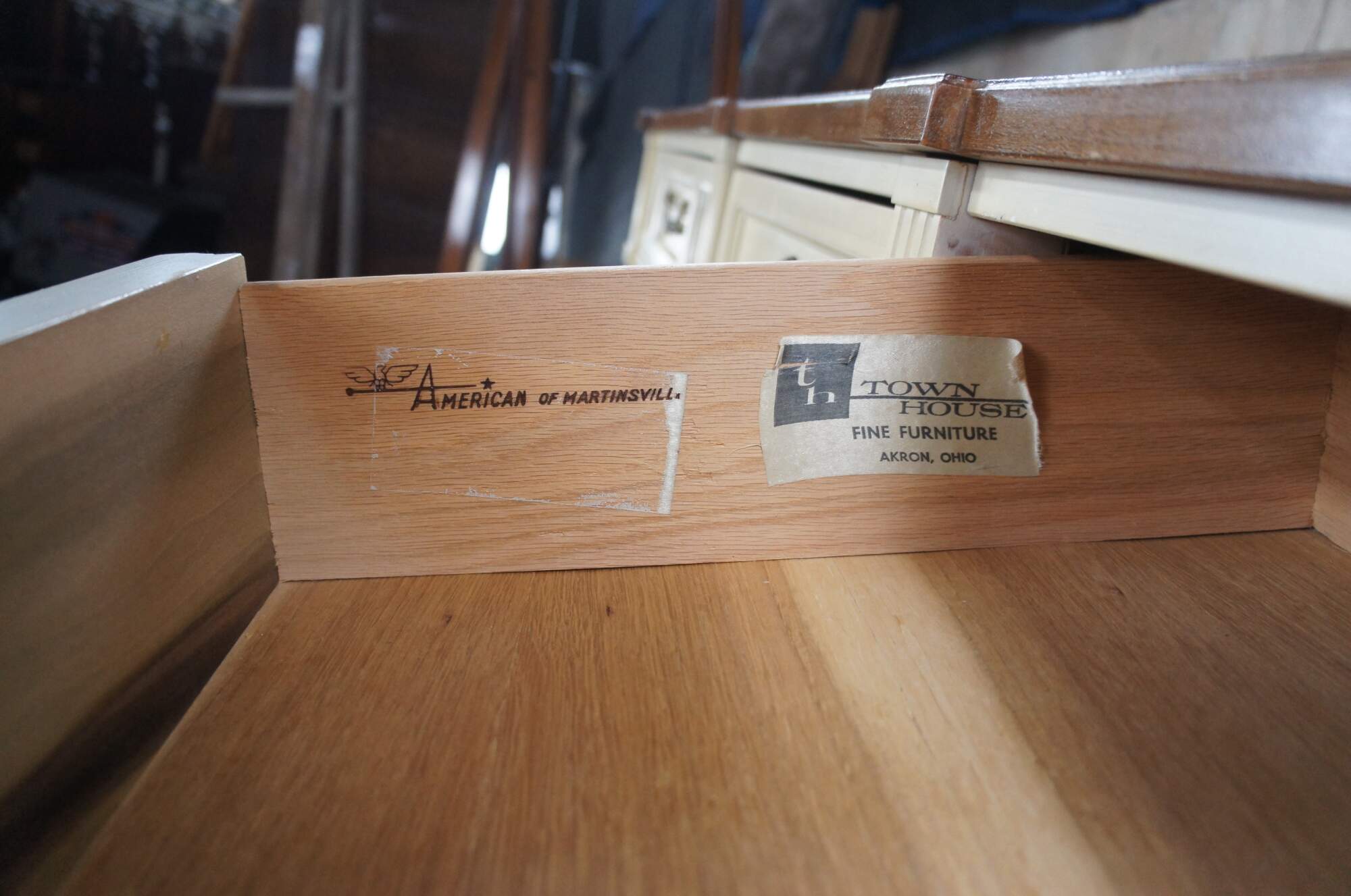A charming dresser by American of Martinsville, circa 1960s. Traditional design drawing inspiration from Louis XVI with a French Provincial finish. A rectangular form made from walnut with a natural matchbook top over a case of nine drawers. Each drawer is made from oak with dovetailing and ornate brass hardware. The dresser has fluted stiles, panelled sides and is raised over square tapered feet. A heavy well built dresser made to stand the test of time. Marked along the back 6176-2 Dr Base. Upper right drawer bears the American of Martinsville stamp as well as a tag from the original purchase location ""Town House Fine Furniture, Akron, Ohio"". The chest could also be used as a dining buffet, sideboard or console table.