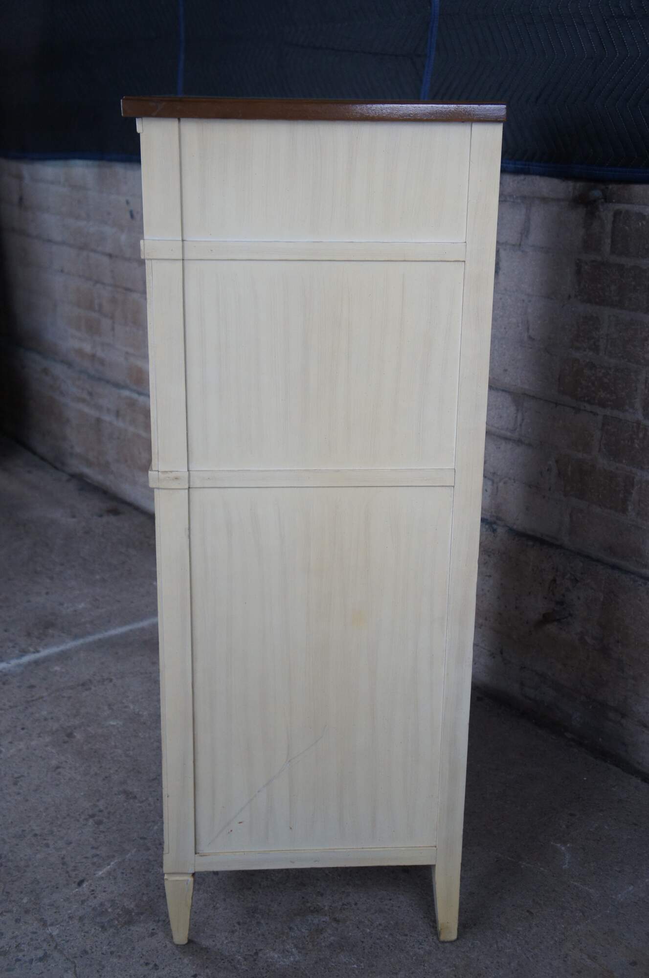 A charming tallboy dresser / Chest of drawers by American of Martinsville, circa 1960s. Traditional design drawing inspiration from Louis XVI with a French Provincial finish. A rectangular form made from walnut with a natural matchbook top over a case of sixdrawers. Each drawer is made from oak with dovetailing and ornate brass hardware. The dresser has fluted stiles, panelled sides and is raised over square tapered feet. A heavy well built dresser made to stand the test of time. Marked along the back 6170-4 Chest. Upper right drawer bears the American of Martinsville stamp. Originally purchased from Town House Fine Furniture in Akron, Ohio.
