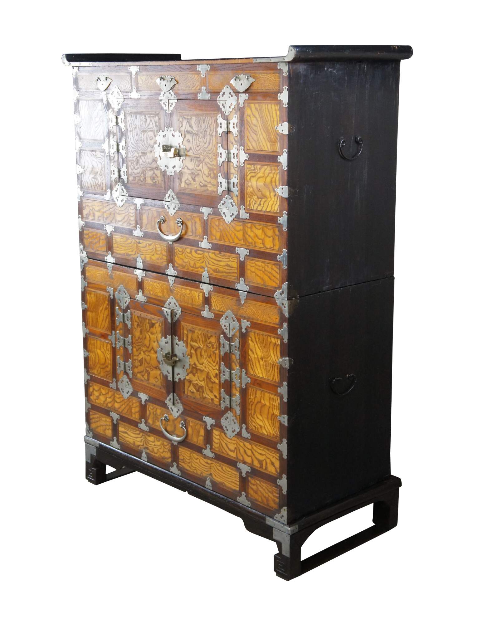 20th Century Korean Tansu Nong Bandaji tallboy wedding chests or cabinet made of elmwood featuring a two tone wood grain with ornate brass accents.
